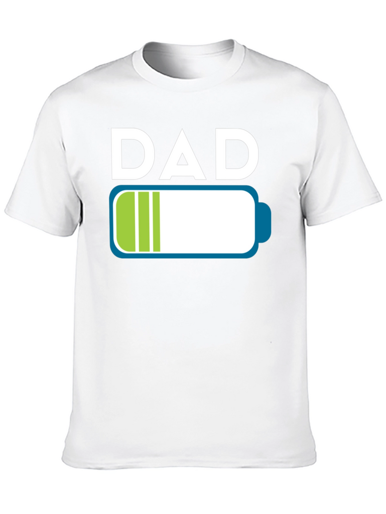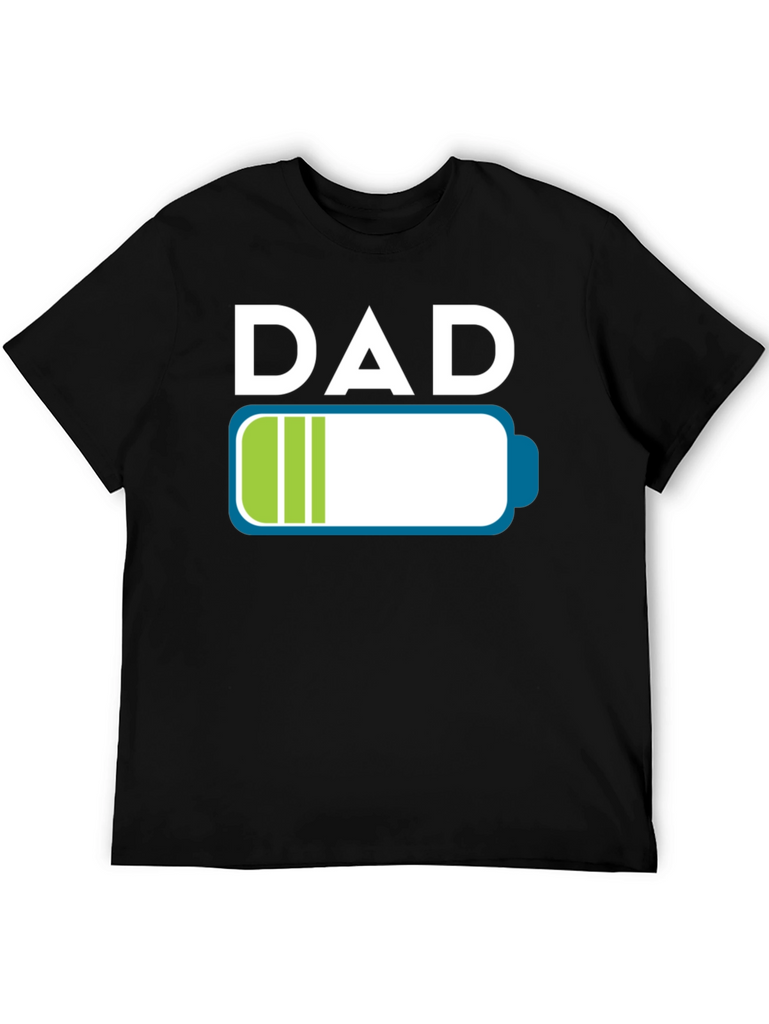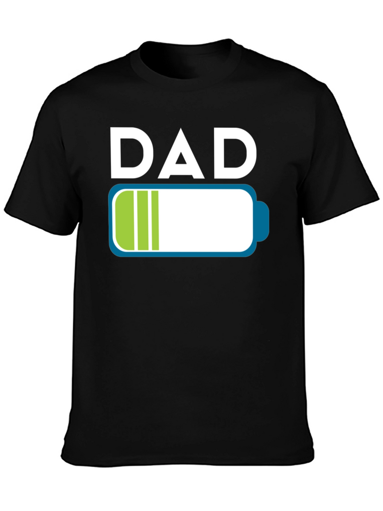 This black t-shirt features the word "DAD" printed above a graphic of a nearly depleted battery. The battery icon has a light blue outline and a green partially filled interior, suggesting a playful take on parental energy levels. The shirt seems to be made of a comfortable cotton blend, perfect for casual wear. Ideal as a humorous and relatable gift for Father's Day, birthdays, or just to show appreciation for a dad's hard work. It's a fun way to express a common sentiment among parents with a lighthearted design that anyone can appreciate.