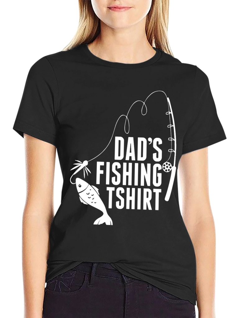This black t-shirt features a playful design perfect for any fishing enthusiast dad. The graphic showcases a white fishing rod, line, lure, and a fish, accompanied by the text "DAD'S FISHING TSHIRT" in bold, white lettering. Made from what appears to be soft and comfortable cotton, this tee is ideal for casual wear, fishing trips, or as a fun gift for Father's Day or birthdays. The classic crew neck and short sleeves ensure a relaxed fit, making it a versatile addition to any wardrobe. Show off your love for fishing with this stylish and humorous tee!