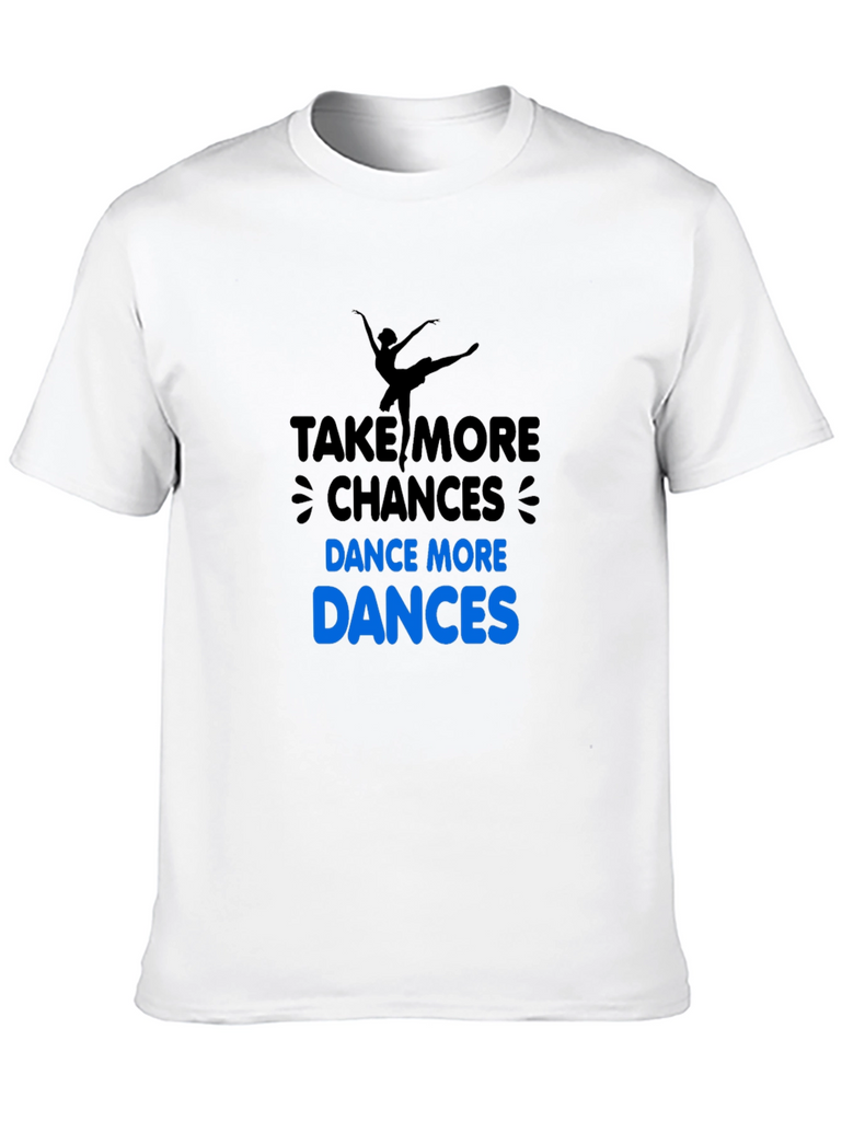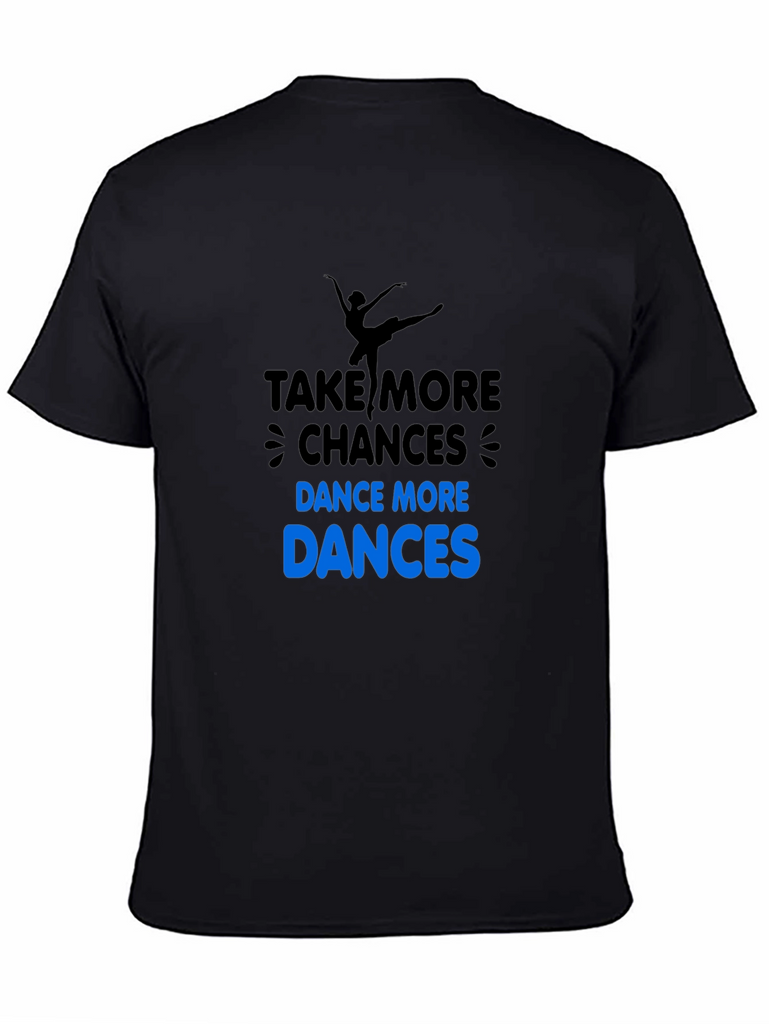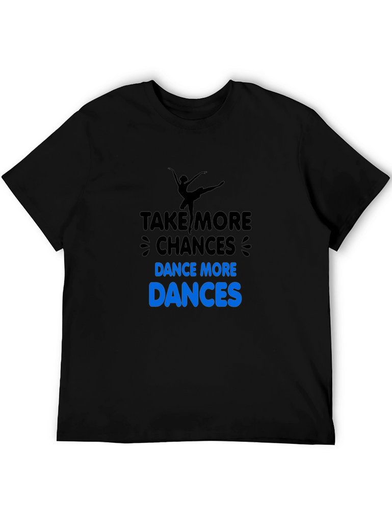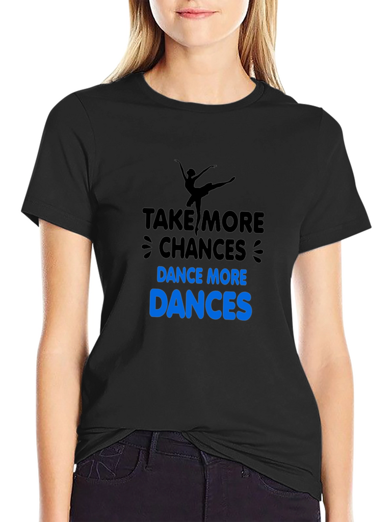 Show off your love of dance with this stylish black t-shirt. The shirt features the inspirational message "Take More Chances Dance More Dances", with the word "Dances" highlighted in a vibrant blue color. Above the words is a black silhouette of a dancer striking a pose. Made from comfortable, breathable fabric, this tee is perfect for dance class, casual outings, or simply expressing your passion for movement. Whether you're a seasoned dancer or just starting, this shirt is a great way to inspire yourself and others to embrace the joy of dance and take more chances in life. Add it to your wardrobe today!