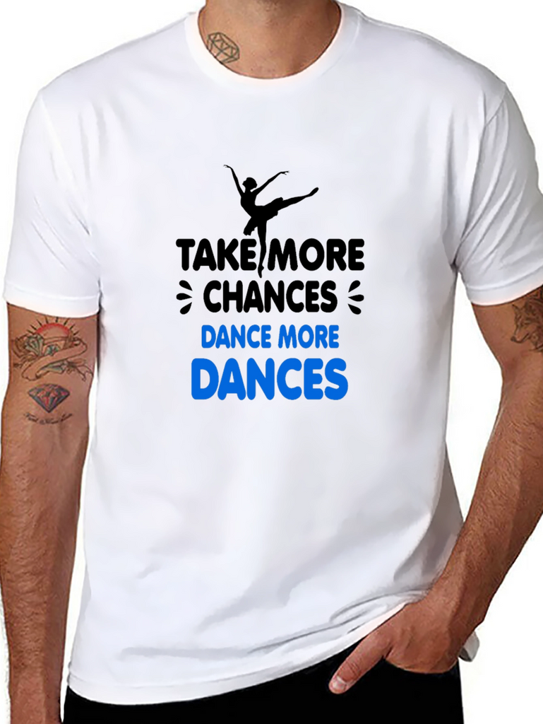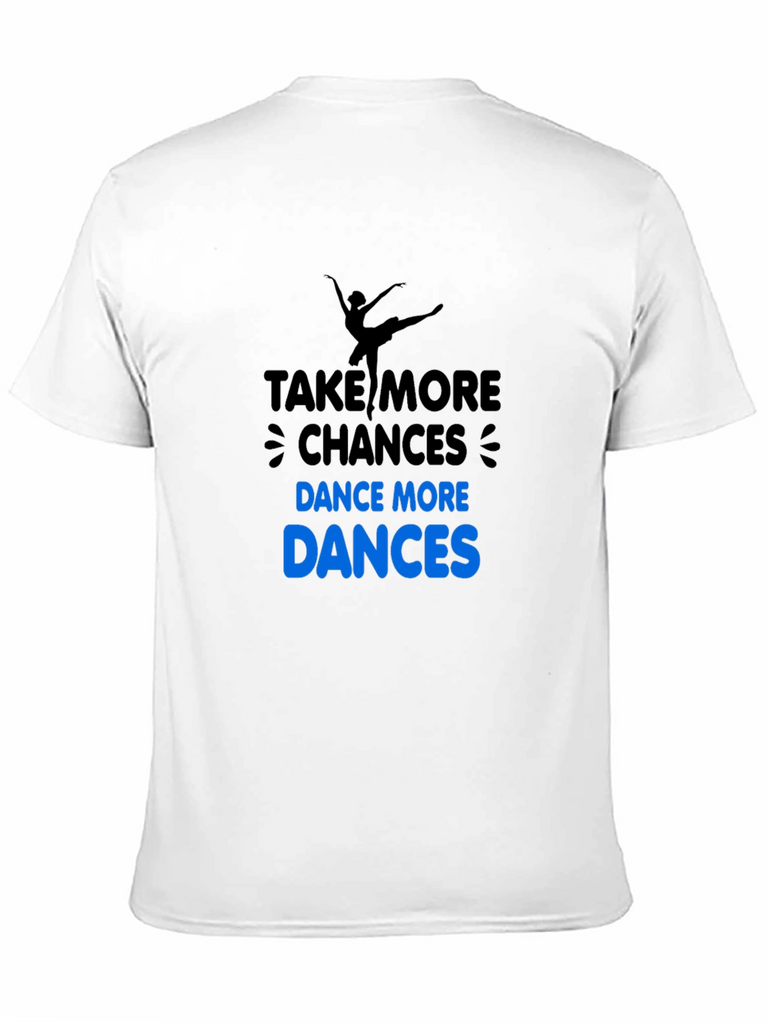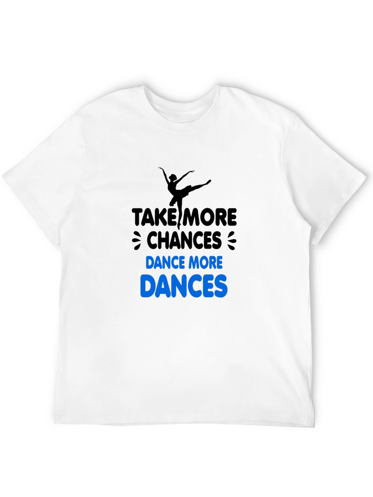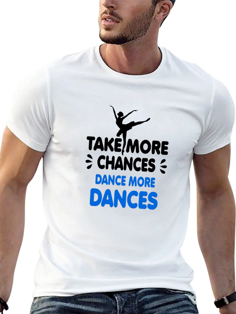 Show off your love of dance with this stylish black t-shirt. The shirt features the inspirational message "Take More Chances Dance More Dances", with the word "Dances" highlighted in a vibrant blue color. Above the words is a black silhouette of a dancer striking a pose. Made from comfortable, breathable fabric, this tee is perfect for dance class, casual outings, or simply expressing your passion for movement. Whether you're a seasoned dancer or just starting, this shirt is a great way to inspire yourself and others to embrace the joy of dance and take more chances in life. Add it to your wardrobe today!