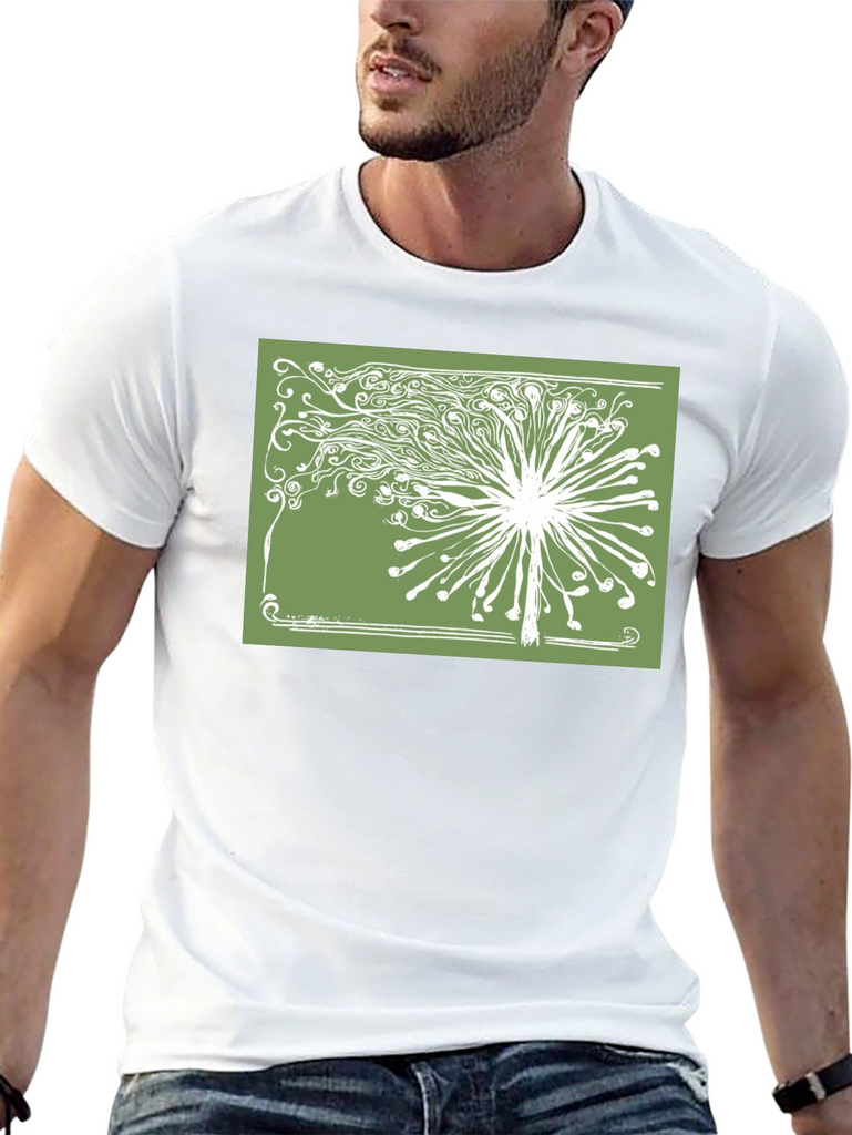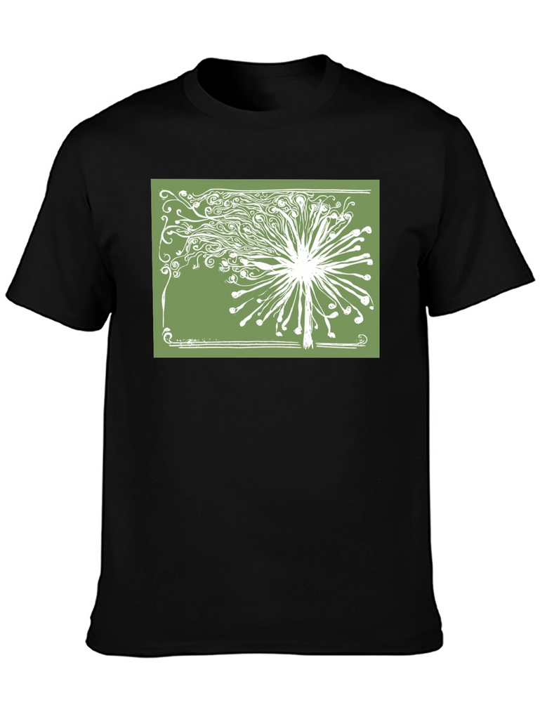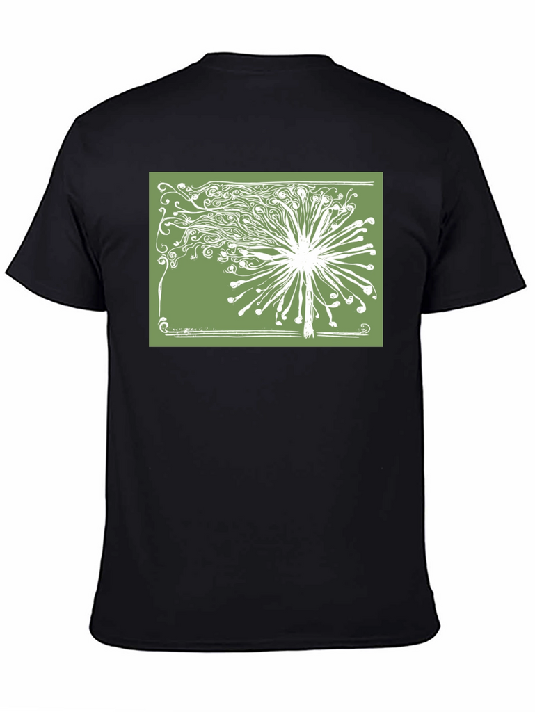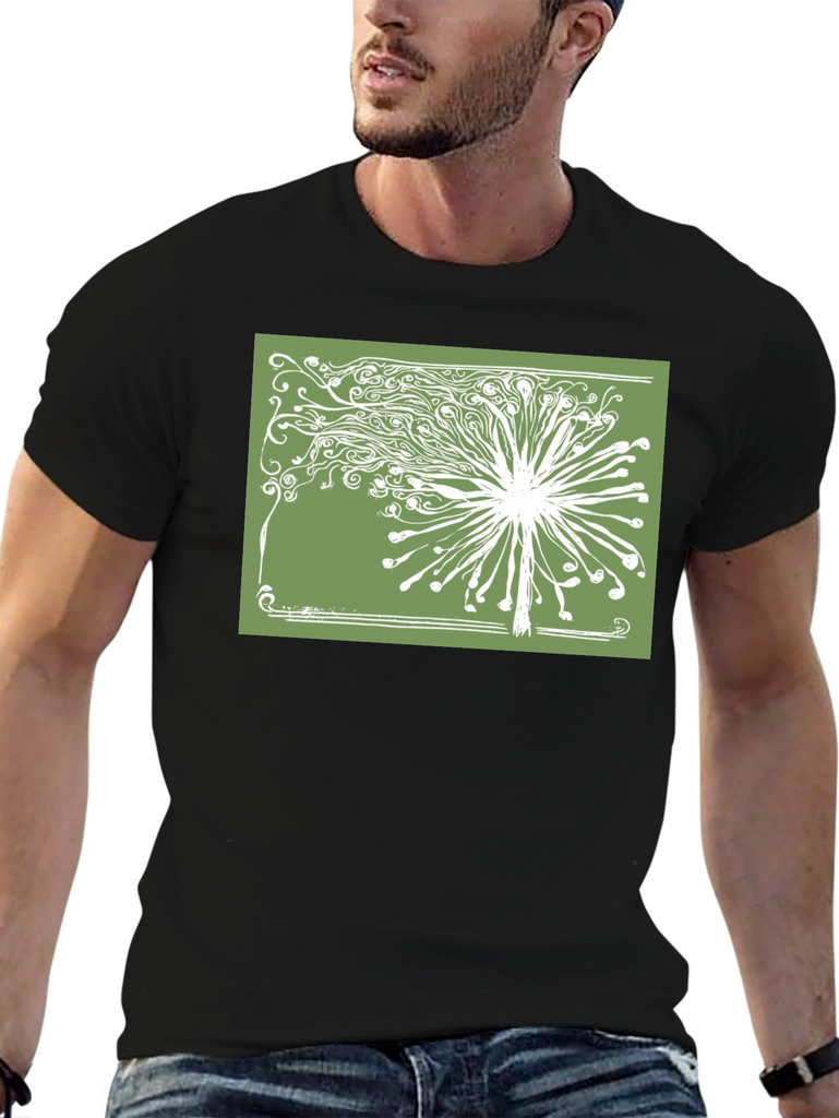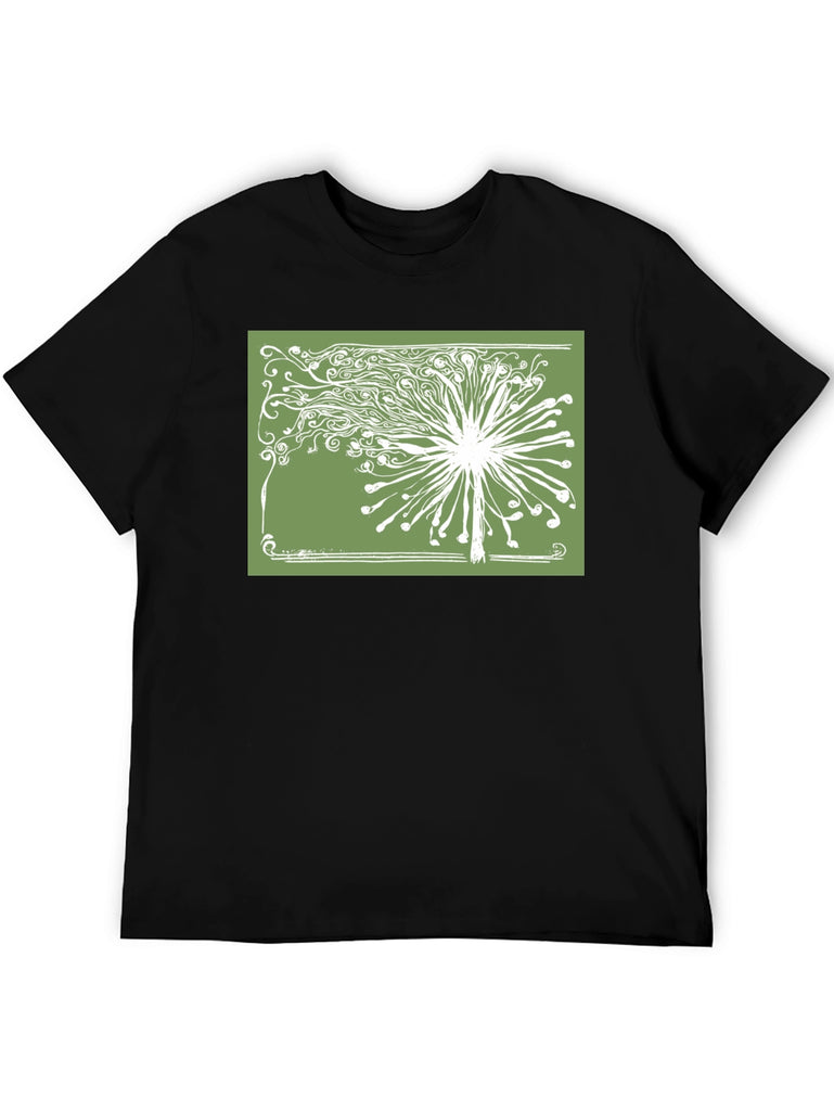 Show off your unique style with this eye-catching graphic tee! Featuring a detailed white dandelion illustration on a soft green rectangle. This striking design is printed on a classic black t-shirt. The shirt appears to be made of soft, comfortable material perfect for casual wear. It's versatile enough to pair with jeans, shorts, or your favorite bottoms. Express your individuality with this standout tee, great for everyday wear or as a special gift!