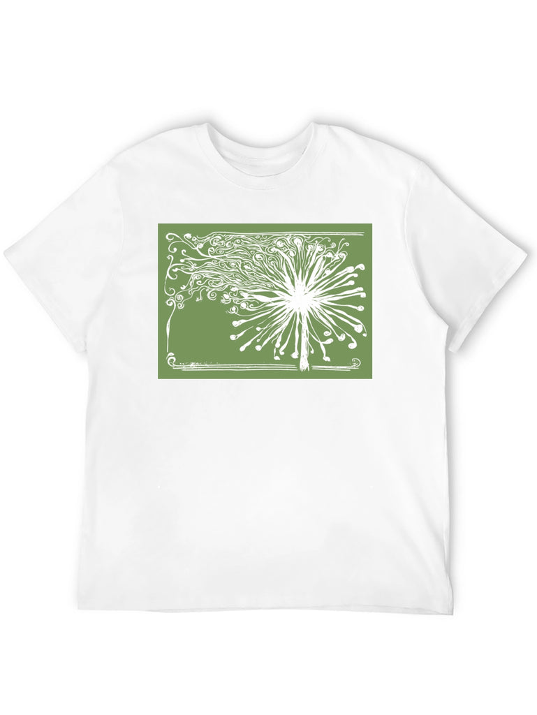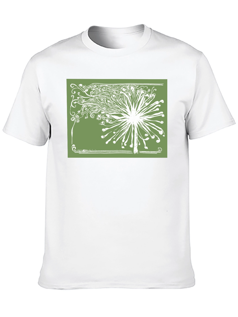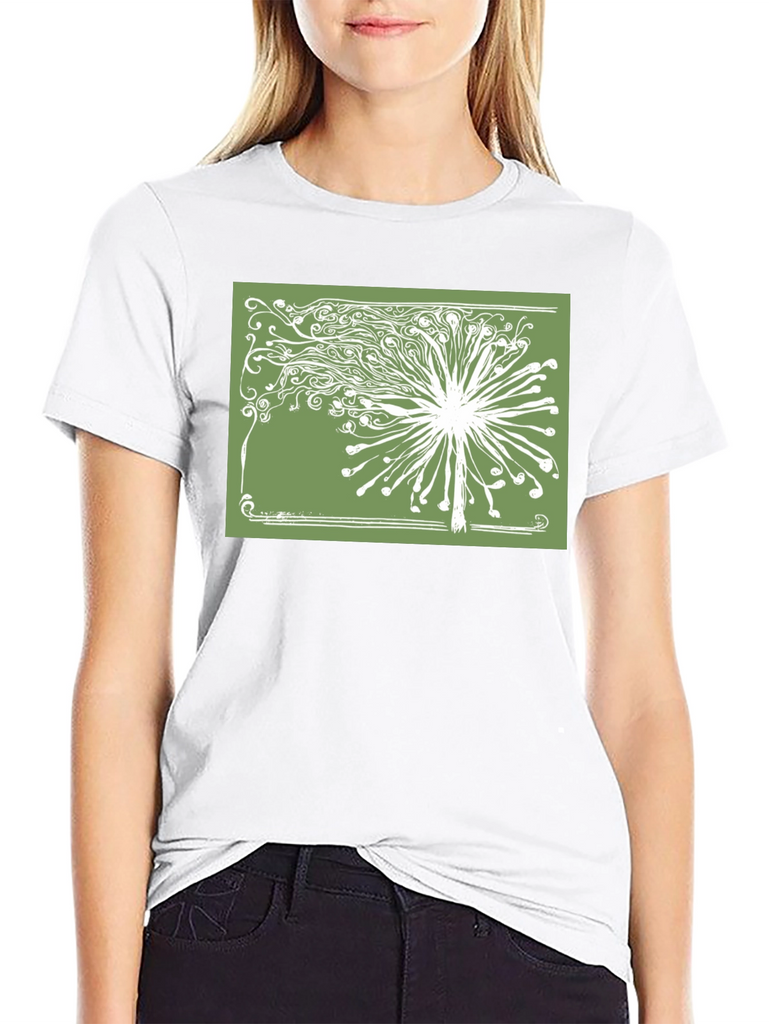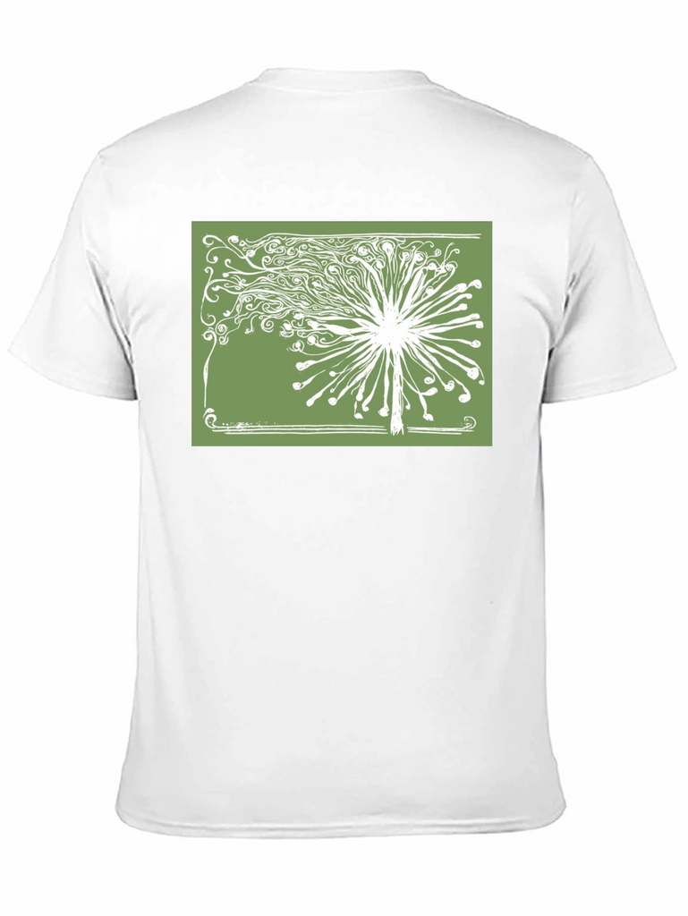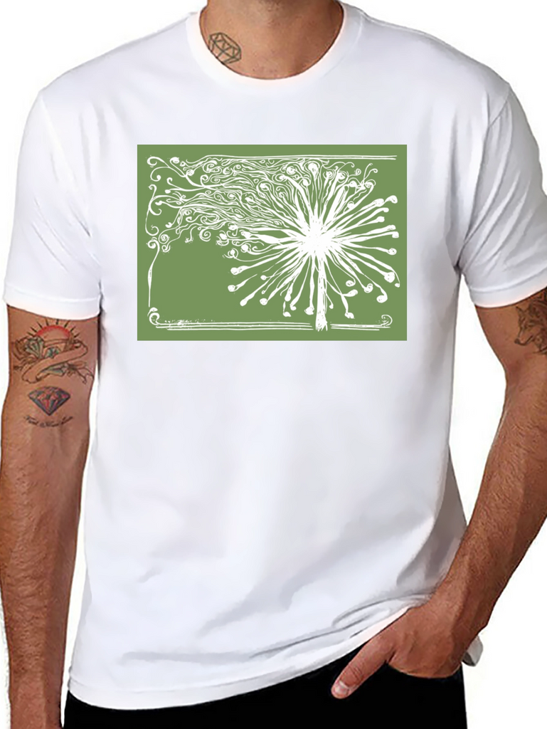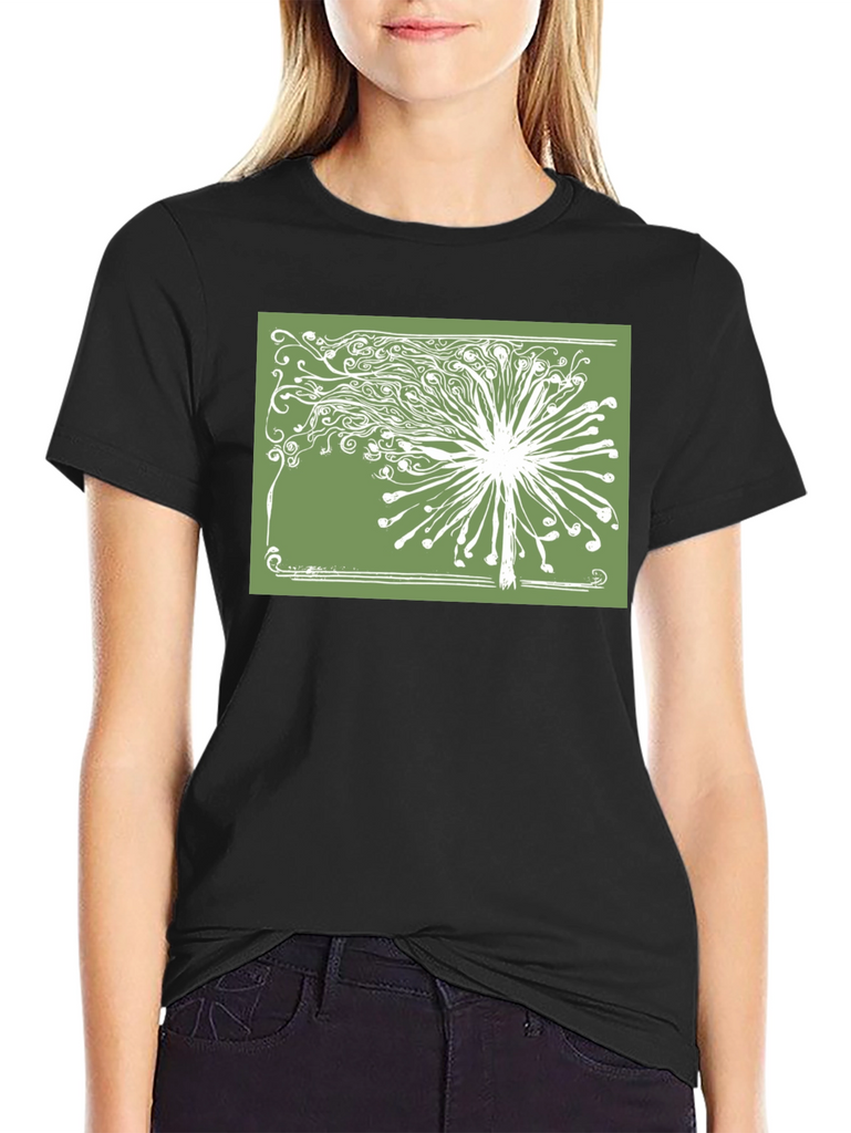 Show off your unique style with this eye-catching graphic tee! Featuring a detailed white dandelion illustration on a soft green rectangle. This striking design is printed on a classic black t-shirt. The shirt appears to be made of soft, comfortable material perfect for casual wear. It's versatile enough to pair with jeans, shorts, or your favorite bottoms. Express your individuality with this standout tee, great for everyday wear or as a special gift!