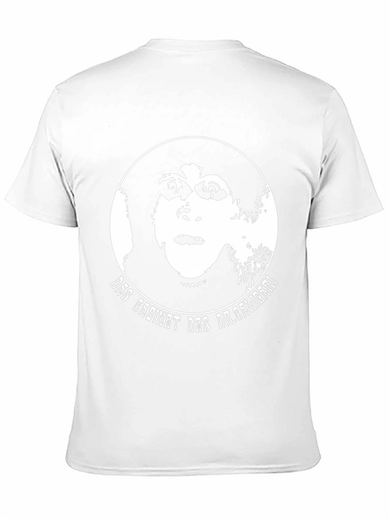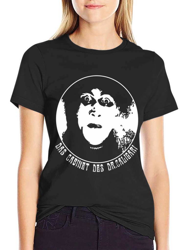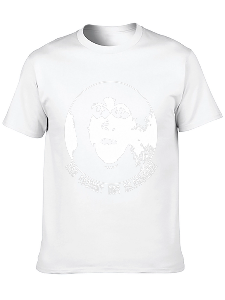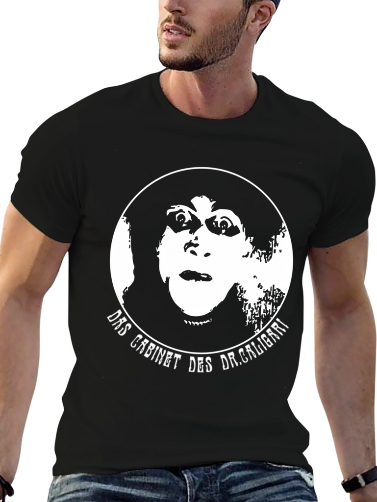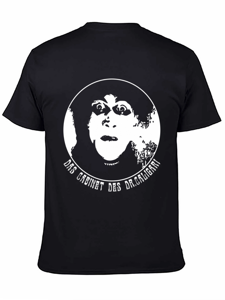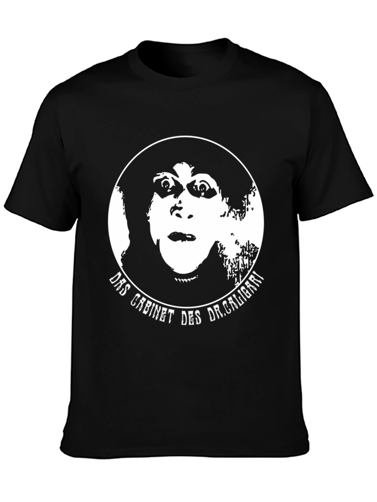 This black t-shirt features a striking graphic of a shocked face from the classic film "Das Cabinet des Dr. Caligari." Encased in a white circle, the dramatic design is a nod to the iconic German Expressionist masterpiece. The shirt is made from what appears to be soft, breathable cotton, ensuring both comfort and style. The bold design makes it a great conversation starter, perfect for film buffs and those with an appreciation for vintage cinema. Wear it casually or dress it up, this t-shirt adds a unique touch to any outfit. A must-have for fans of cult cinema!