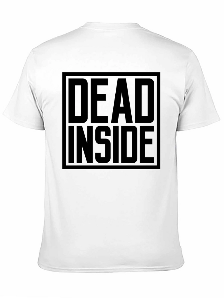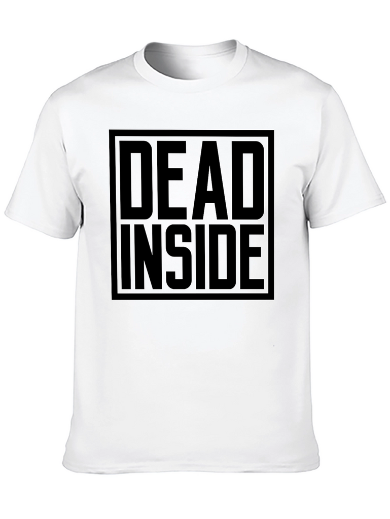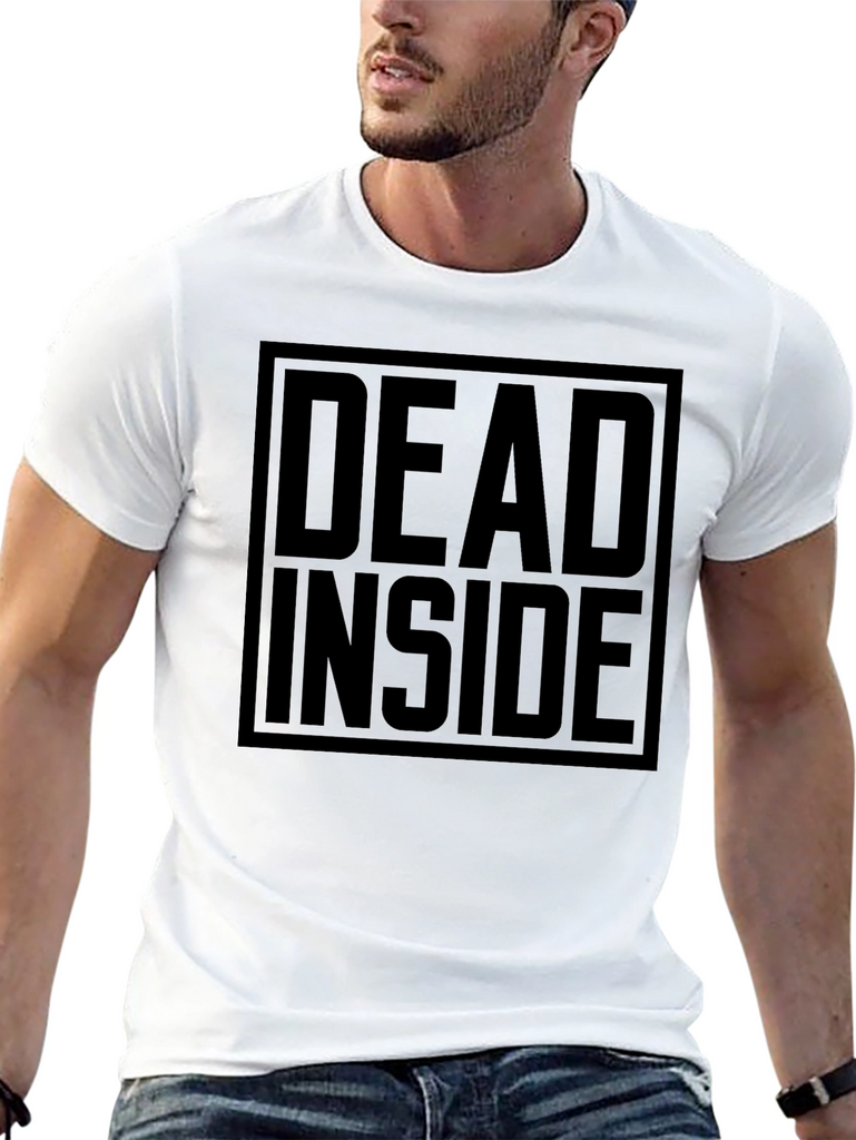 This black t-shirt features a bold graphic design with the words "DEAD INSIDE" printed in a blocky, rectangular format. The design gives off a modern and slightly edgy look. Made from a soft-looking fabric, this unisex tee appears comfortable and durable, suitable for everyday wear. Its classic fit and short sleeves make it versatile for various casual occasions. Pair it with jeans or shorts for a relaxed, cool style, perfect for expressing your unique personality or as a quirky gift for someone with a dark sense of humor.