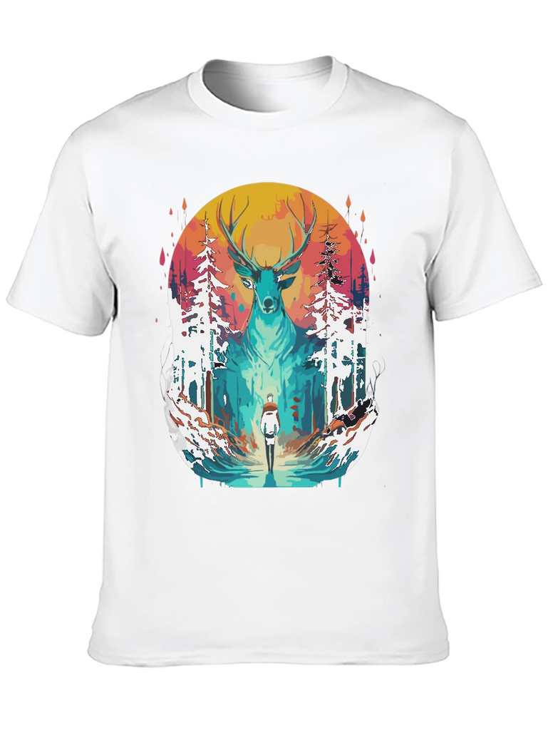 Showcase your unique style with this eye-catching black t-shirt. The shirt features a vivid graphic print of a majestic deer in a surreal forest setting. The design incorporates vibrant colors and intricate details, making it a standout piece. Crafted from a soft and comfortable fabric, this tee is perfect for everyday wear. Whether you're heading to a casual outing or just lounging at home, this shirt is sure to turn heads. Pair it with jeans, shorts, or your favorite bottoms for a relaxed yet fashionable look. Elevate your wardrobe with this must-have graphic tee.