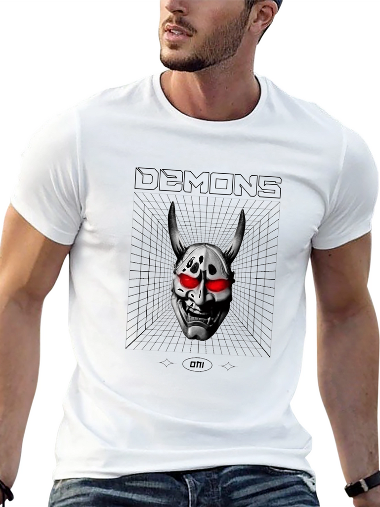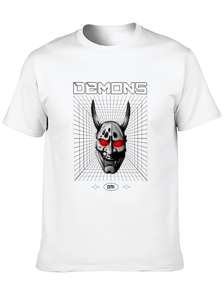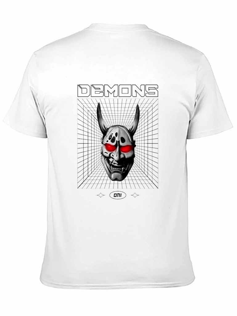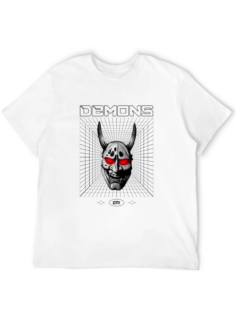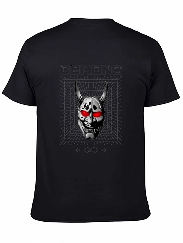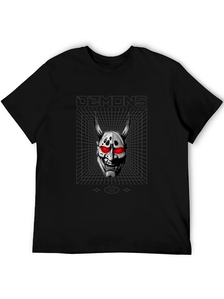 Embrace the darkness with this striking Demons Oni Mask T-Shirt. Crafted from comfortable black fabric, this tee features a captivating graphic print of a traditional Oni mask with glowing red eyes, set against a geometric background. The word "DEMONS" is printed above the mask, adding to the edgy aesthetic. Perfect for casual wear, concerts, or expressing your unique style, this t-shirt is sure to turn heads. Pair it with jeans or shorts for a cool, urban look. Stand out from the crowd and showcase your individuality with this bold and eye-catching tee.