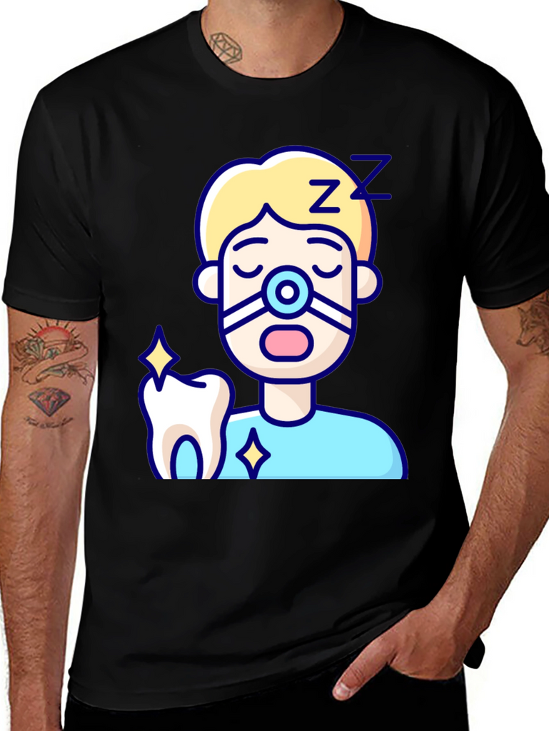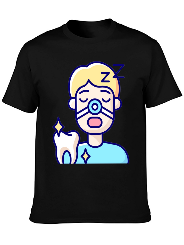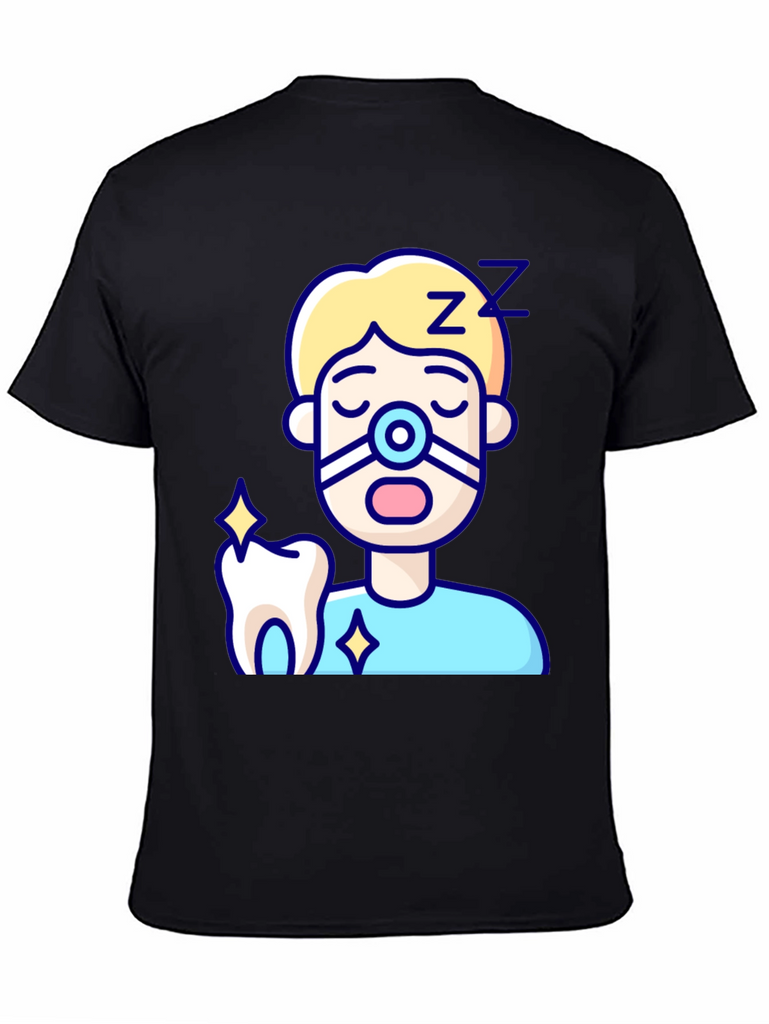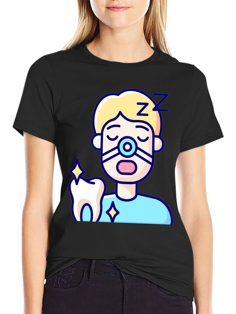 This black t-shirt features a whimsical cartoon graphic of a person undergoing dental anesthesia. The design shows a patient with a blonde hair wearing a nasal mask with "Z" symbols floating above their head, indicating sleep. A sparkling tooth graphic adds to the fun, highlighting the dental theme. Made from a soft, comfortable fabric, this tee is perfect for dentists, dental students, or anyone with a sense of humor. Wear it to the office, casual outings, or as a conversation starter. It's a unique and playful way to show your love for dentistry!