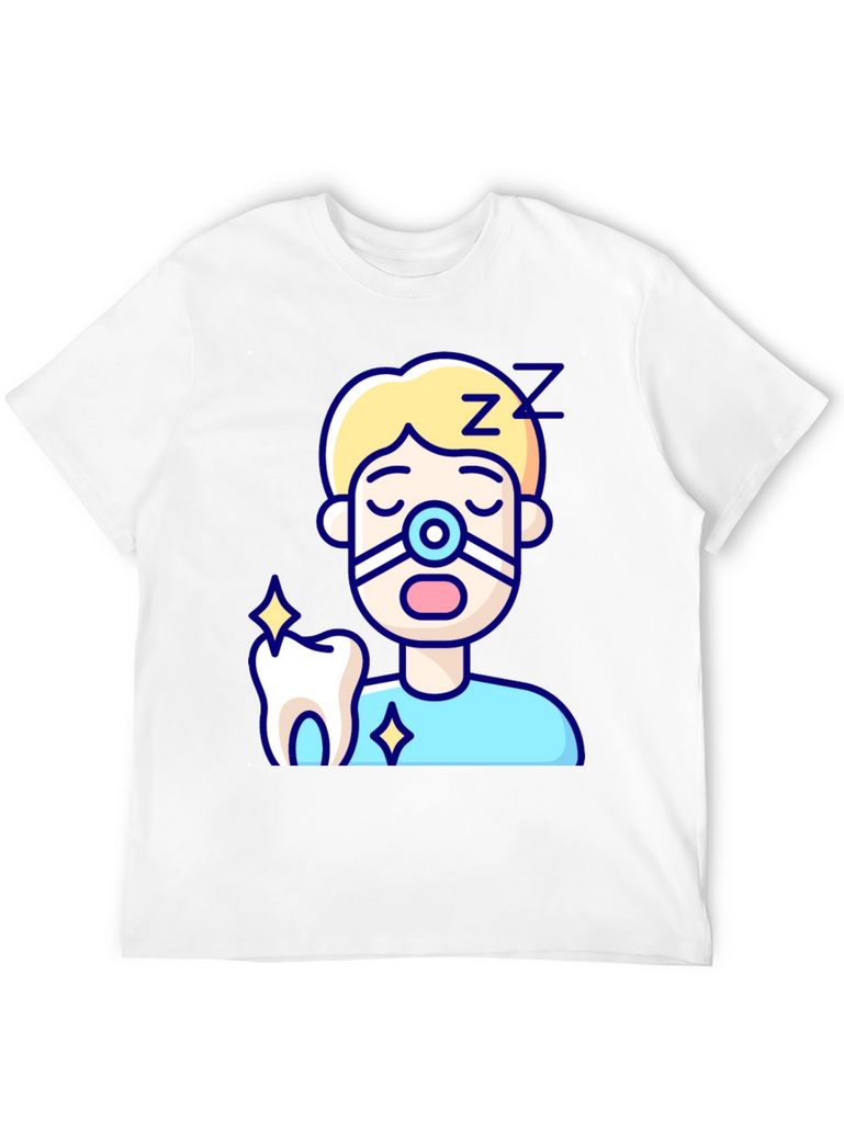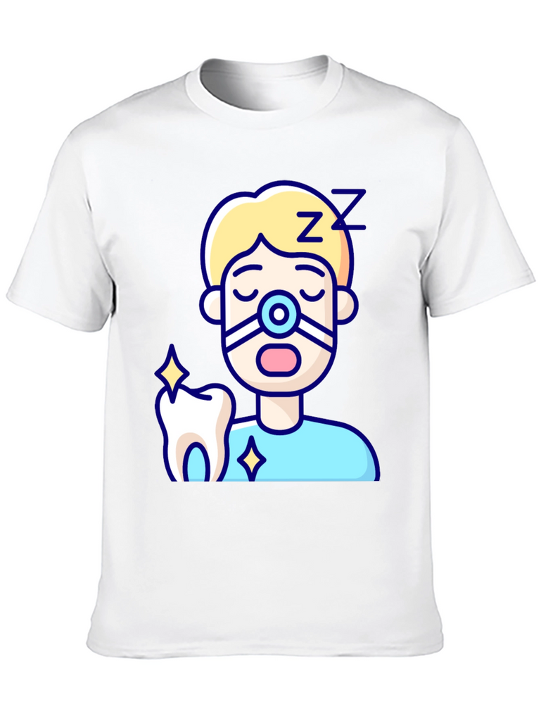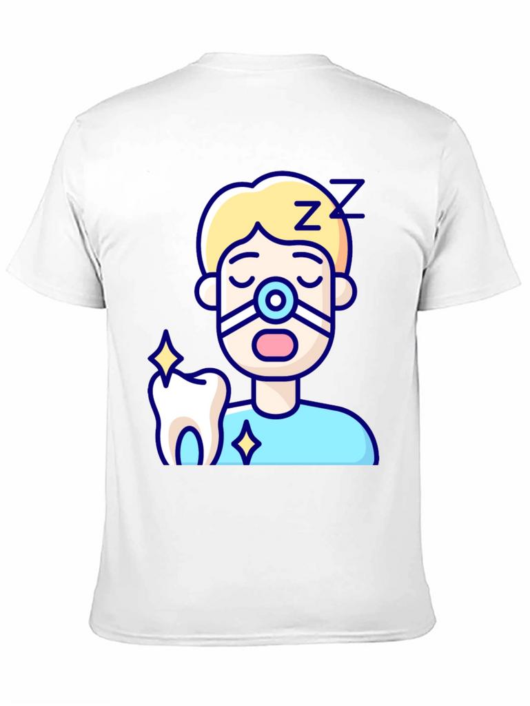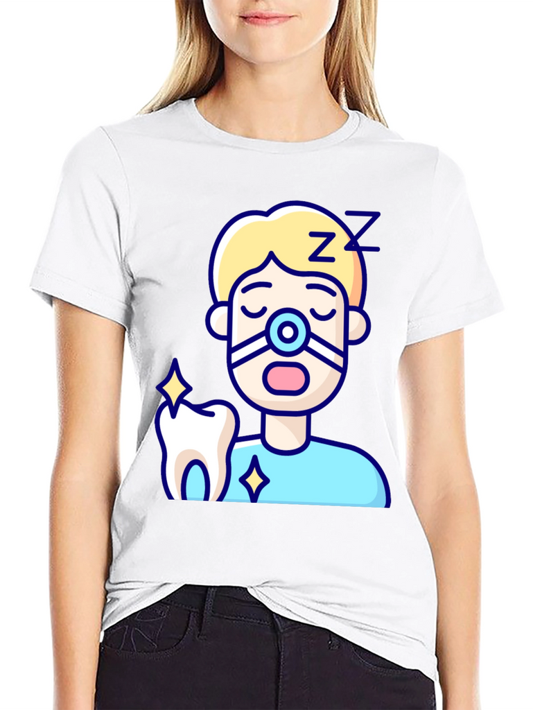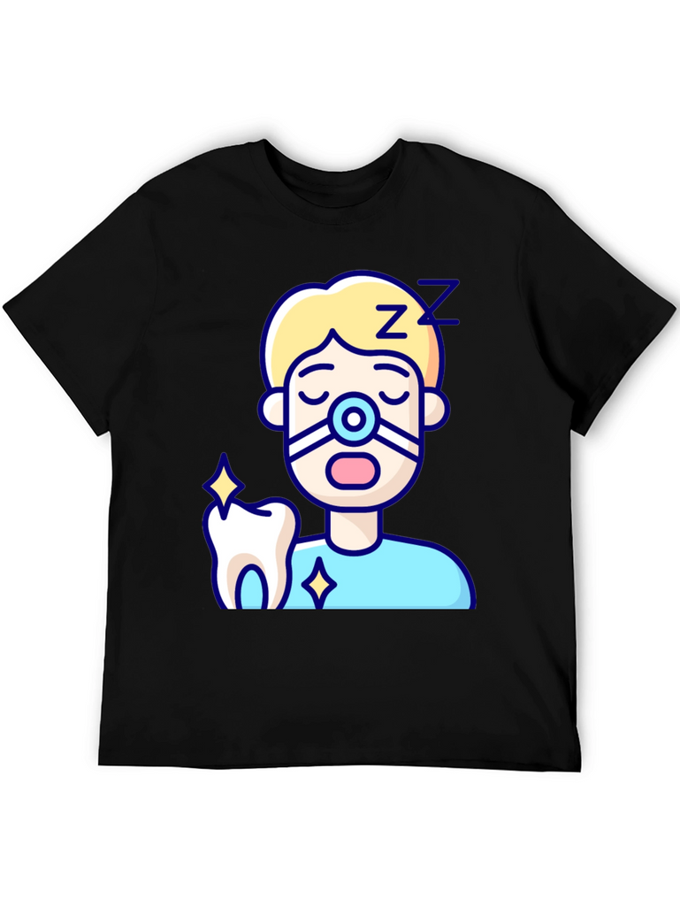 This black t-shirt features a whimsical cartoon graphic of a person undergoing dental anesthesia. The design shows a patient with a blonde hair wearing a nasal mask with "Z" symbols floating above their head, indicating sleep. A sparkling tooth graphic adds to the fun, highlighting the dental theme. Made from a soft, comfortable fabric, this tee is perfect for dentists, dental students, or anyone with a sense of humor. Wear it to the office, casual outings, or as a conversation starter. It's a unique and playful way to show your love for dentistry!