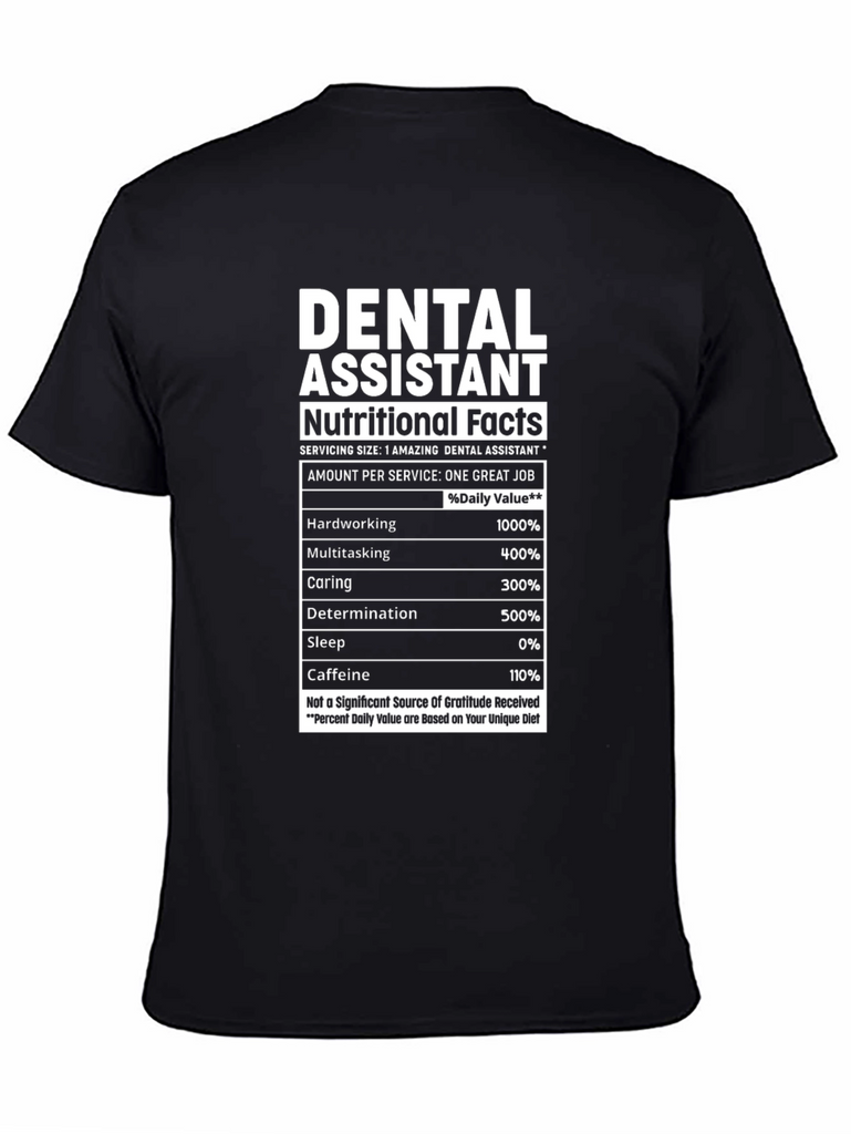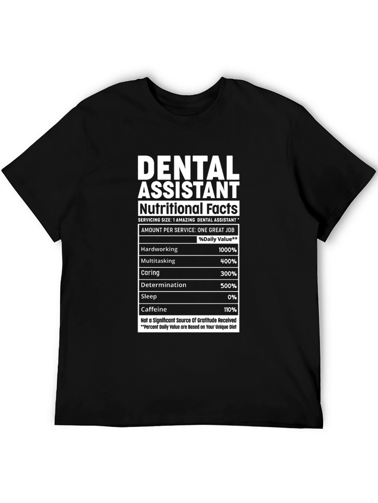 This black t-shirt features a humorous "Nutritional Facts" label tailored for dental assistants. Bold white text spells out "DENTAL ASSISTANT" above the label, which lists ingredients like "Hardworking (1000%)," "Multitasking (400%)," and "Caffeine (110%)." Ideal for dental assistants with a sense of humor, this shirt is sure to spark conversations. This t-shirt makes a fun and unique gift for birthdays, holidays, or just to show appreciation for the amazing dental assistants in your life. Show off your dedication and sense of humor with this clever tee!