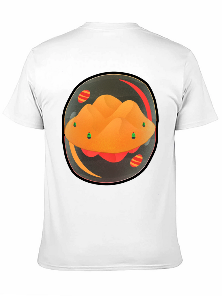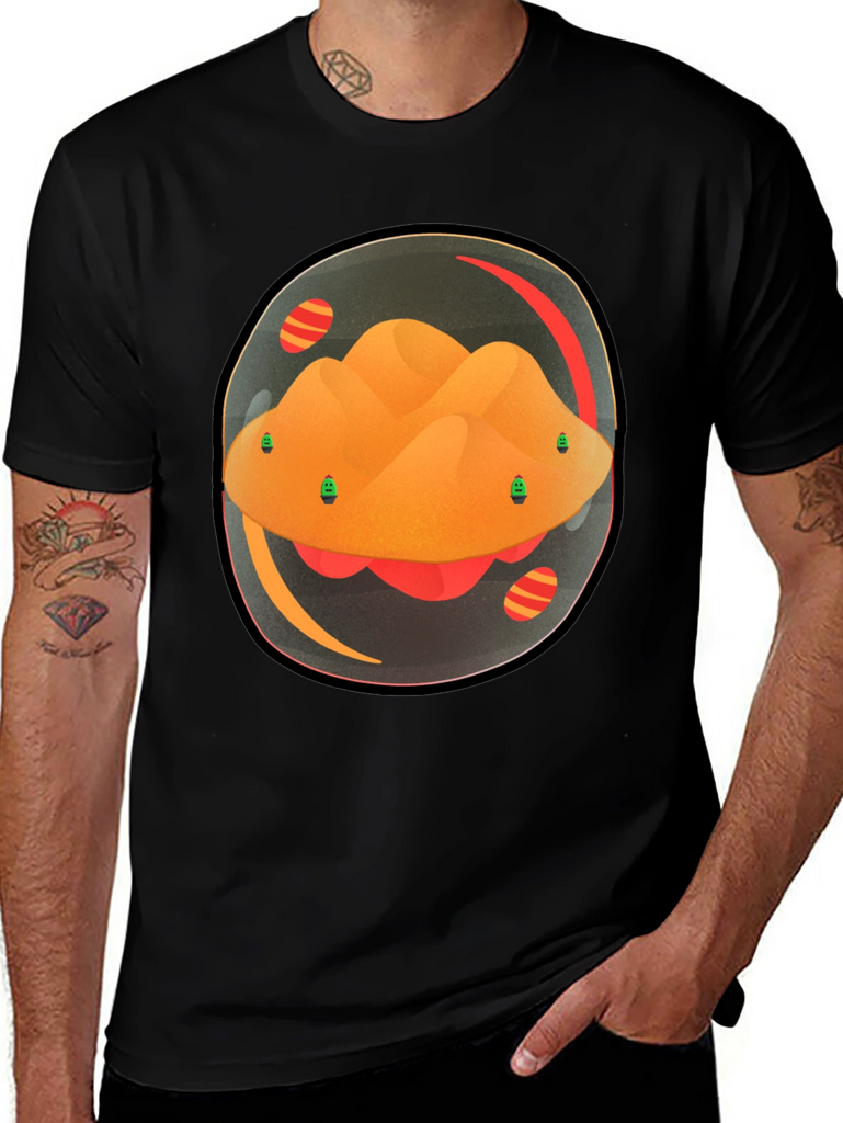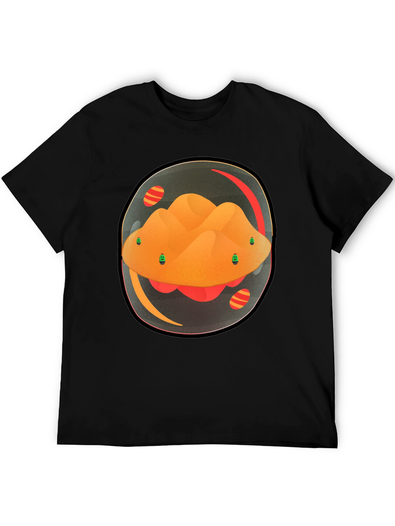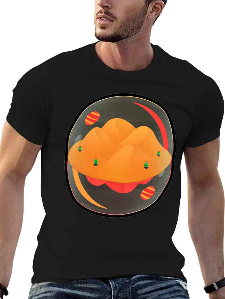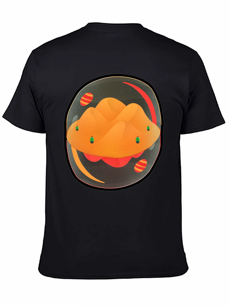 Explore the cosmos with this unique black t-shirt! Featuring a stylized graphic of a desert-like planet encapsulated in a bubble, this shirt is sure to turn heads. The design includes orange sand dunes, red accents, and whimsical plant life, evoking a sense of adventure and discovery. Made from a comfortable and durable fabric, it's perfect for everyday wear or a casual outing. Showcase your love for space and unique designs with this eye-catching t-shirt that blends comfort and style seamlessly. This shirt is a fantastic conversation starter and a great addition to any wardrobe.