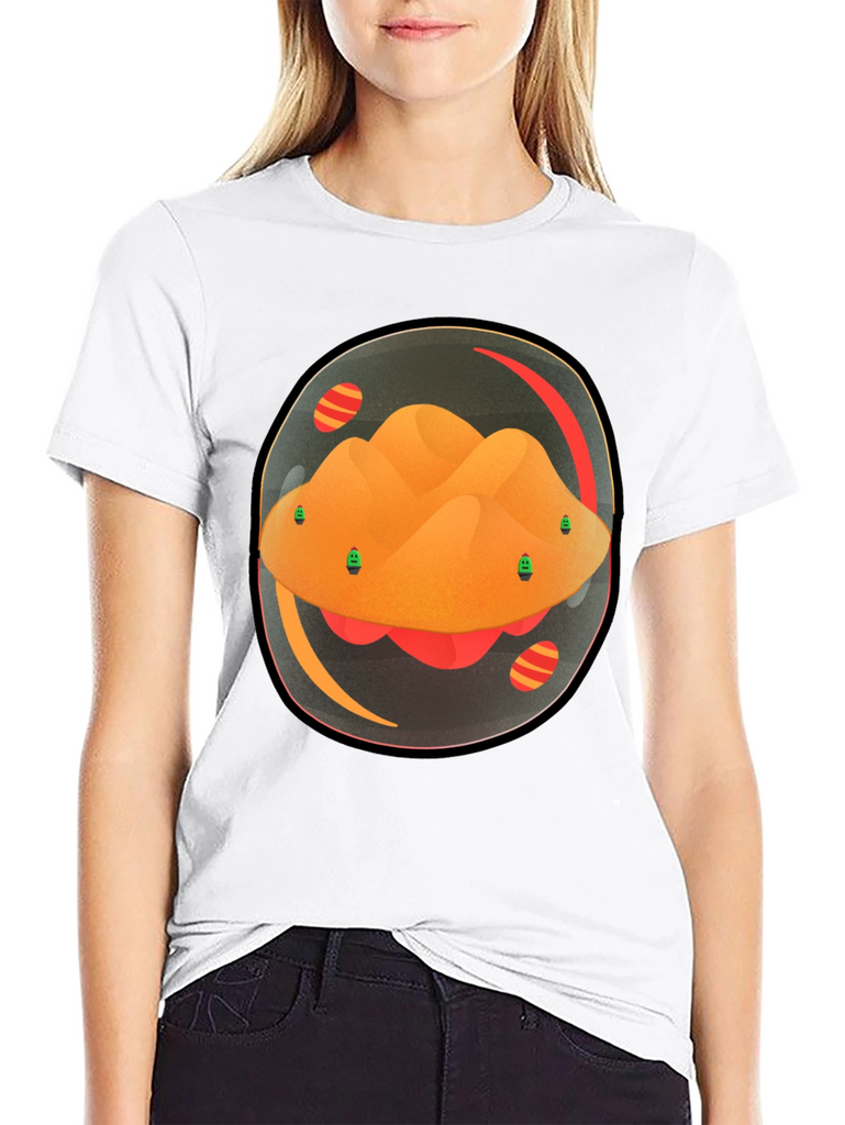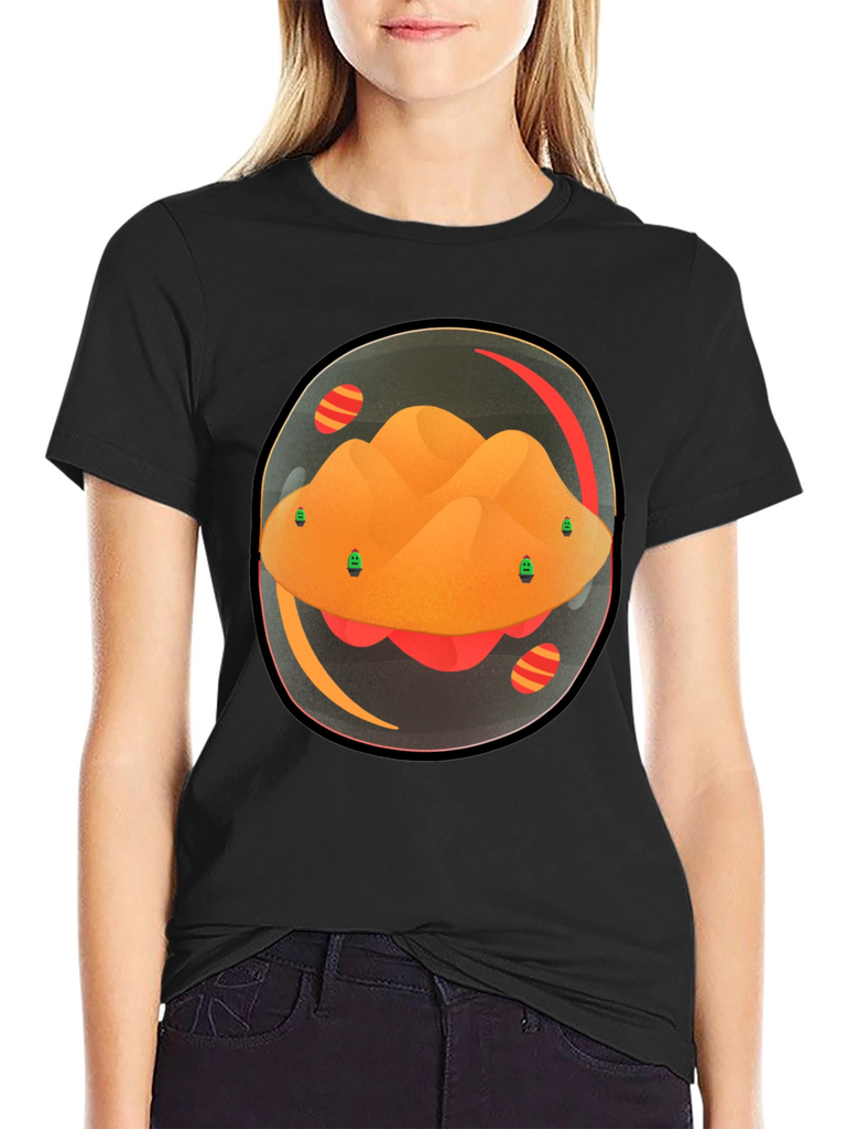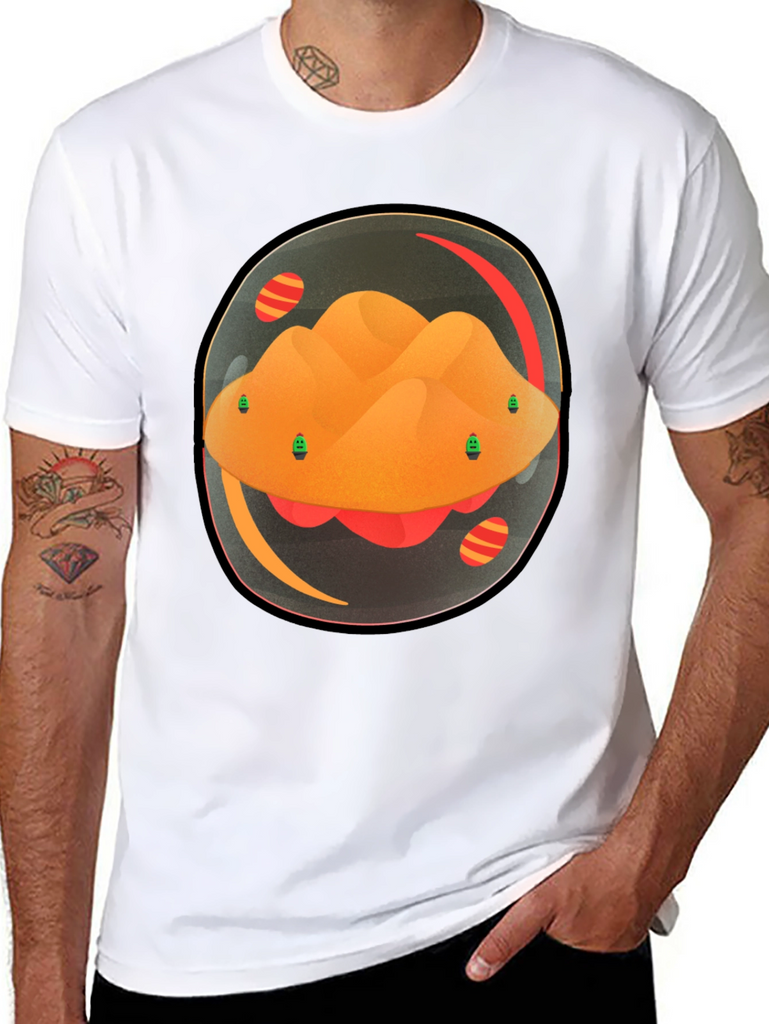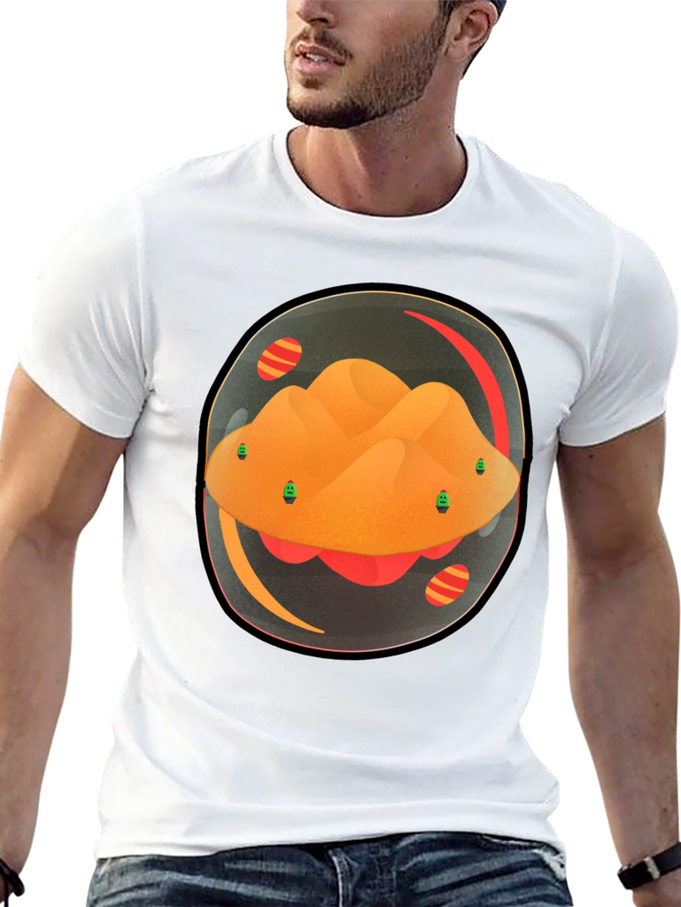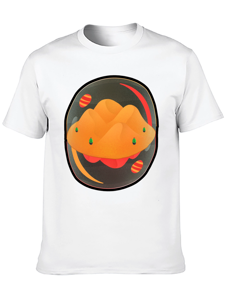 Explore the cosmos with this unique black t-shirt! Featuring a stylized graphic of a desert-like planet encapsulated in a bubble, this shirt is sure to turn heads. The design includes orange sand dunes, red accents, and whimsical plant life, evoking a sense of adventure and discovery. Made from a comfortable and durable fabric, it's perfect for everyday wear or a casual outing. Showcase your love for space and unique designs with this eye-catching t-shirt that blends comfort and style seamlessly. This shirt is a fantastic conversation starter and a great addition to any wardrobe.