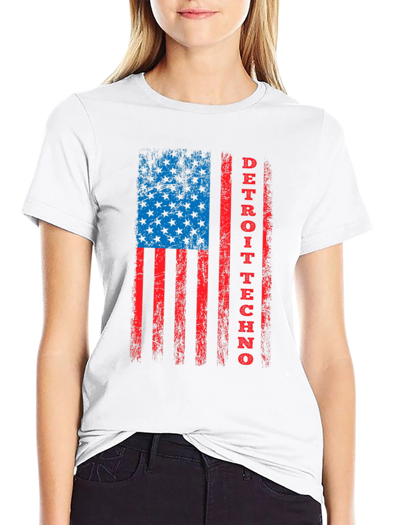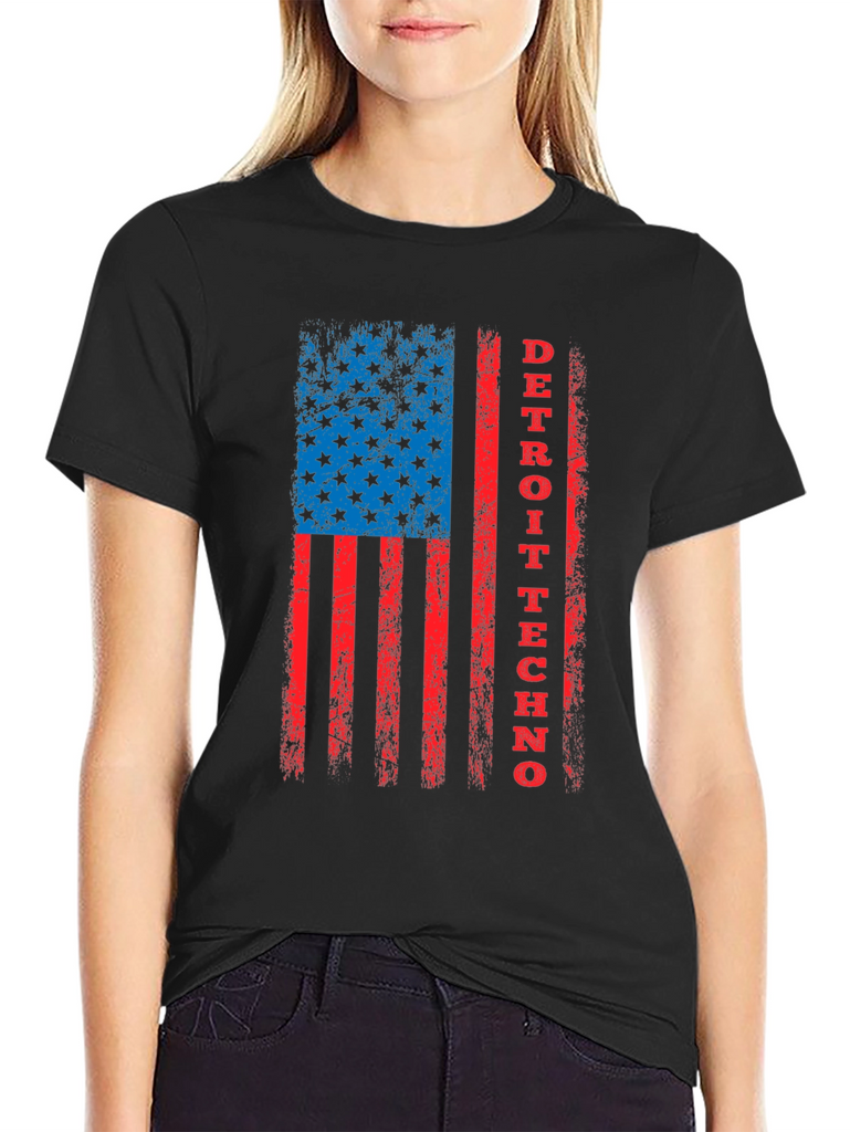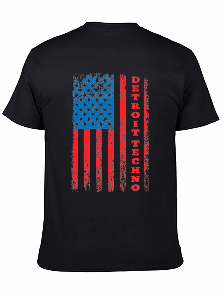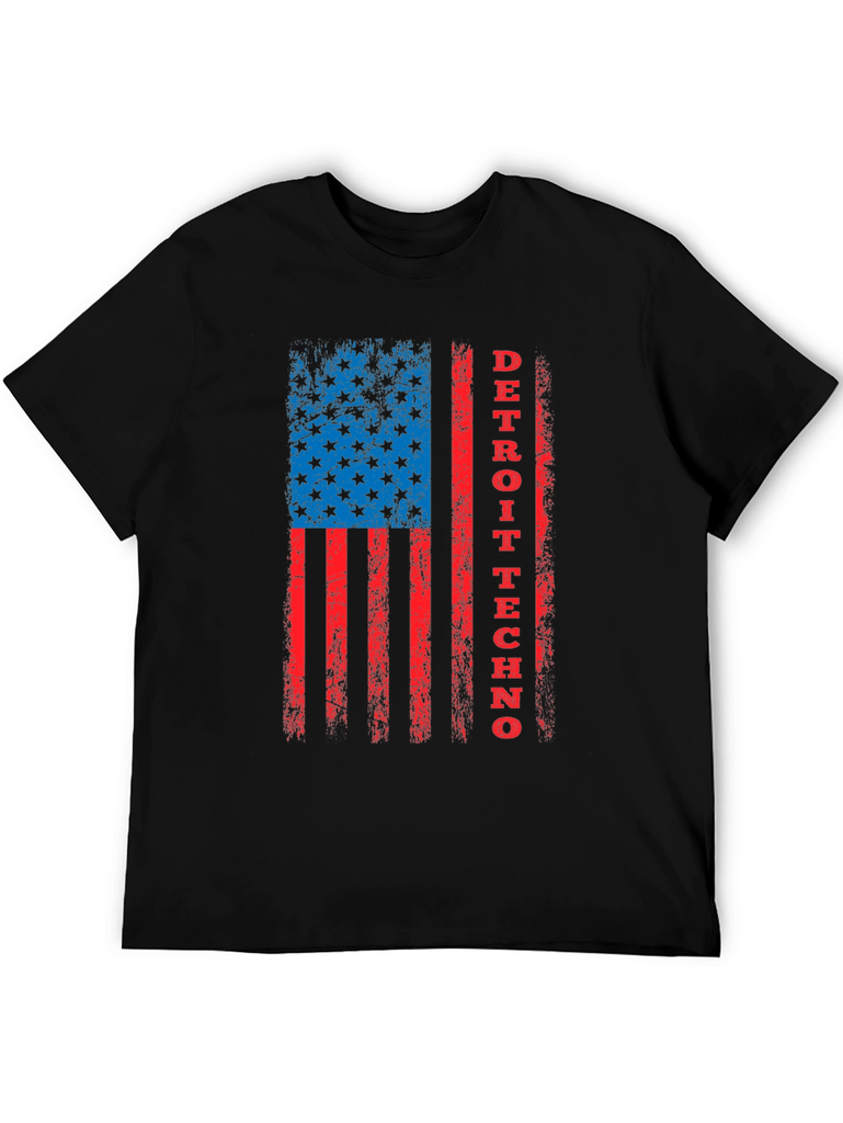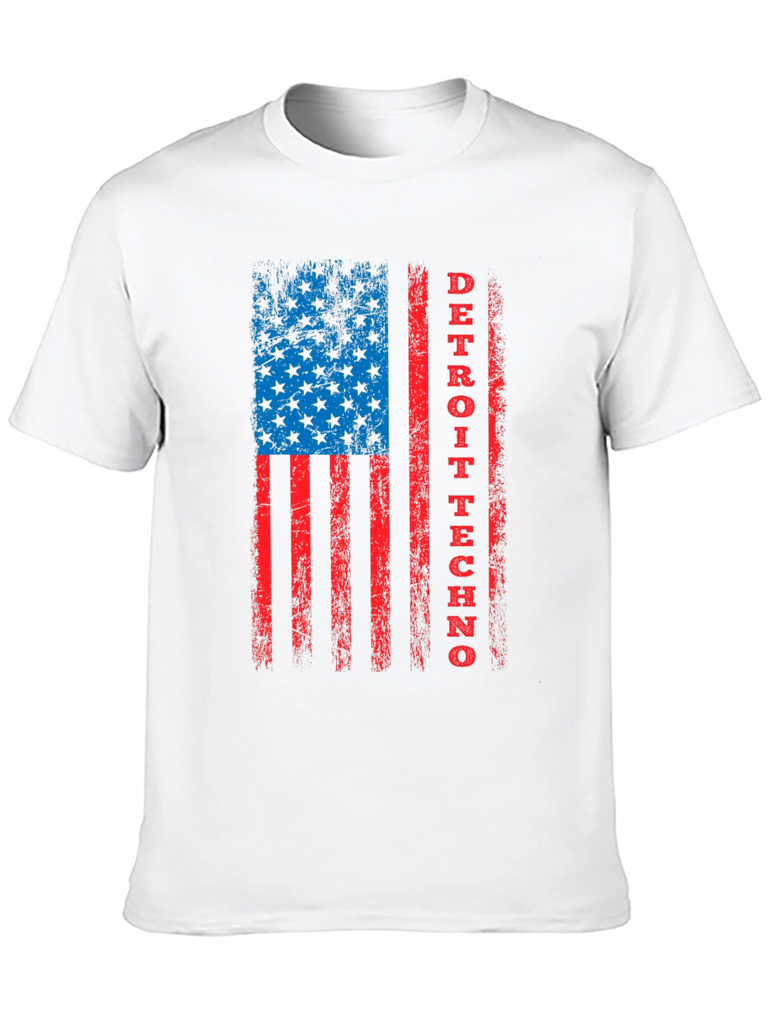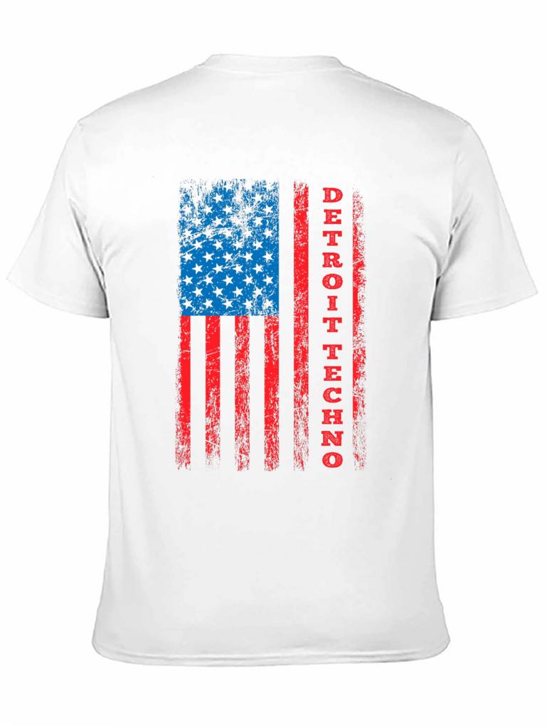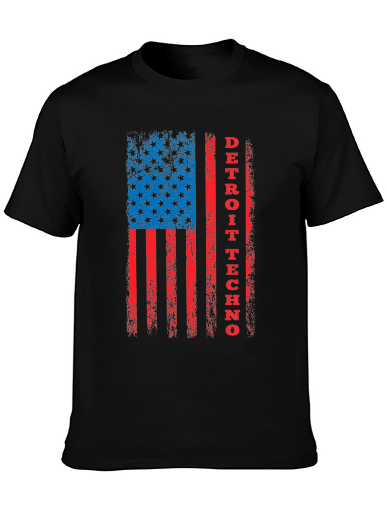 Show your love for Detroit Techno with this unique graphic t-shirt. The shirt features a distressed American flag design with a blue star field and red stripes. Vertically aligned along the flag's right side are the words "DETROIT TECHNO" in a bold red font, making a statement. Made from a soft, comfortable material, this tee is perfect for casual wear, music festivals, or showing off your Detroit pride. Get yours today!