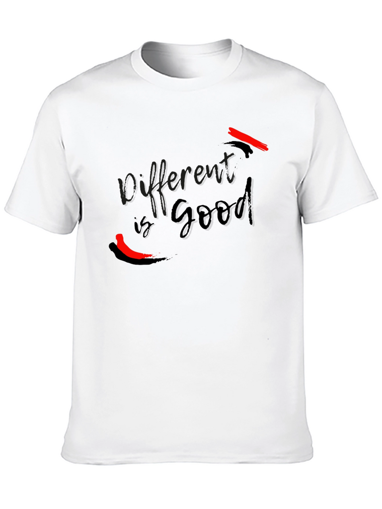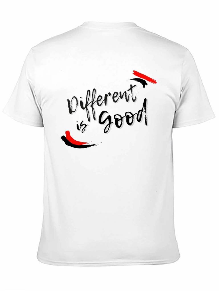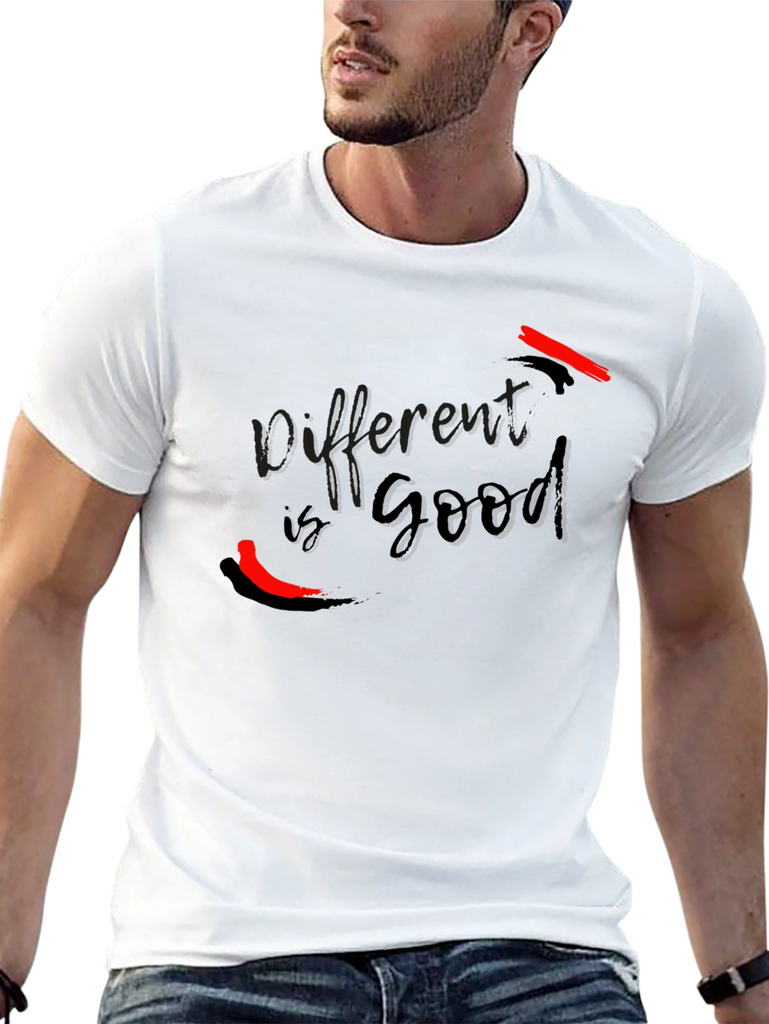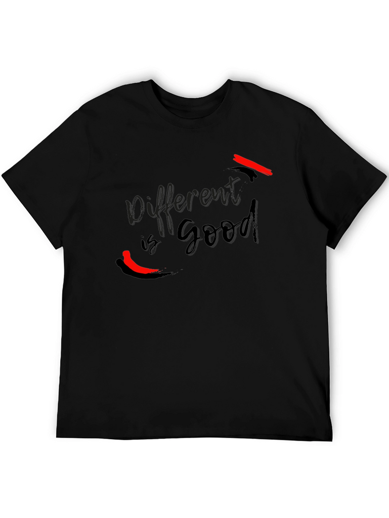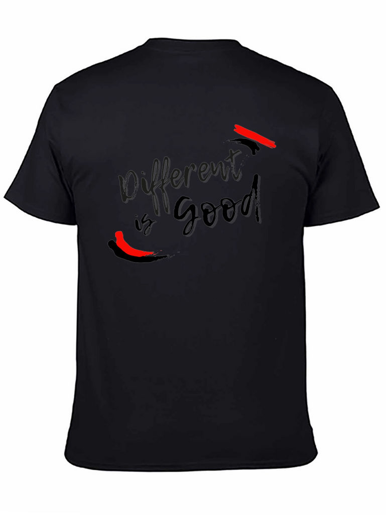 This stylish black t-shirt features the text "Different is Good" in a sleek, modern font. The design incorporates bold red accent brushstrokes, adding a touch of vibrant contrast and artistic flair. Made from a soft and comfortable fabric, this tee offers a relaxed fit that's perfect for everyday wear. Its unique graphic makes it a standout piece, ideal for expressing individuality and a positive mindset. Whether you're heading to a casual outing or just want to make a statement, this t-shirt is a great choice.