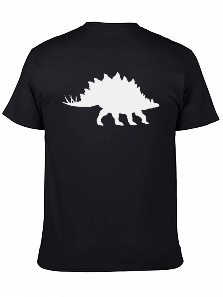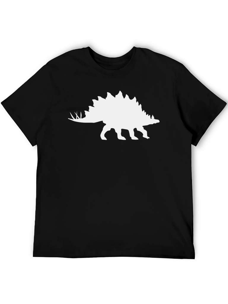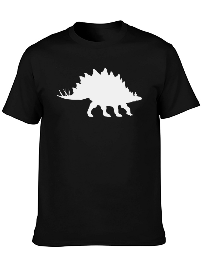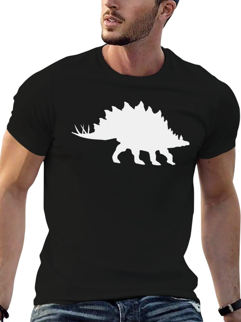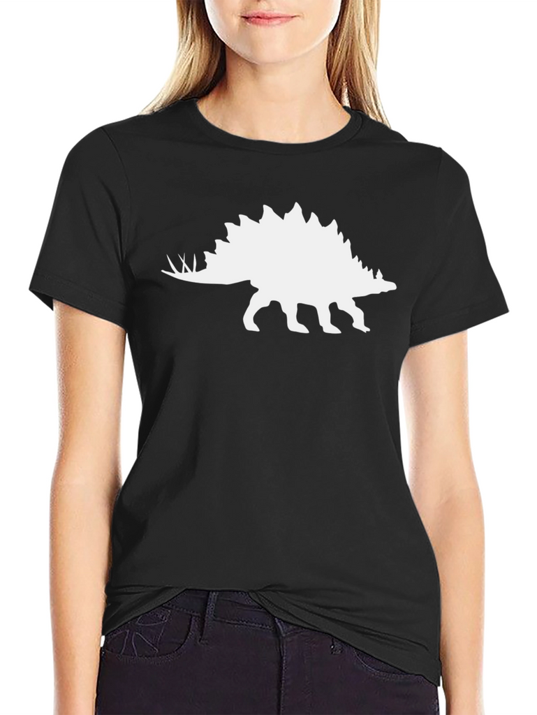Embrace your inner paleontologist with this stylish black t-shirt featuring a bold, white Stegosaurus graphic. Made from comfortable material, this tee is perfect for casual wear and dinosaur enthusiasts alike. The simple, yet eye-catching design makes it a versatile addition to any wardrobe. Wear it to school, a museum, or just lounging around at home. A fun and unique way to express your love for prehistoric creatures. The crisp white dinosaur design pops against the classic black backdrop, creating a visually appealing and trendy piece. Show off your love for dinosaurs with this must-have t-shirt!