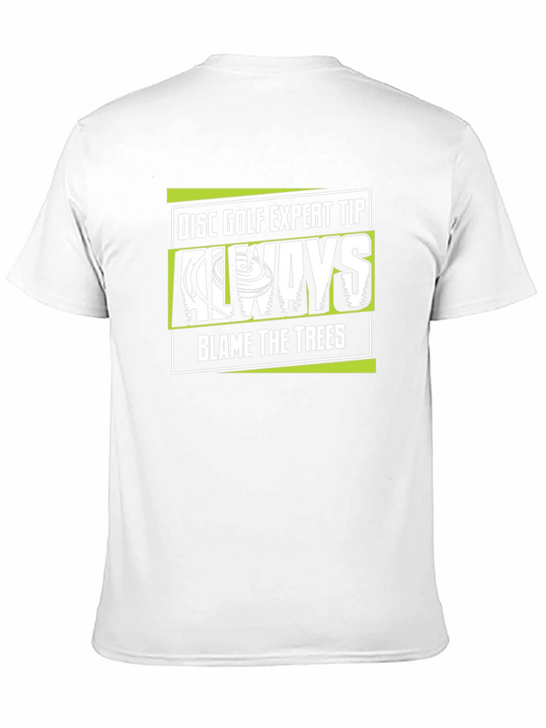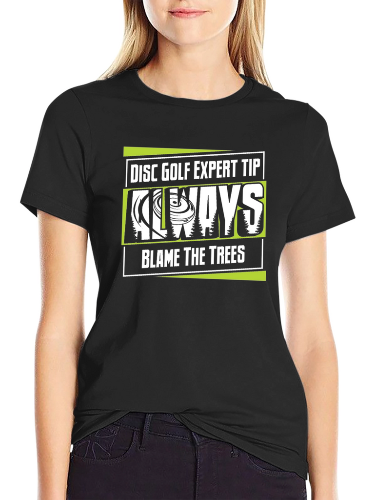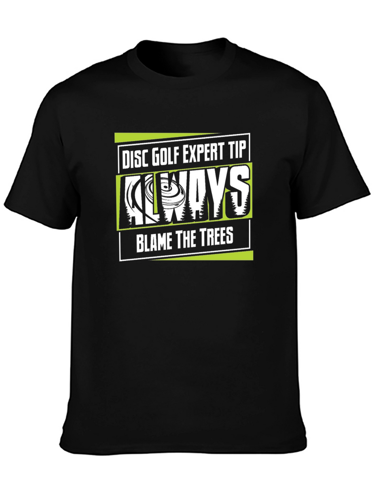 This black t-shirt features a humorous and eye-catching graphic perfect for disc golf enthusiasts. The design includes the phrase "DISC GOLF EXPERT TIP" at the top and "BLAME THE TREES" at the bottom, framing the word "ALWAYS" with a disc golf visual. It's a playful nod to the common excuses made during the sport. The print is a combination of white and green, giving it a clean and modern look. This tee is ideal for casual wear on the course or as a fun conversation starter among fellow players. Show off your passion for disc golf with this comfortable and stylish tee!
