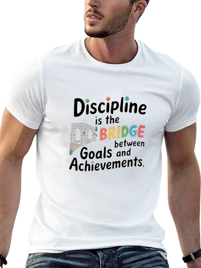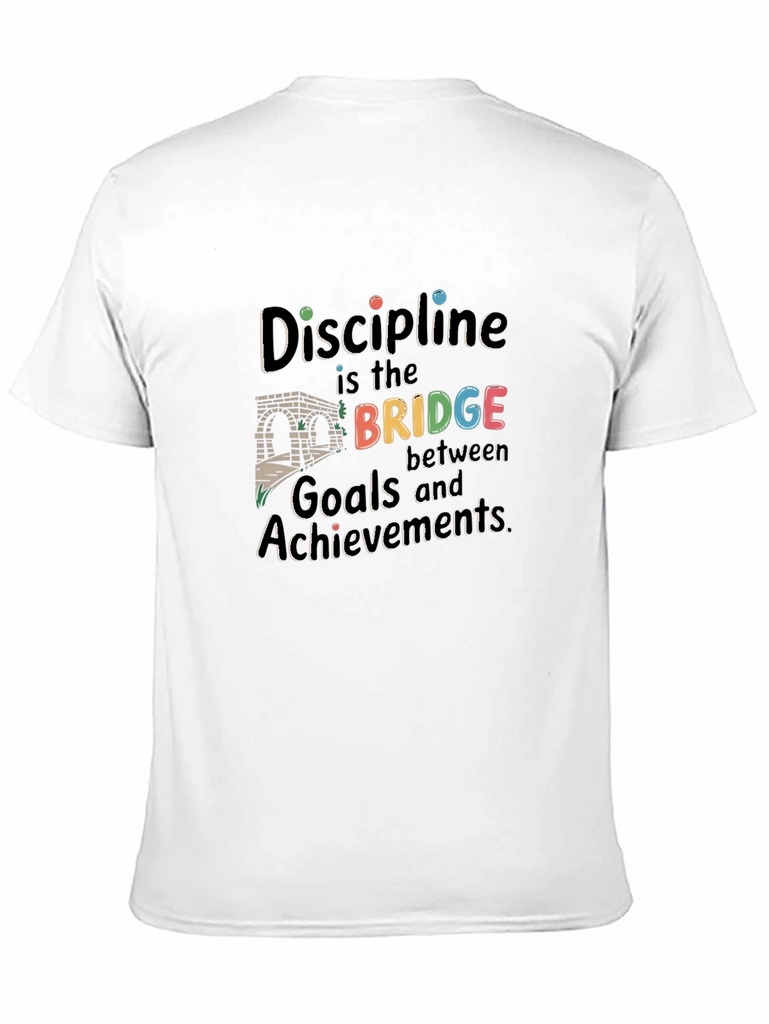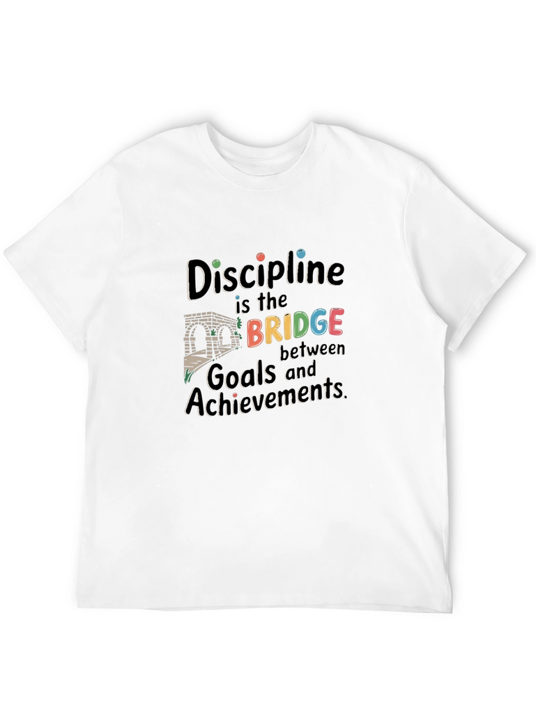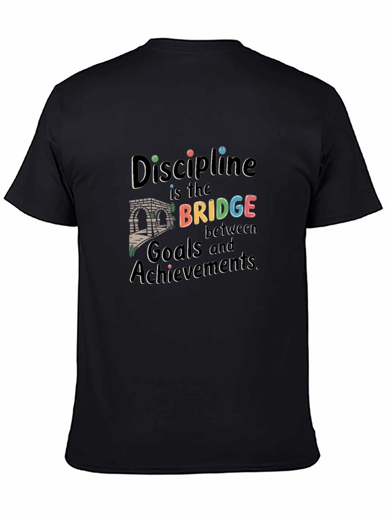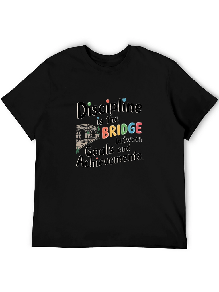 This black t-shirt features a motivational graphic print. The design showcases the saying "Discipline is the Bridge between Goals and Achievements." The word 'Bridge' is represented in a colorful array. A stone-like bridge graphic is situated next to the phrase. Made from a comfortable fabric, this short-sleeve tee is ideal for casual wear. It's a perfect addition to your wardrobe to inspire and motivate you throughout the day. Wear it to the gym, while studying, or for everyday activities. A versatile and meaningful piece!