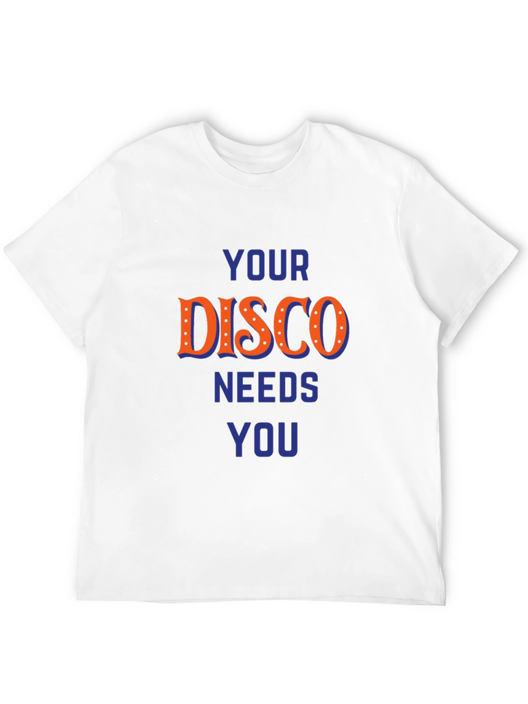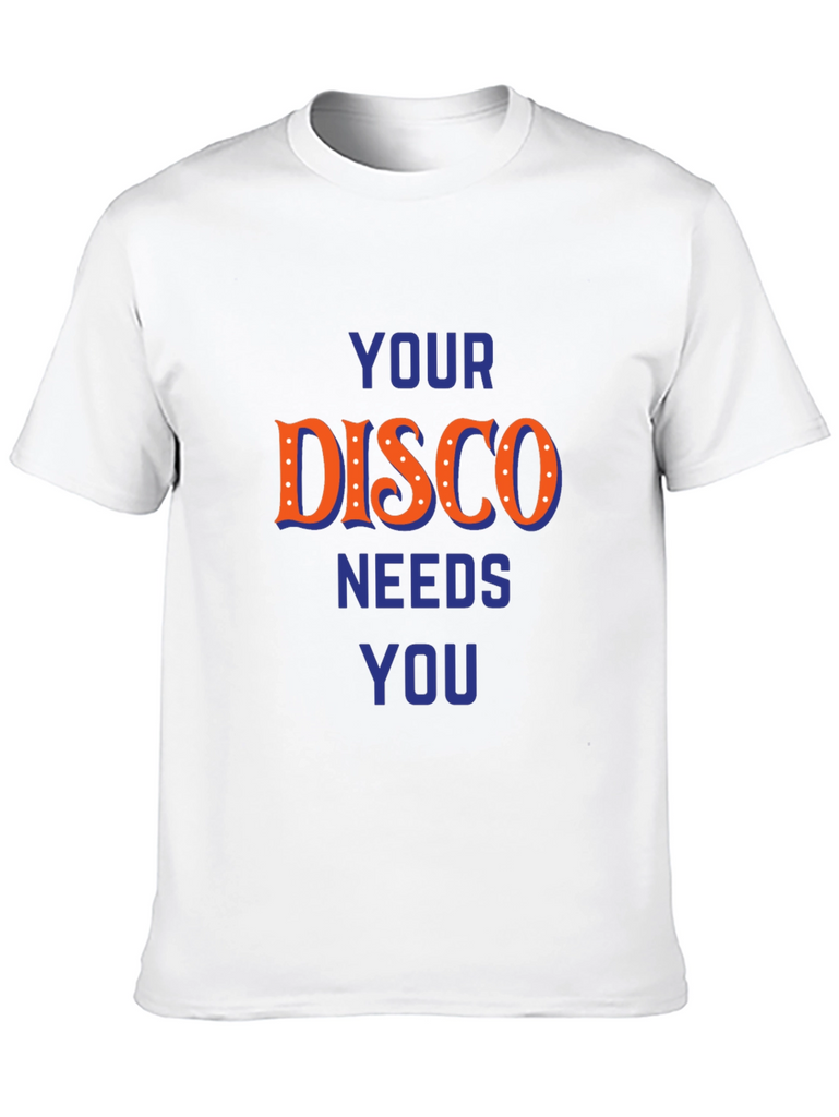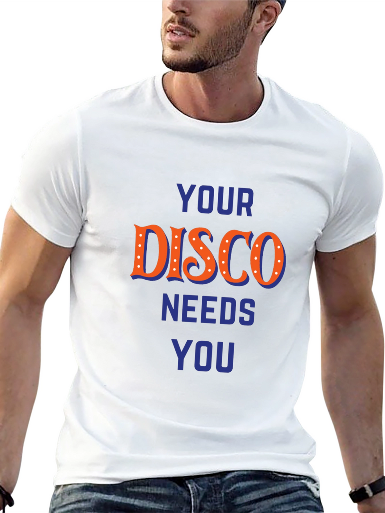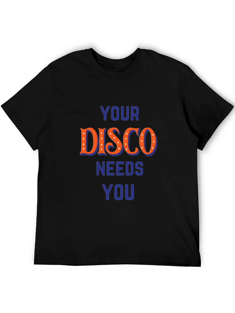This stylish black t-shirt features a vibrant graphic design with the words "Your Disco Needs You" in a striking combination of blue and orange. The "DISCO" text is particularly eye-catching, adorned with a dotted pattern. The shirt appears to be made from a comfortable material, likely cotton or a cotton blend, perfect for casual wear or a night out dancing. The design is bold and playful, making it an ideal choice for those who love disco music or enjoy making a statement. This t-shirt would be a great addition to any wardrobe, adding a touch of fun and personality to your look.