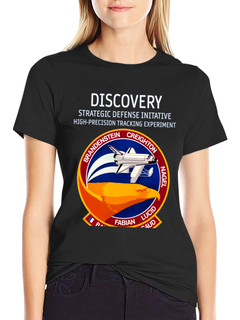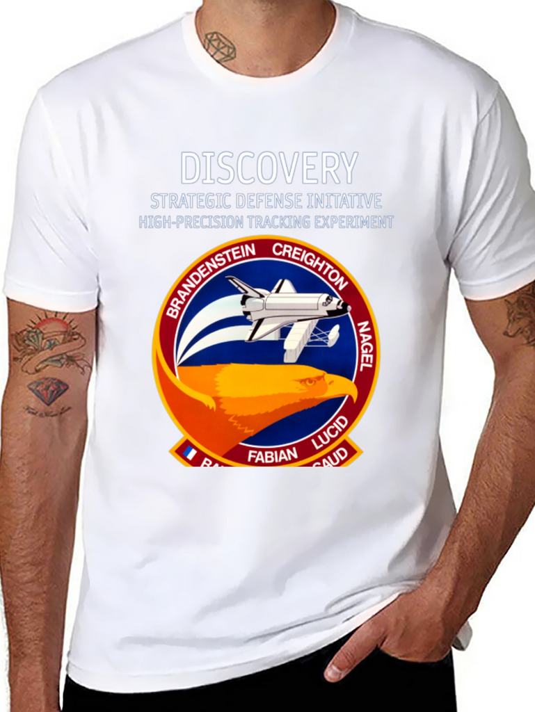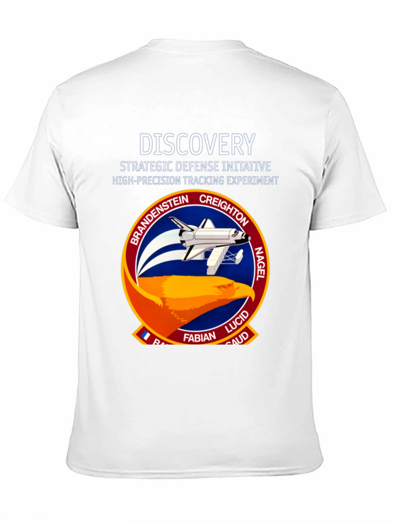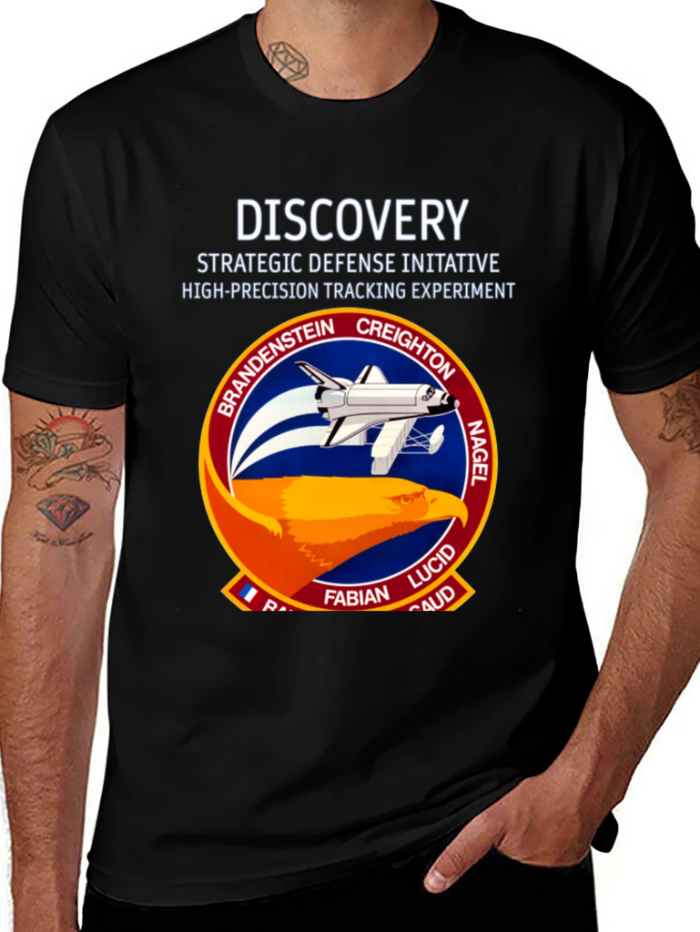 Show your love for space exploration with this unique black T-shirt. Featuring a bold graphic of the Discovery Space Shuttle mission patch on the front, this tee is a must-have for any space enthusiast. The graphic includes the names of the astronauts involved in the Strategic Defense Initiative High-Precision Tracking Experiment. Made from a comfortable, breathable fabric, this shirt is perfect for everyday wear or as a statement piece. Get yours today and showcase your passion for space and science.