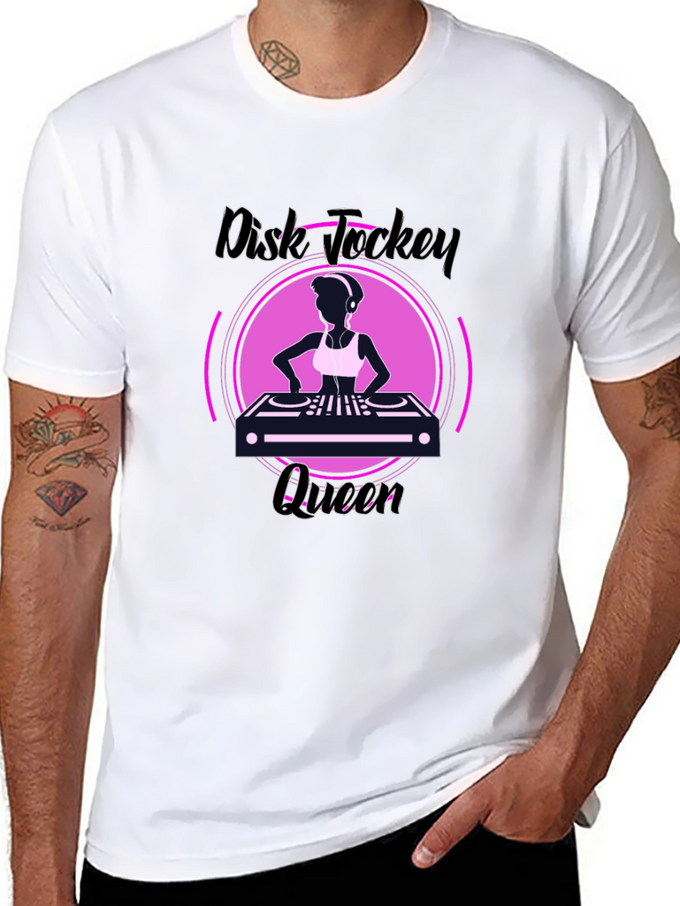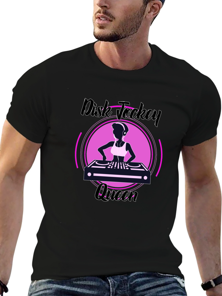 Show off your love for music with this stylish black tee! The shirt features a vibrant graphic of a DJ silhouette behind a turntable, encased within a pink circular frame, and emblazoned with 'Disk Jockey Queen' text. This tee is perfect for music lovers, DJs, or anyone who wants to make a bold statement. Made from comfortable material, it is perfect for everyday wear or a night out at the club. Own the spotlight and let your passion shine through with this unique graphic tee. Rock on!