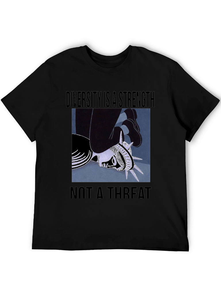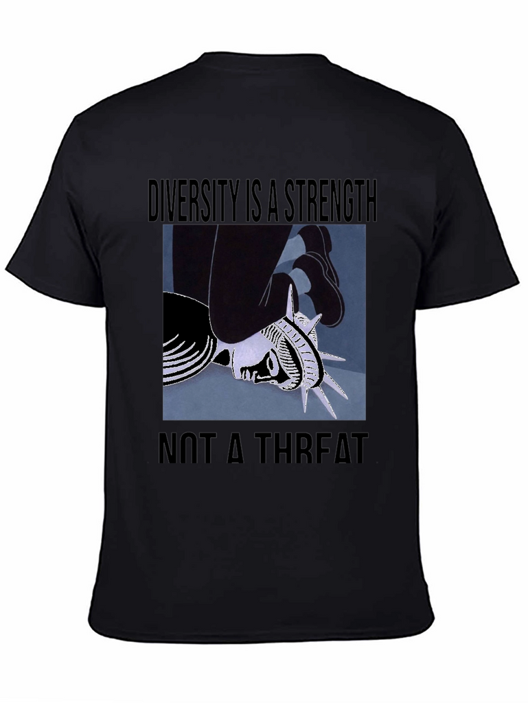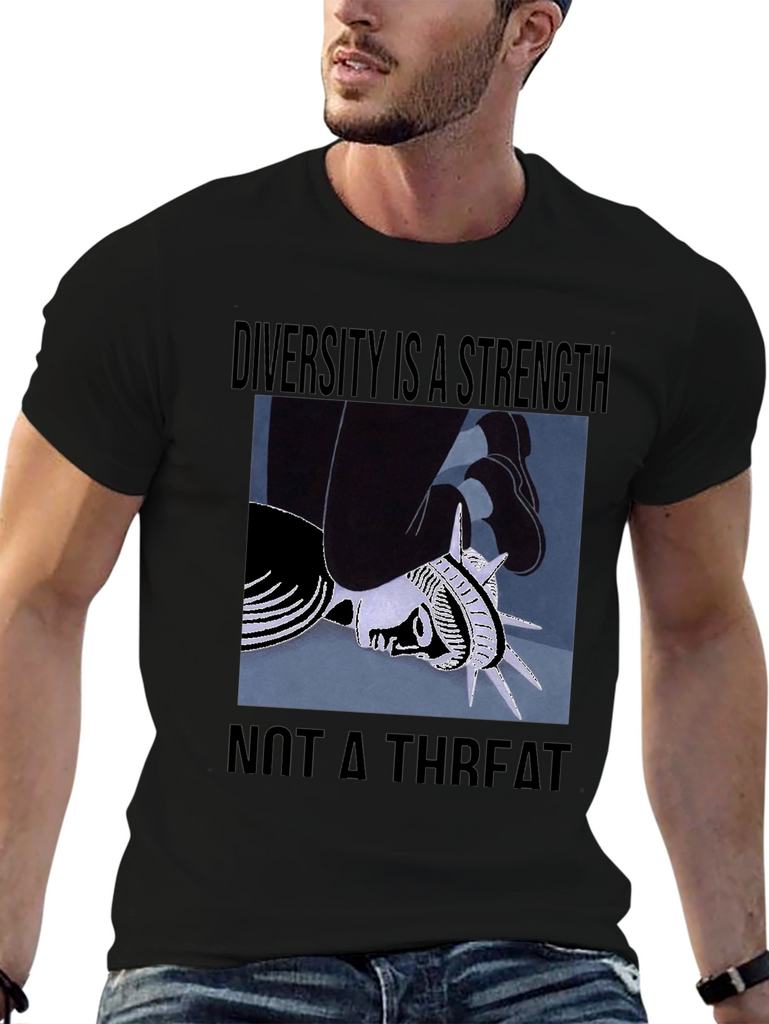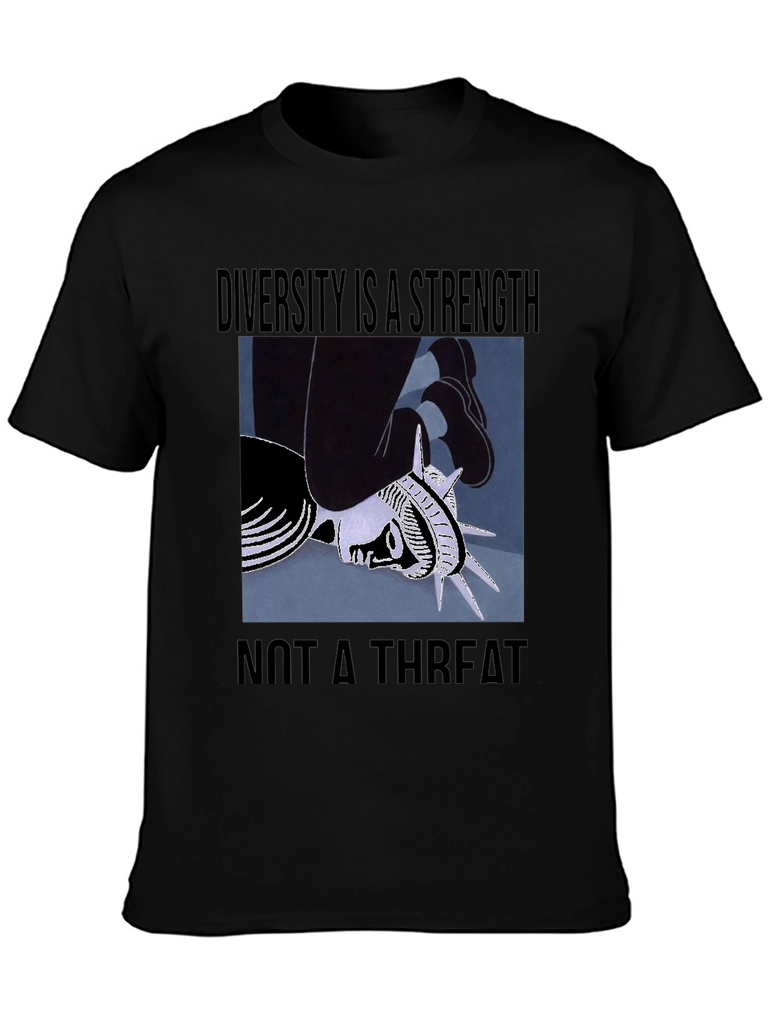 Express your values with this impactful black t-shirt. It features a powerful message: "Diversity is a Strength, Not a Threat," accompanied by an artistic graphic. This statement piece is perfect for everyday wear, rallies, or community events. Made from comfortable materials, it's designed to make a statement while keeping you at ease. Wear your beliefs with pride and spark conversations that matter.
