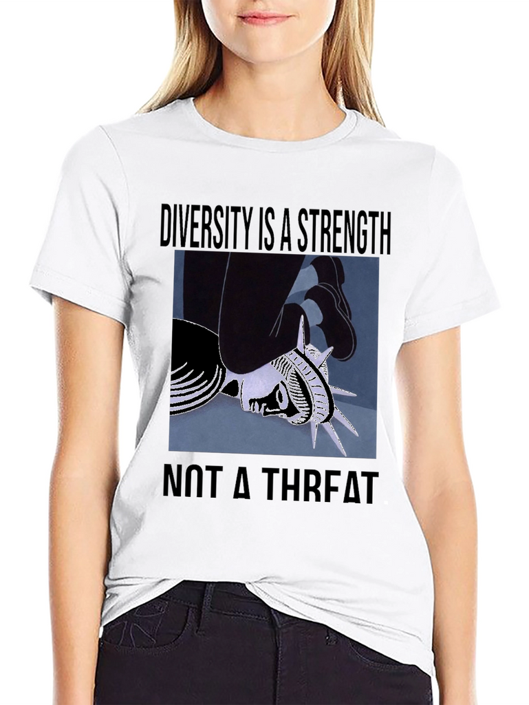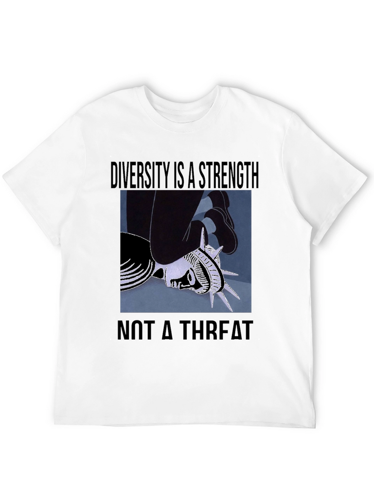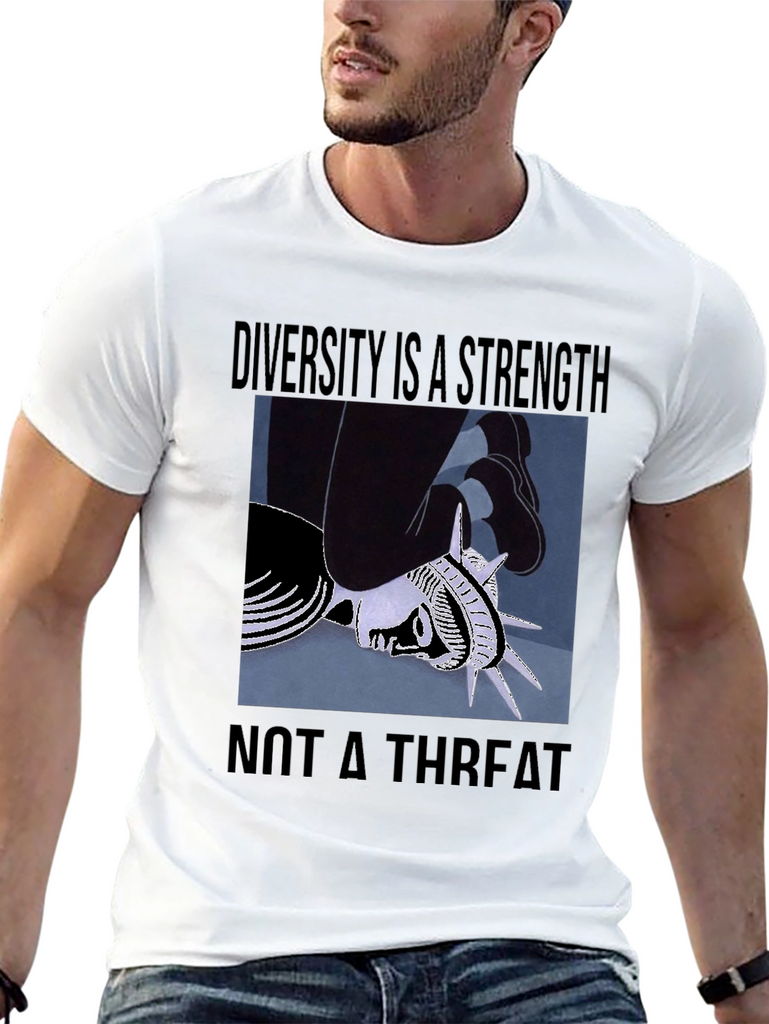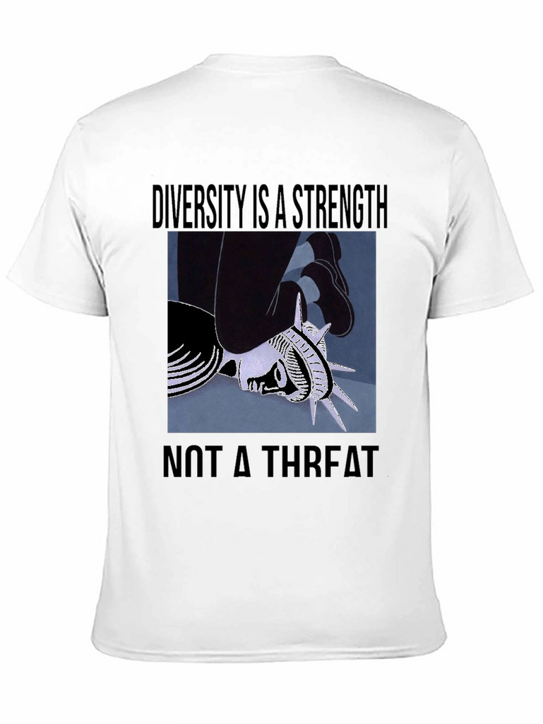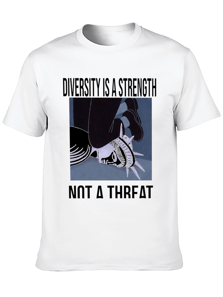 Express your values with this impactful black t-shirt. It features a powerful message: "Diversity is a Strength, Not a Threat," accompanied by an artistic graphic. This statement piece is perfect for everyday wear, rallies, or community events. Made from comfortable materials, it's designed to make a statement while keeping you at ease. Wear your beliefs with pride and spark conversations that matter.