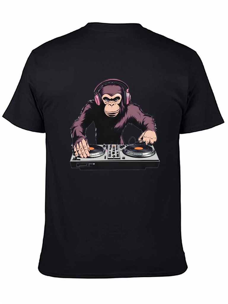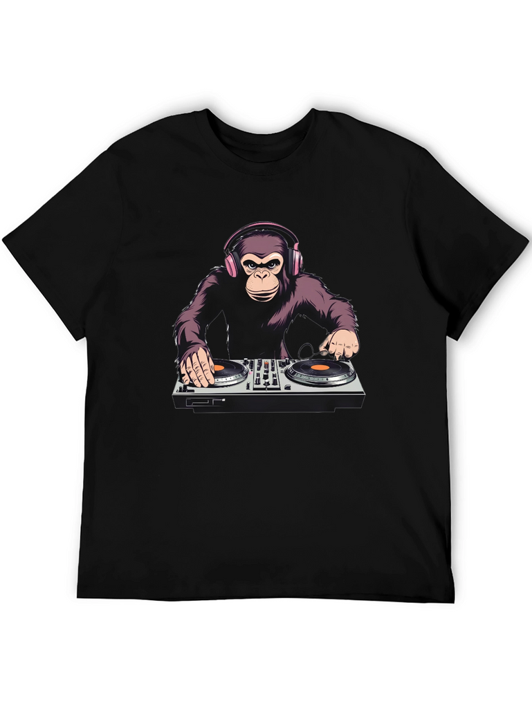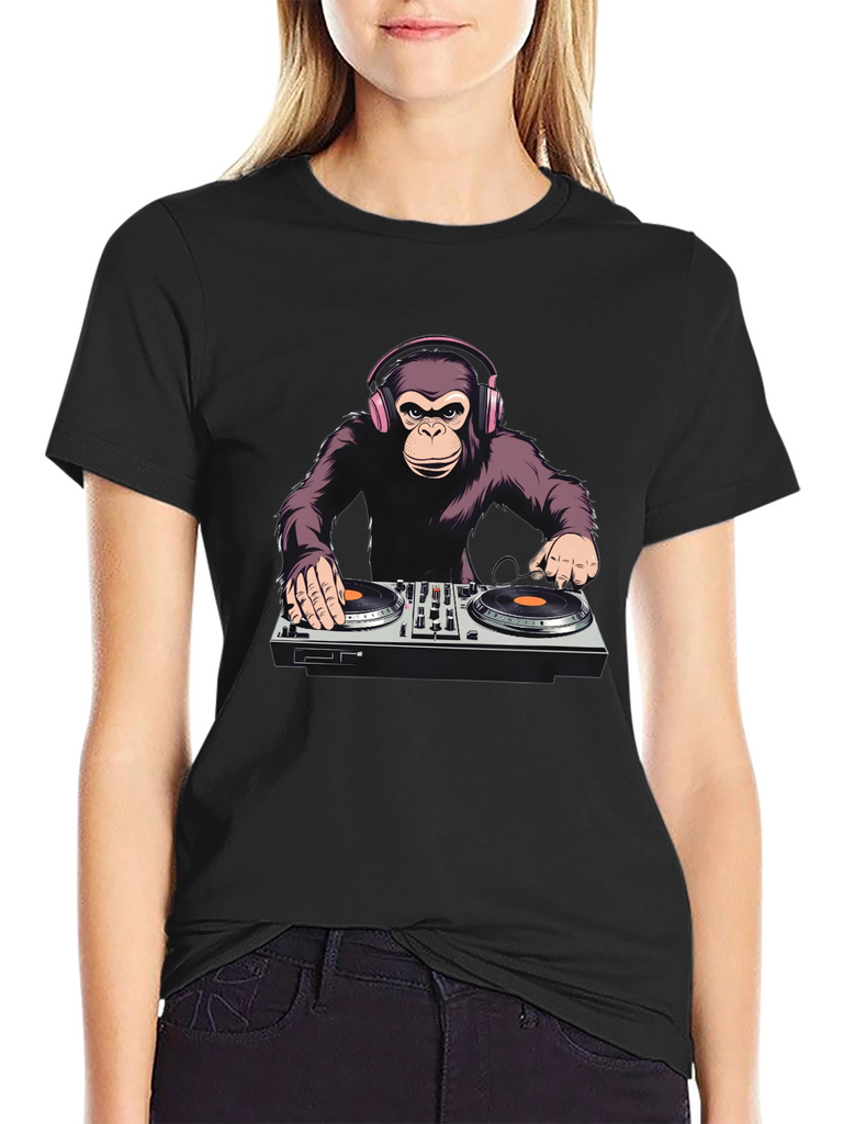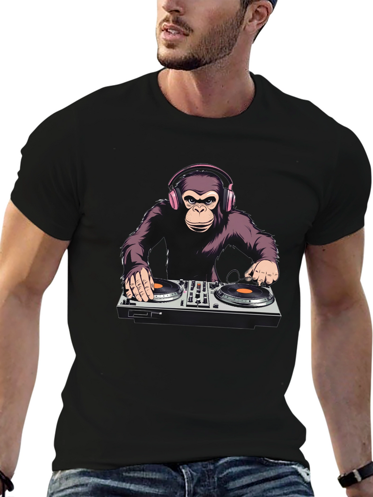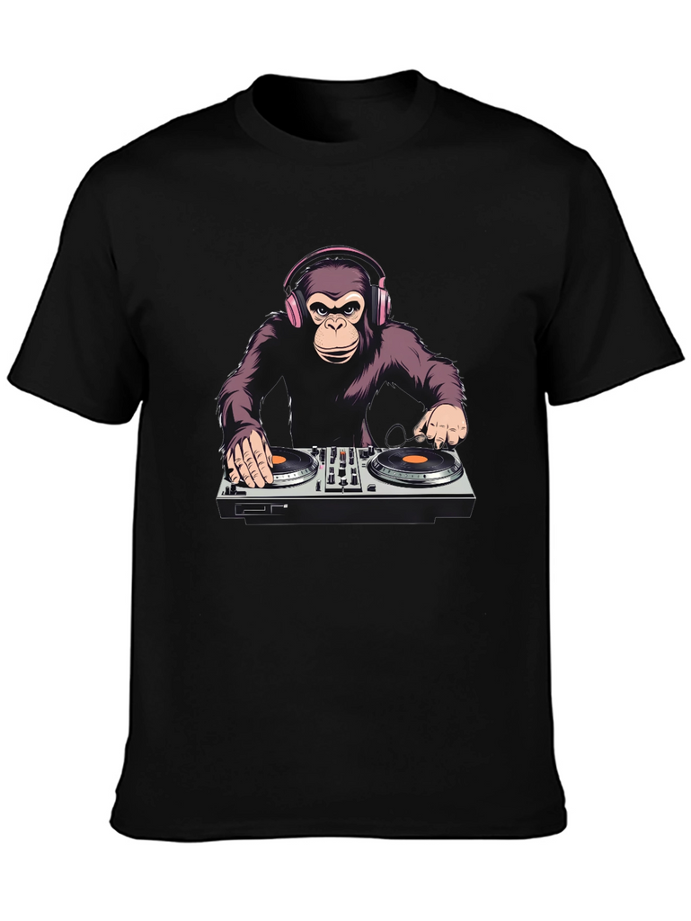 Rock a unique style with this black DJ Monkey T-shirt. This eye-catching tee features a cool graphic of a chimpanzee wearing pink headphones and mixing on a turntable. Made from soft and comfortable fabric, this shirt is perfect for casual wear and music lovers. It's a great conversation starter and a fun addition to any wardrobe. Wear it to concerts, parties, or just chilling with friends. Get ready to turn heads with this one-of-a-kind t-shirt!