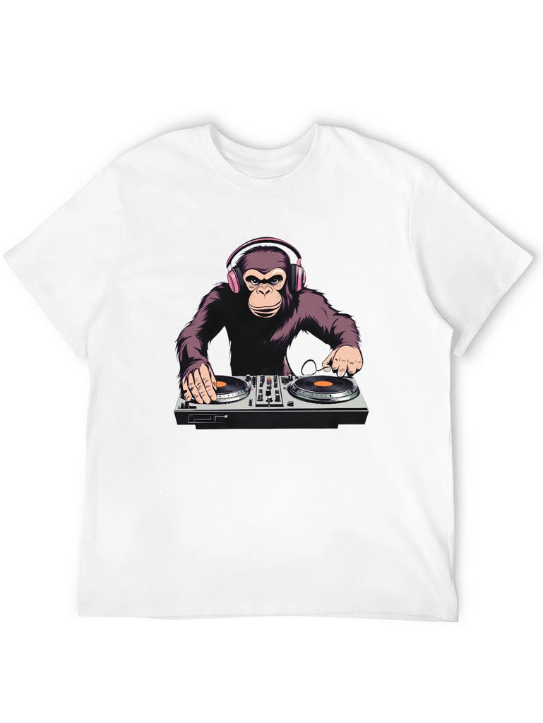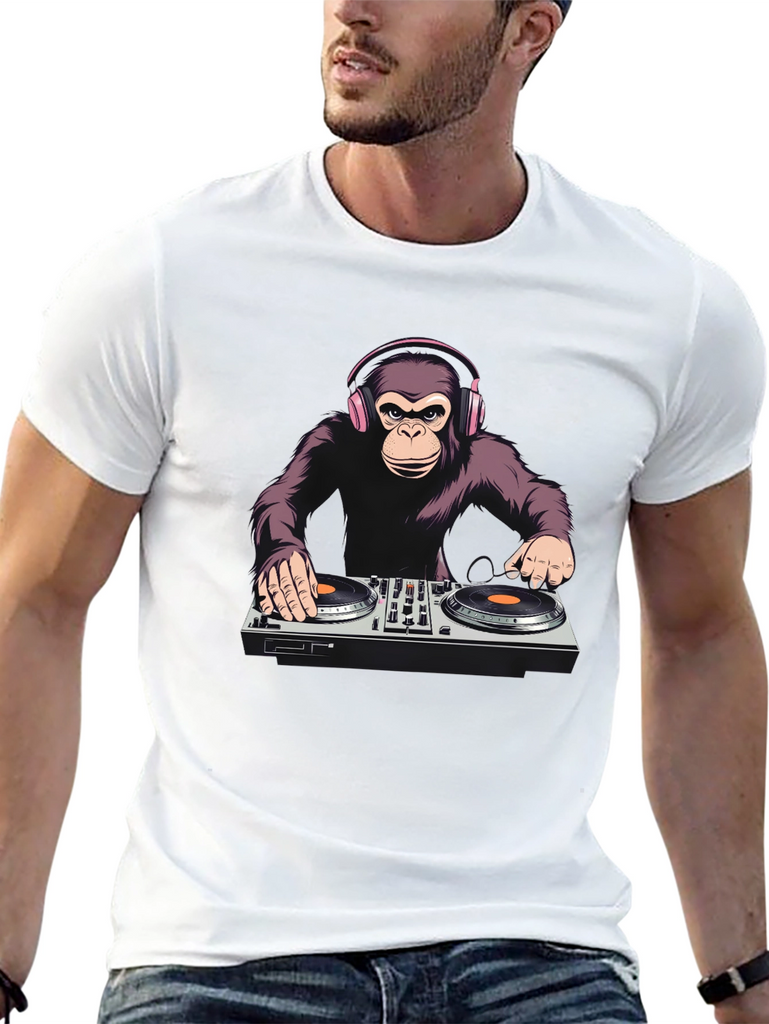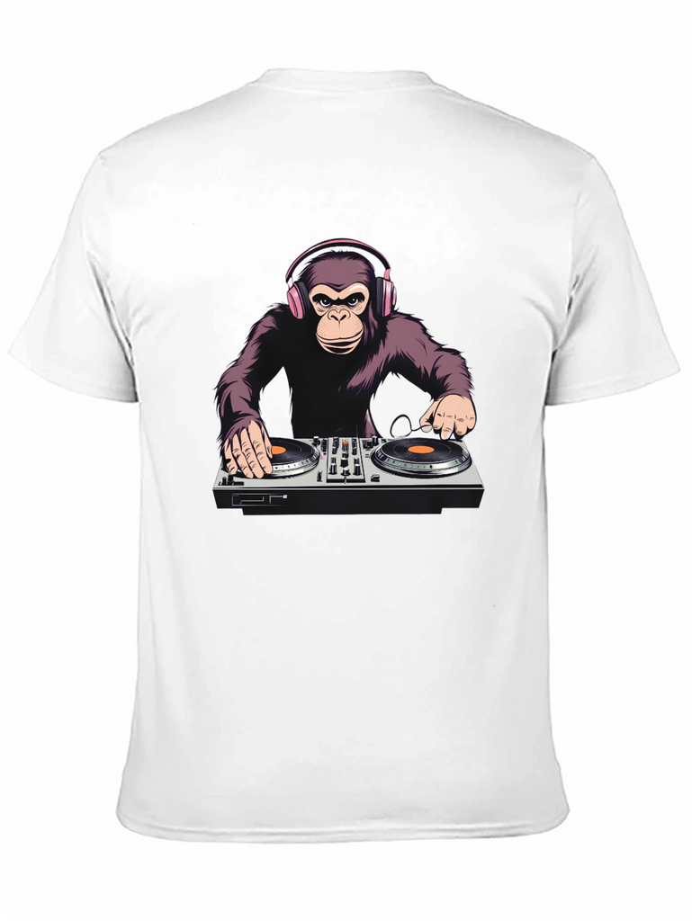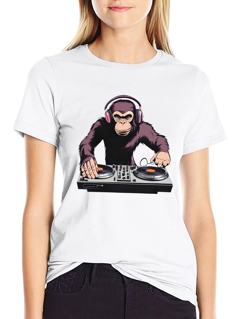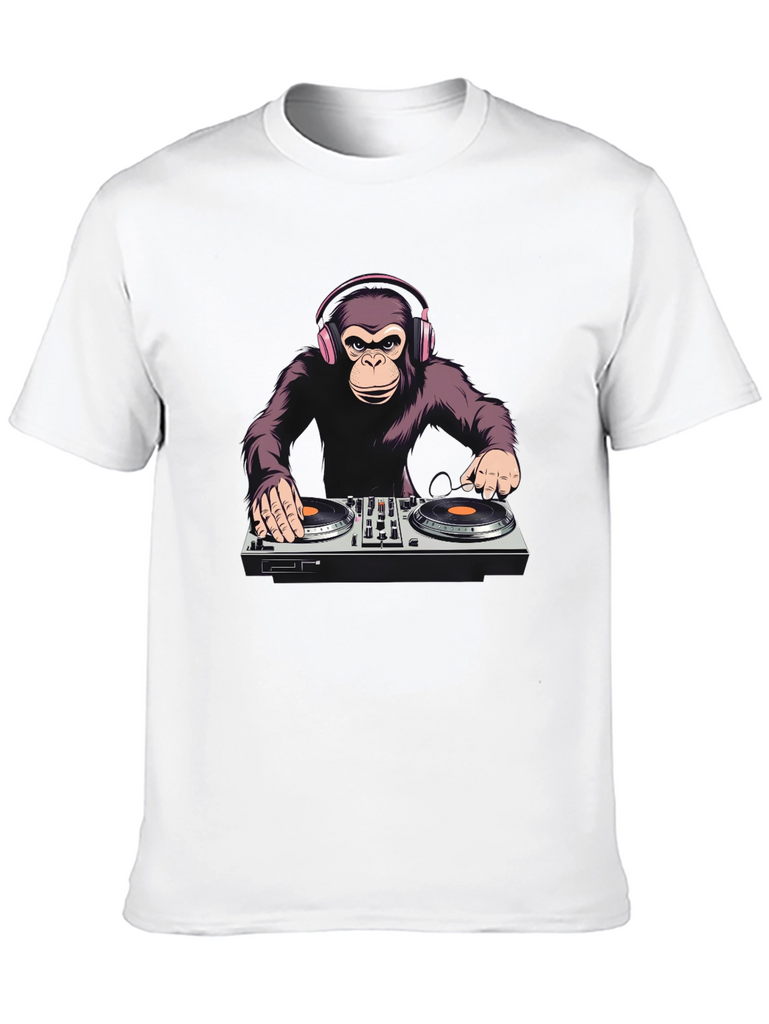 Rock a unique style with this black DJ Monkey T-shirt. This eye-catching tee features a cool graphic of a chimpanzee wearing pink headphones and mixing on a turntable. Made from soft and comfortable fabric, this shirt is perfect for casual wear and music lovers. It's a great conversation starter and a fun addition to any wardrobe. Wear it to concerts, parties, or just chilling with friends. Get ready to turn heads with this one-of-a-kind t-shirt!