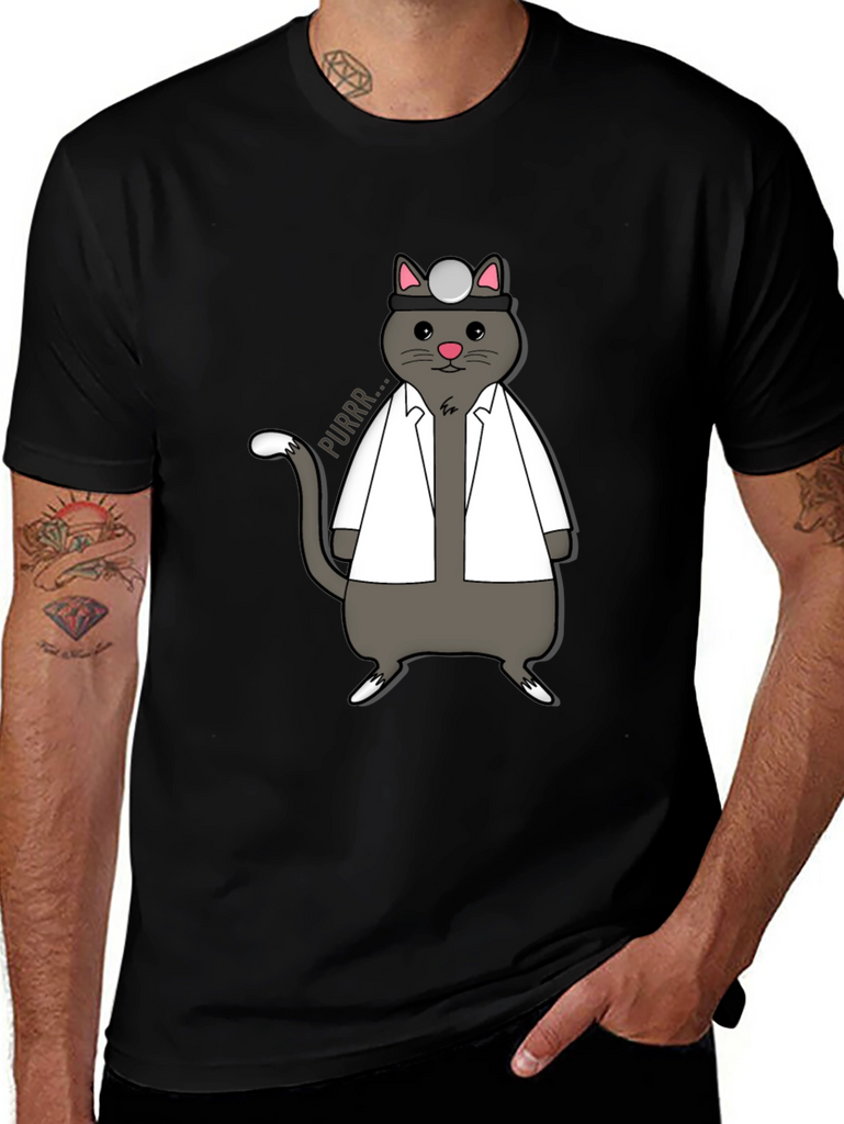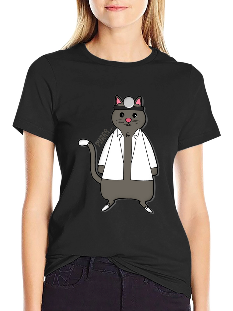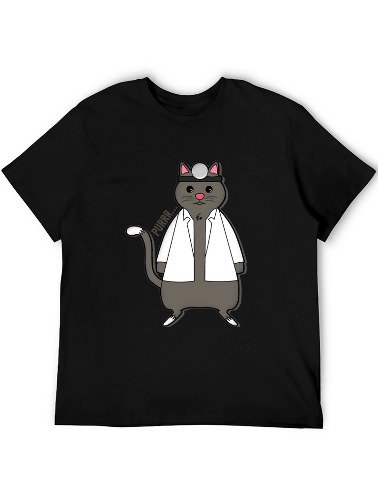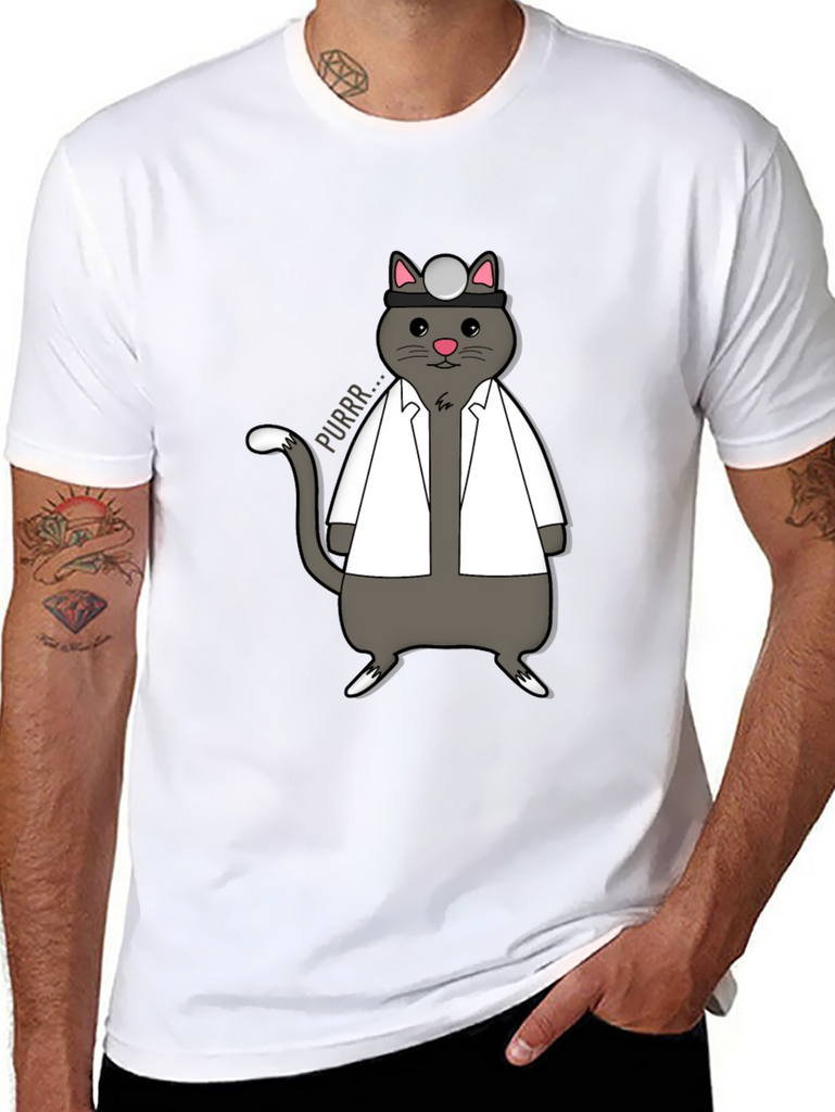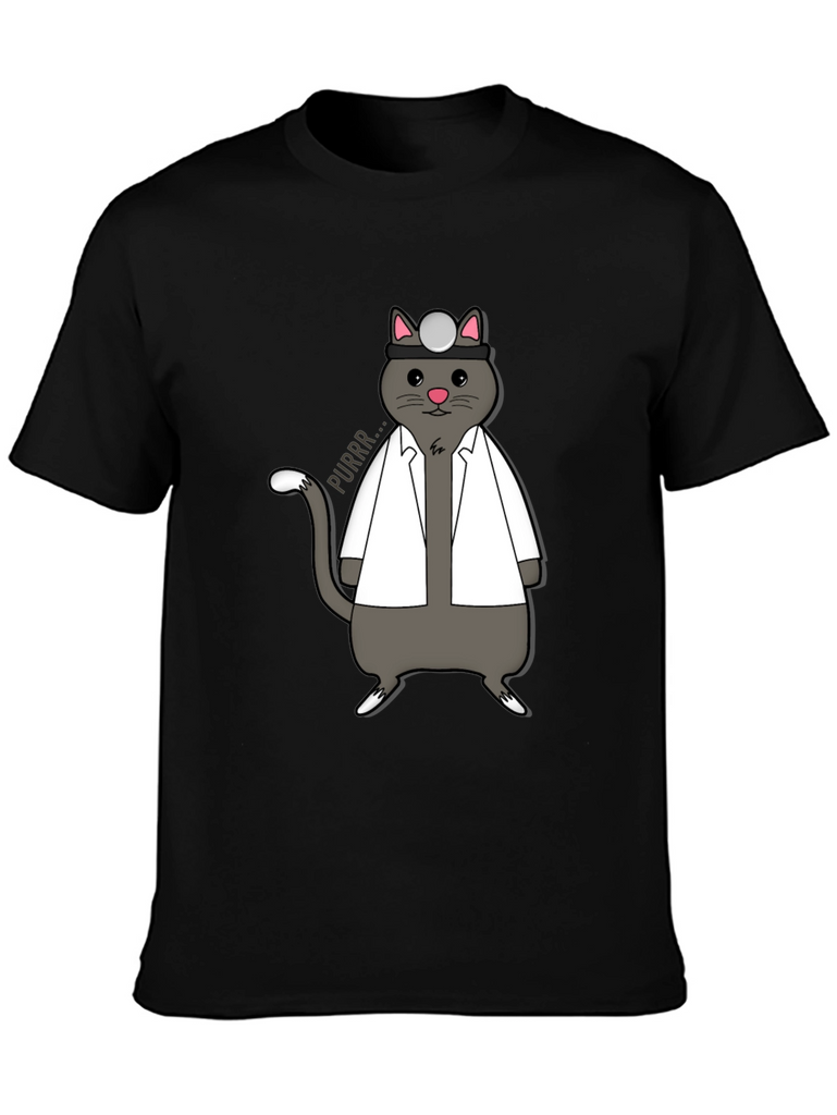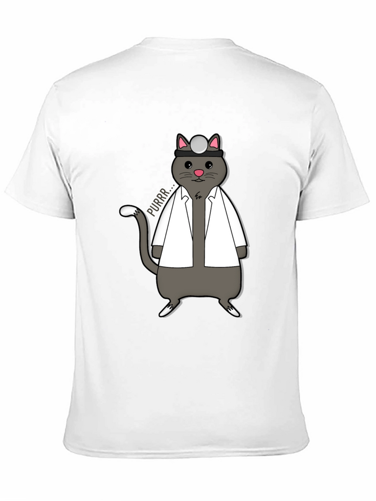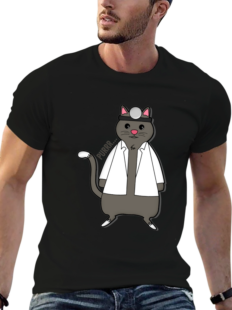 Show off your love for cats and medicine with this unique t-shirt! The design features an adorable gray cat dressed as a doctor, complete with a white coat and head mirror. The cat is humorously drawn with a cute expression and a speech bubble that says "Purrr...". This shirt is perfect for veterinarians, medical students, or anyone who appreciates a good pun. Made from a comfortable fabric, this tee is ideal for casual wear, medical themed events, or as a gift for the cat-loving doctor in your life. Add a touch of whimsy to your wardrobe with this purr-fect shirt!