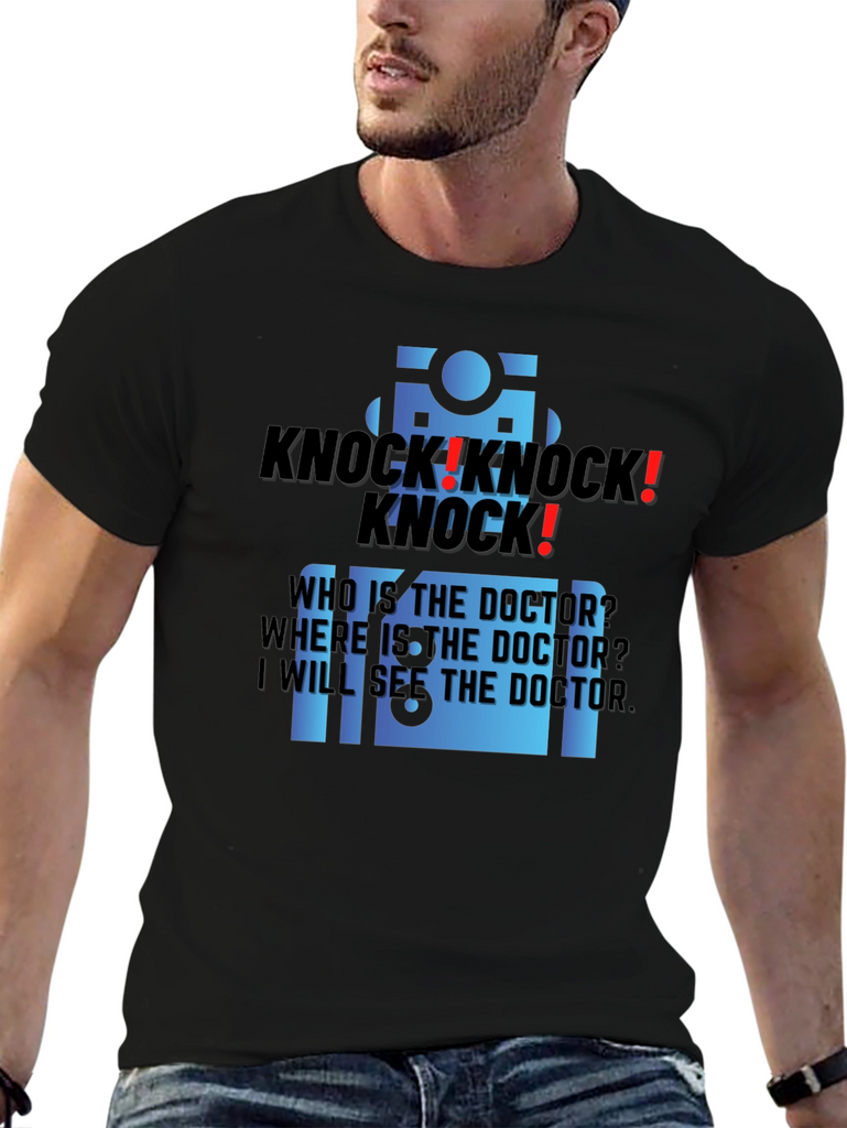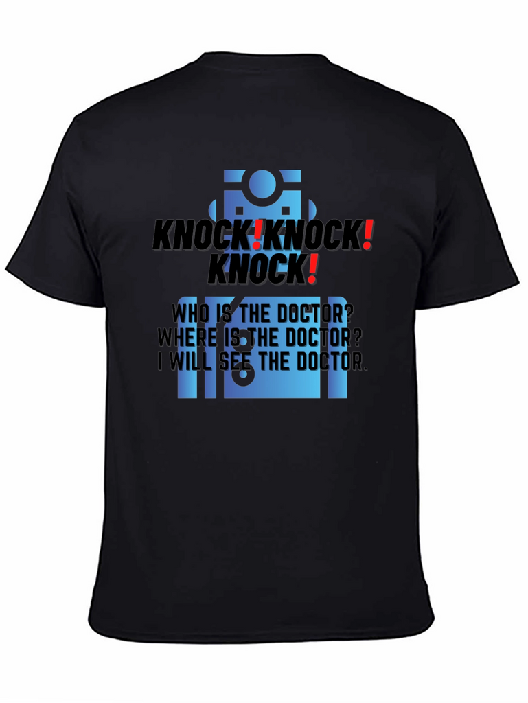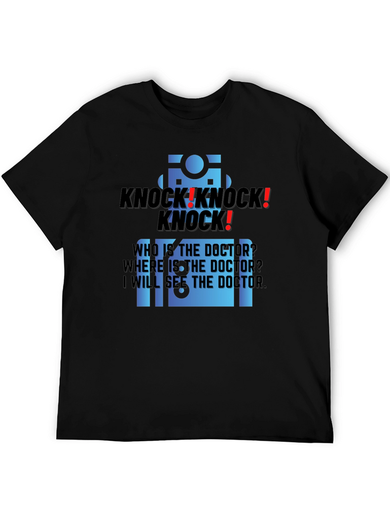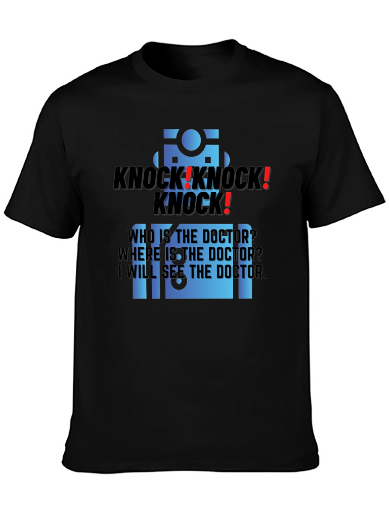 Show off your love for Doctor Who with this unique black t-shirt. The shirt features a vibrant blue design resembling a TARDIS, overlaid with the text "KNOCK KNOCK!" in bold black lettering and "WHO IS THE DOCTOR? WHERE IS THE DOCTOR? I WILL SEE THE DOCTOR." The combination of the iconic TARDIS shape and the playful text makes this shirt a standout piece for any fan. Perfect for casual wear, conventions, or as a gift for the Doctor Who enthusiast in your life. Embrace your inner Whovian with this comfortable and eye-catching tee!