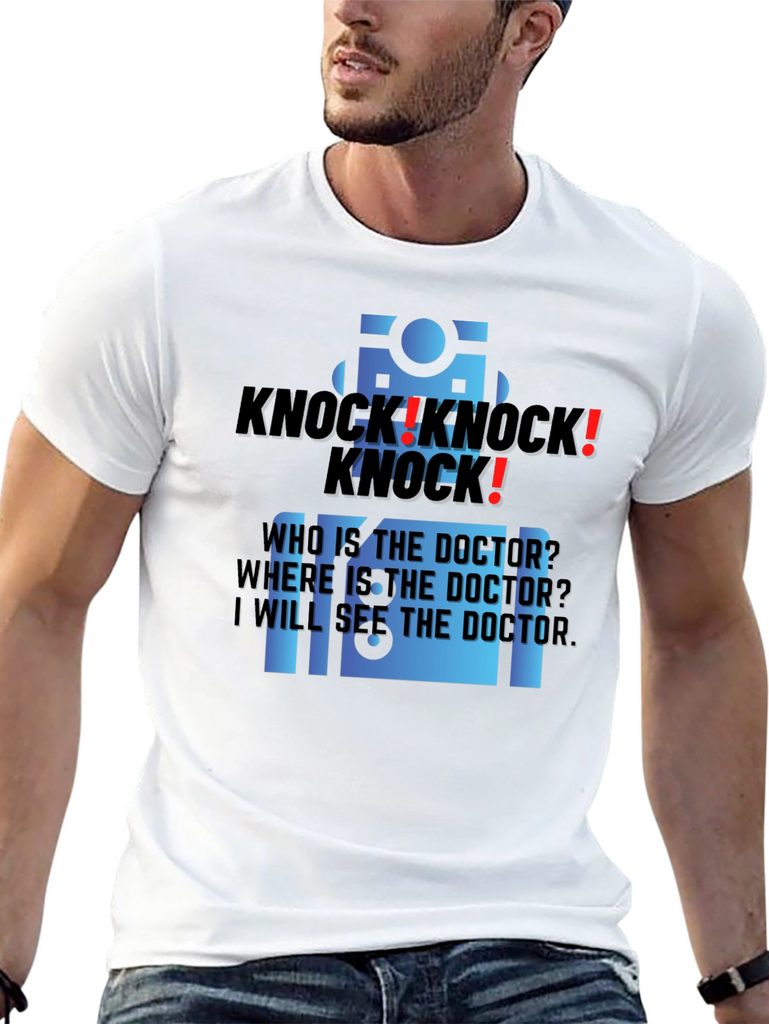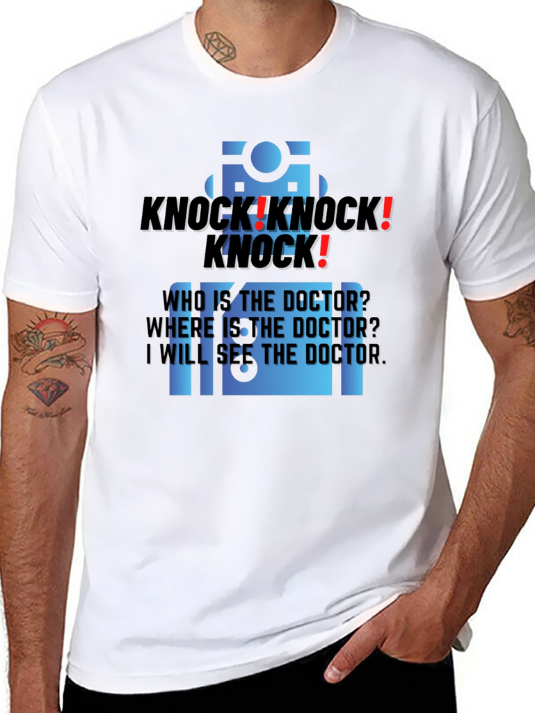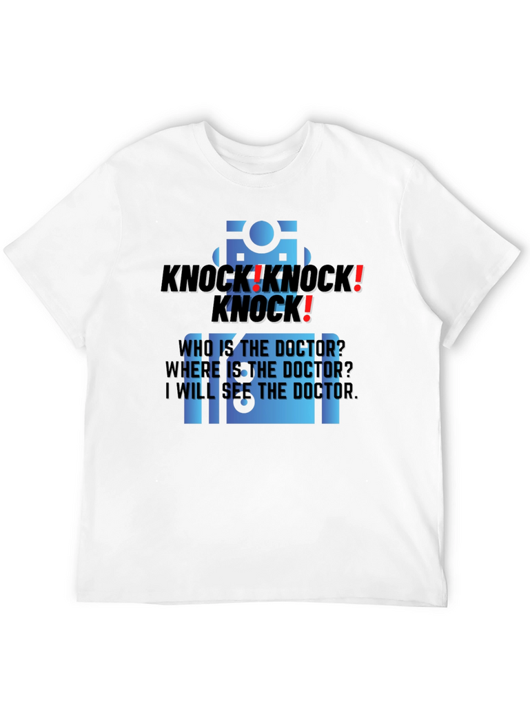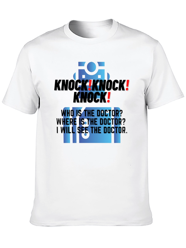 Show off your love for Doctor Who with this unique black t-shirt. The shirt features a vibrant blue design resembling a TARDIS, overlaid with the text "KNOCK KNOCK!" in bold black lettering and "WHO IS THE DOCTOR? WHERE IS THE DOCTOR? I WILL SEE THE DOCTOR." The combination of the iconic TARDIS shape and the playful text makes this shirt a standout piece for any fan. Perfect for casual wear, conventions, or as a gift for the Doctor Who enthusiast in your life. Embrace your inner Whovian with this comfortable and eye-catching tee!