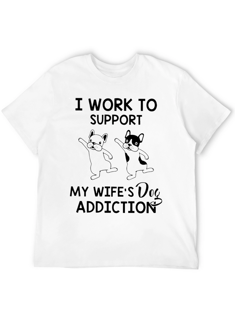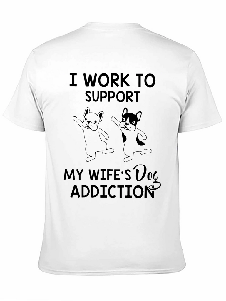 This black t-shirt features a humorous design with the words "I WORK TO SUPPORT MY WIFE'S Dog ADDICTION", perfect for dog lovers. The shirt also showcases two cute cartoon dogs. Made from a soft, comfortable fabric, this tee is ideal for casual wear. Wear it to the dog park, running errands, or lounging at home. It's also a great conversation starter and makes a unique gift for husbands with wives who are dog enthusiasts. Show your love for your wife and her furry friends with this fun and relatable t-shirt.