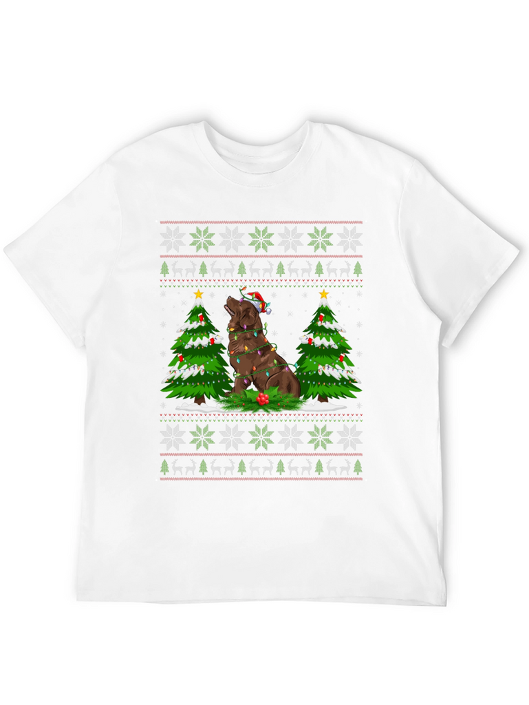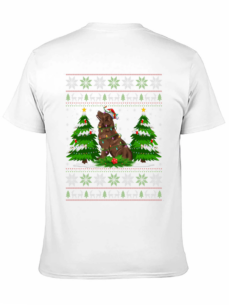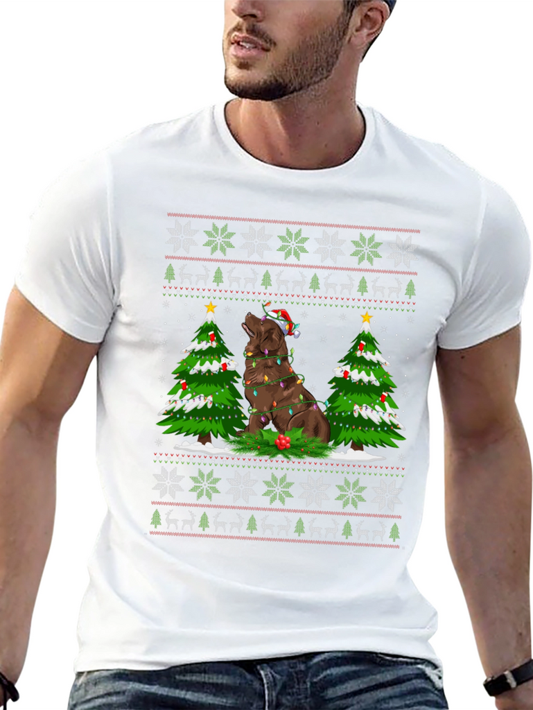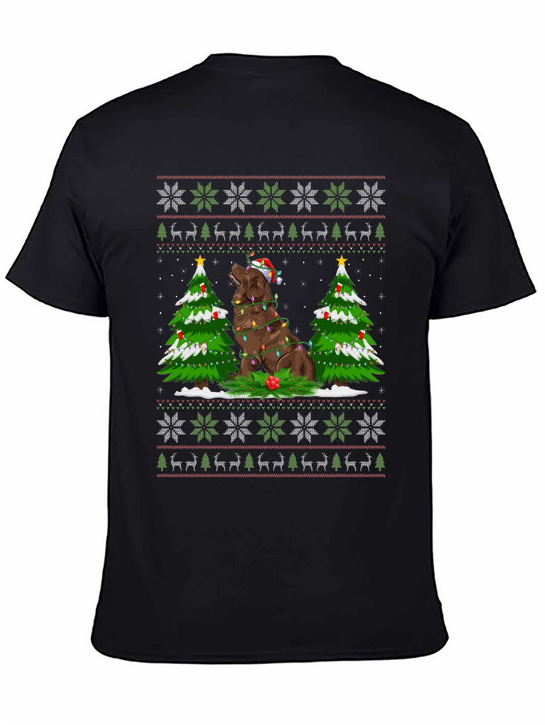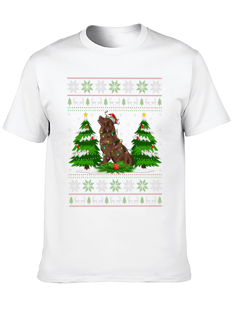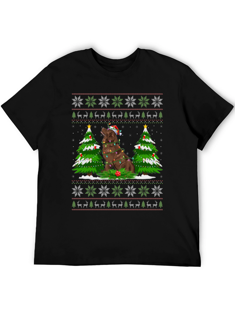 This festive black t-shirt features a playful 'ugly Christmas sweater' design. It showcases a charming brown dog wearing a Santa hat, playfully tangled in string lights and set between two decorated Christmas trees. The design incorporates holiday-themed snowflakes and reindeer for an added touch of seasonal cheer. Made from a comfortable fabric blend, this shirt is perfect for casual holiday gatherings, parties, or simply spreading Christmas joy. It's a fun and unique alternative to traditional sweaters. Wear this novelty tee and get ready to celebrate the holidays with a touch of humor!