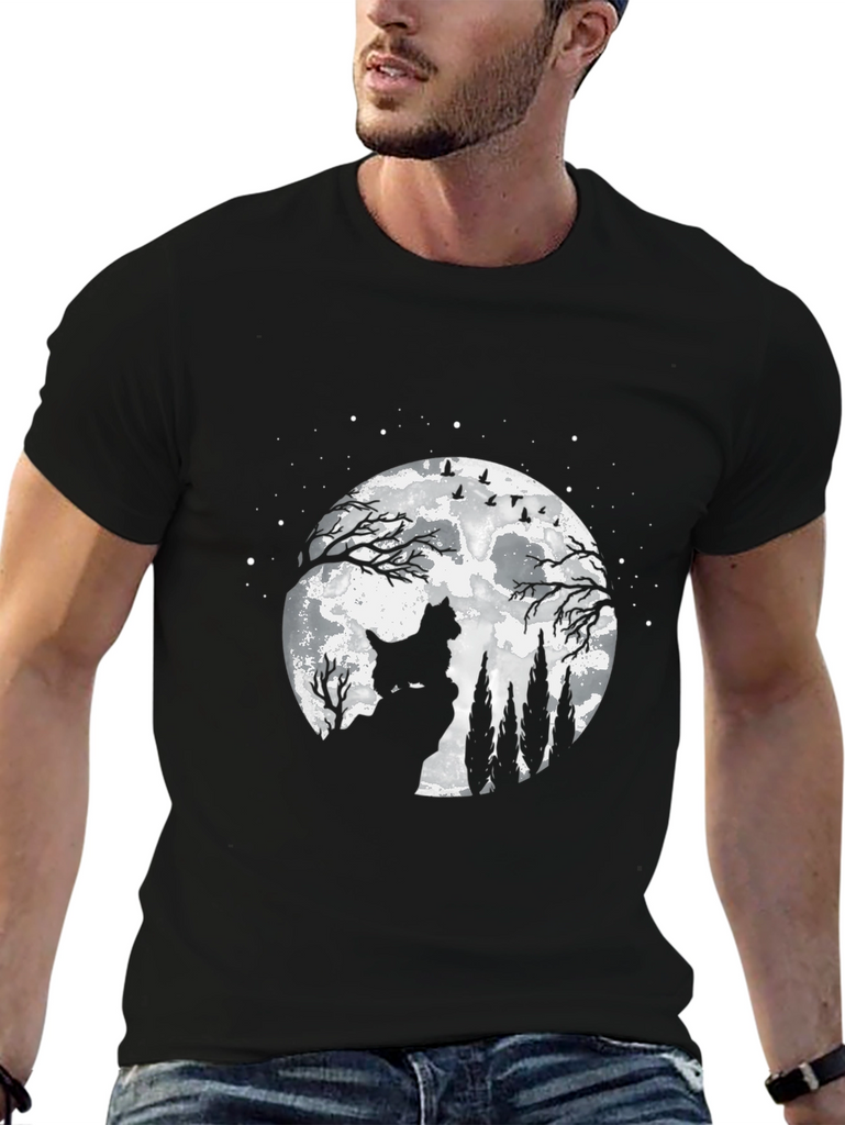 Show your love for dogs with this stylish black t-shirt. The shirt features a graphic of a dog standing on a cliff under a full moon with silhouettes of trees and birds. Perfect for casual wear, this comfortable t-shirt is sure to turn heads. Its unique design makes it ideal for dog lovers and anyone who appreciates nature-inspired artwork. Dress it up or down and embrace your love for dogs and the magic of the moonlit night.