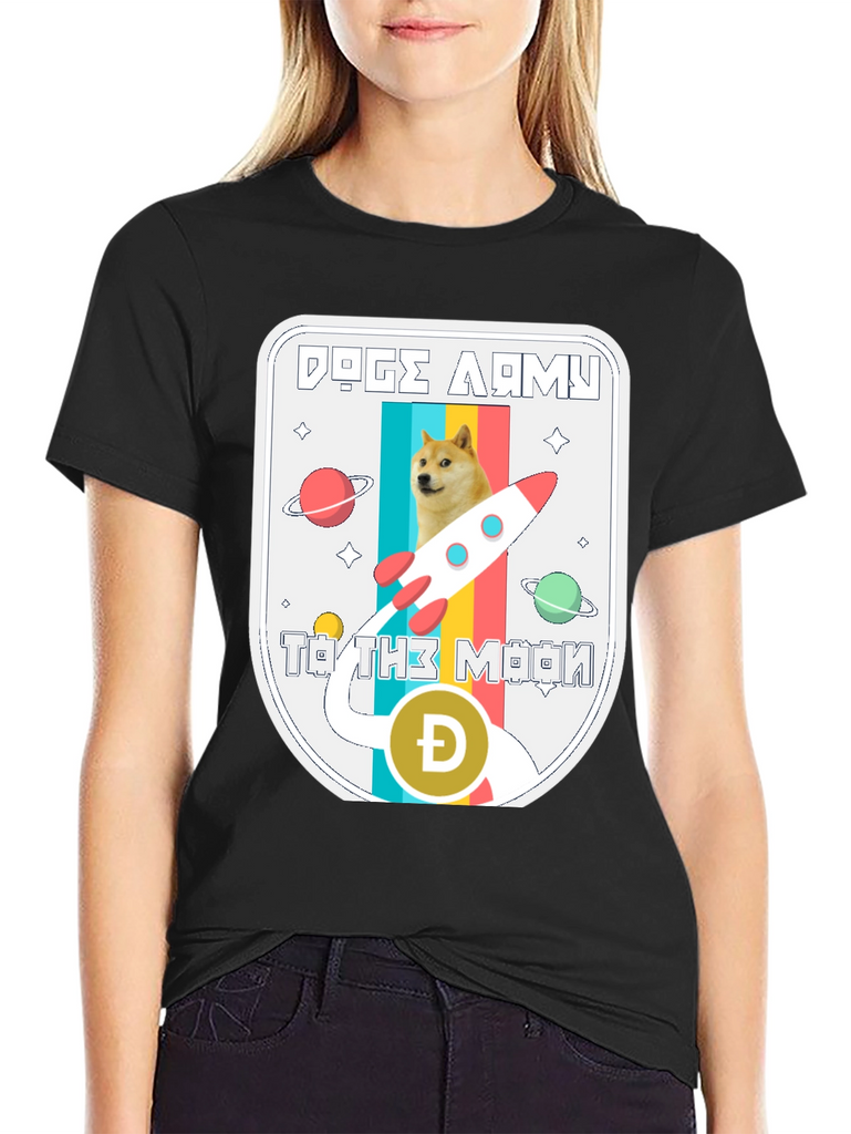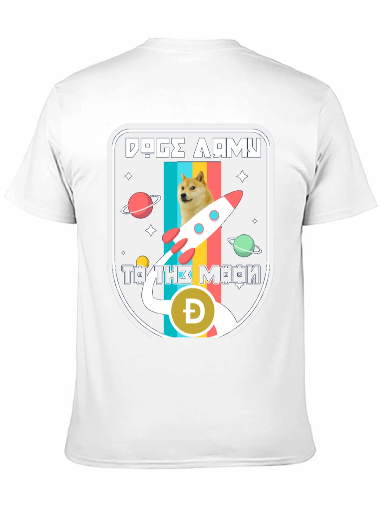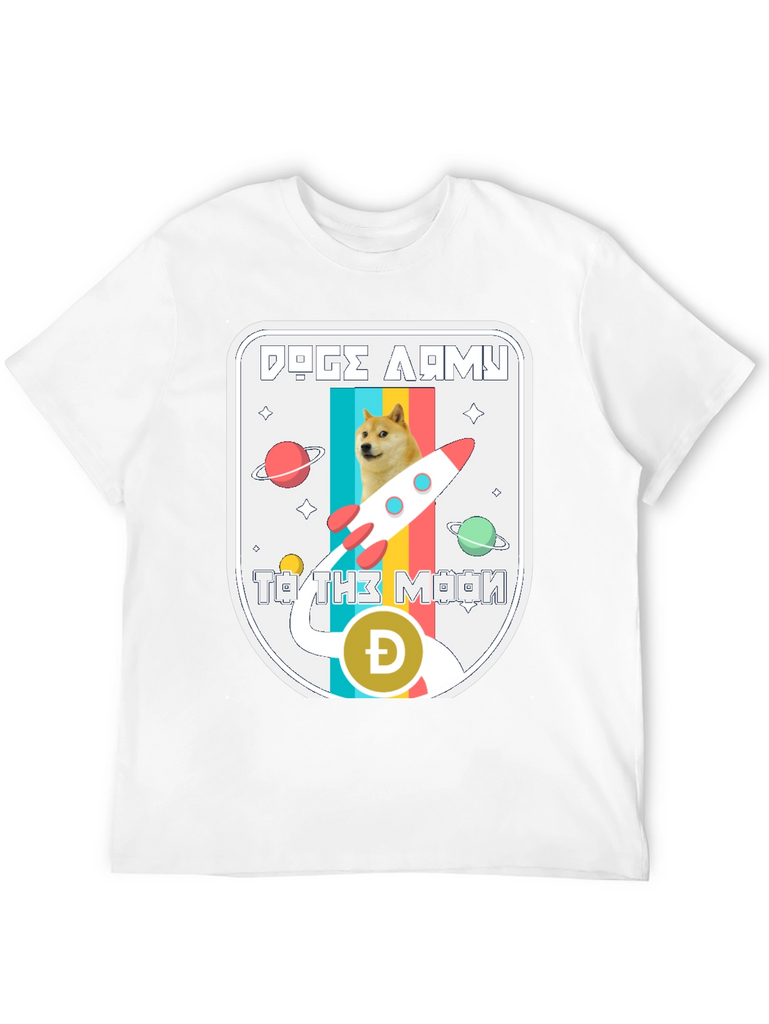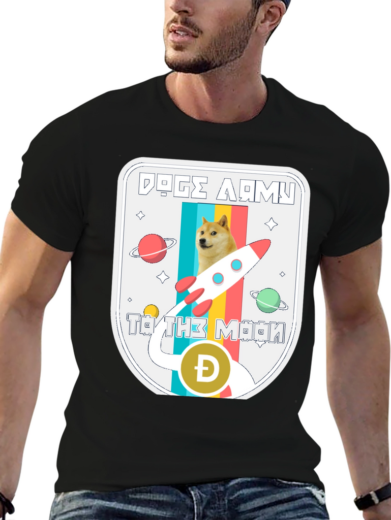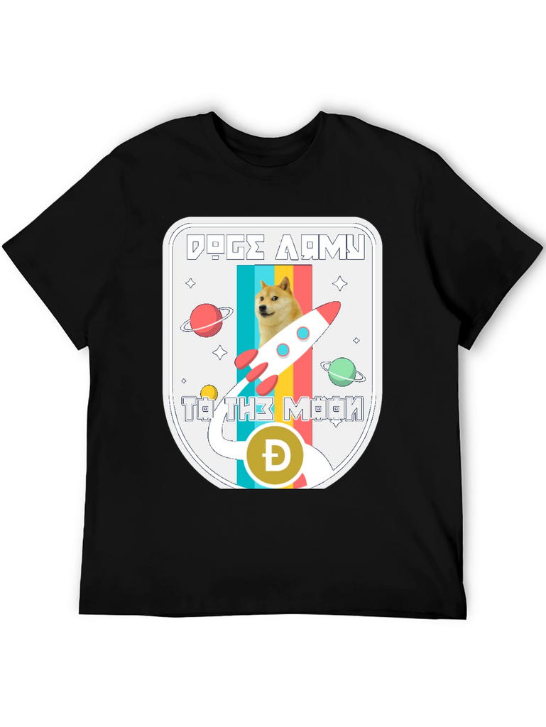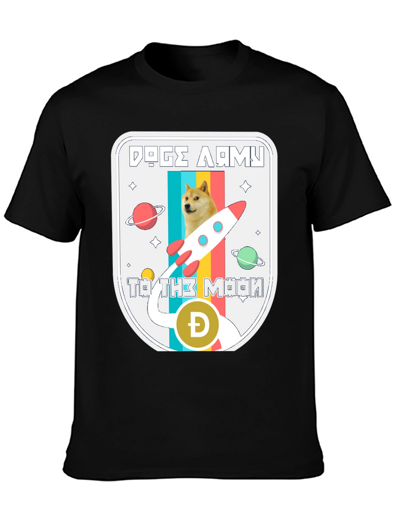 Show your love for Dogecoin with this eye-catching graphic tee! This black t-shirt features a colorful design with a Doge in a rocket surrounded by planets. The design includes "Doge Army" and "To The Moon" text. The shirt is made from a soft-looking fabric that appears comfortable and durable. Perfect for Dogecoin enthusiasts, crypto traders, or anyone who enjoys unique and fun graphic tees. Makes a great gift!
