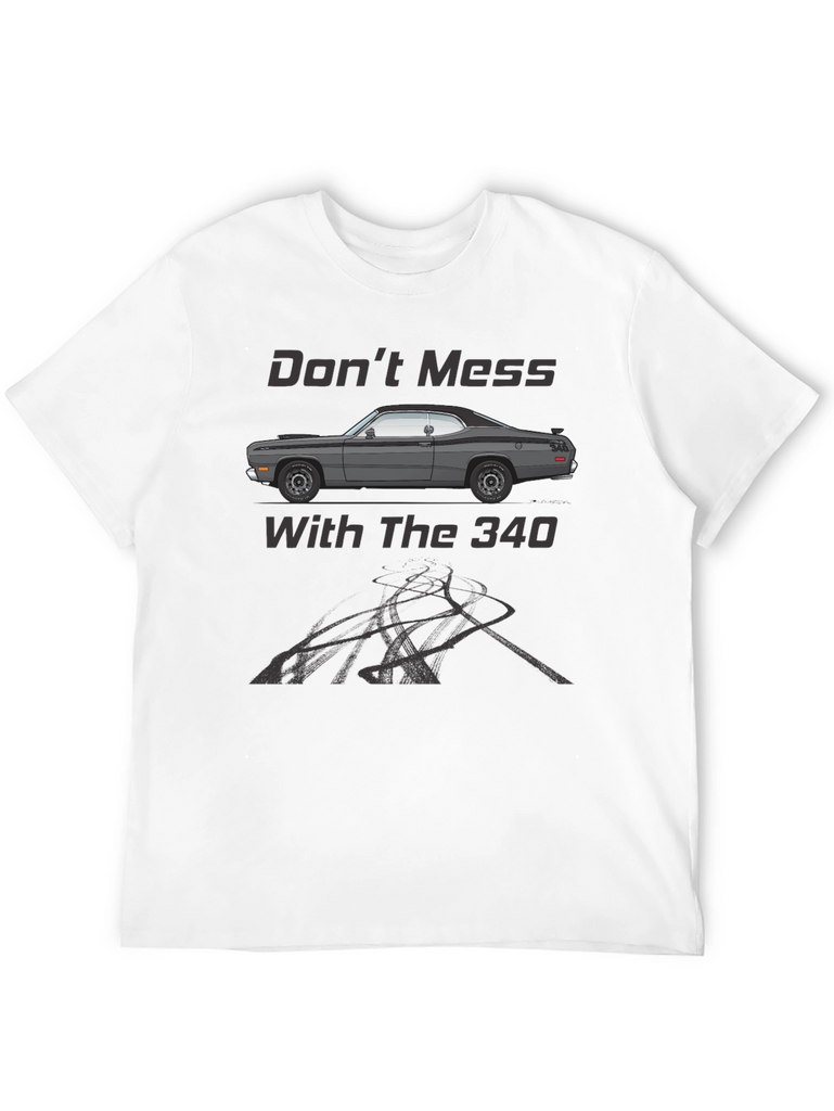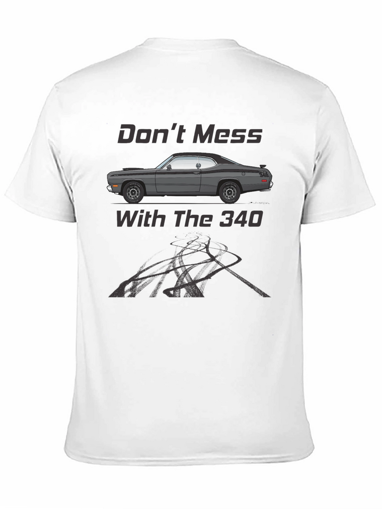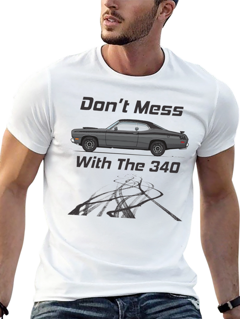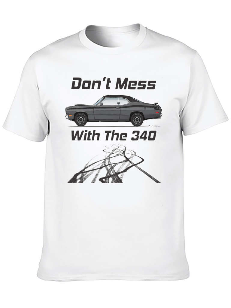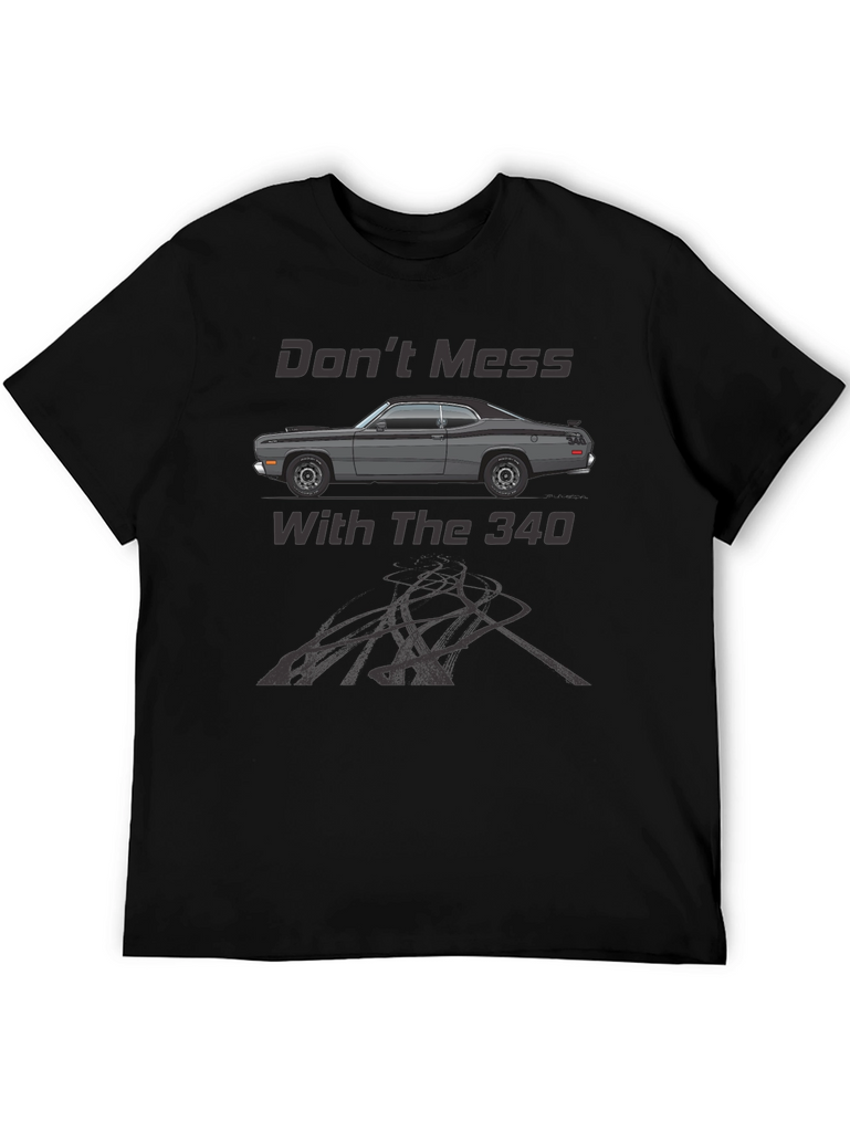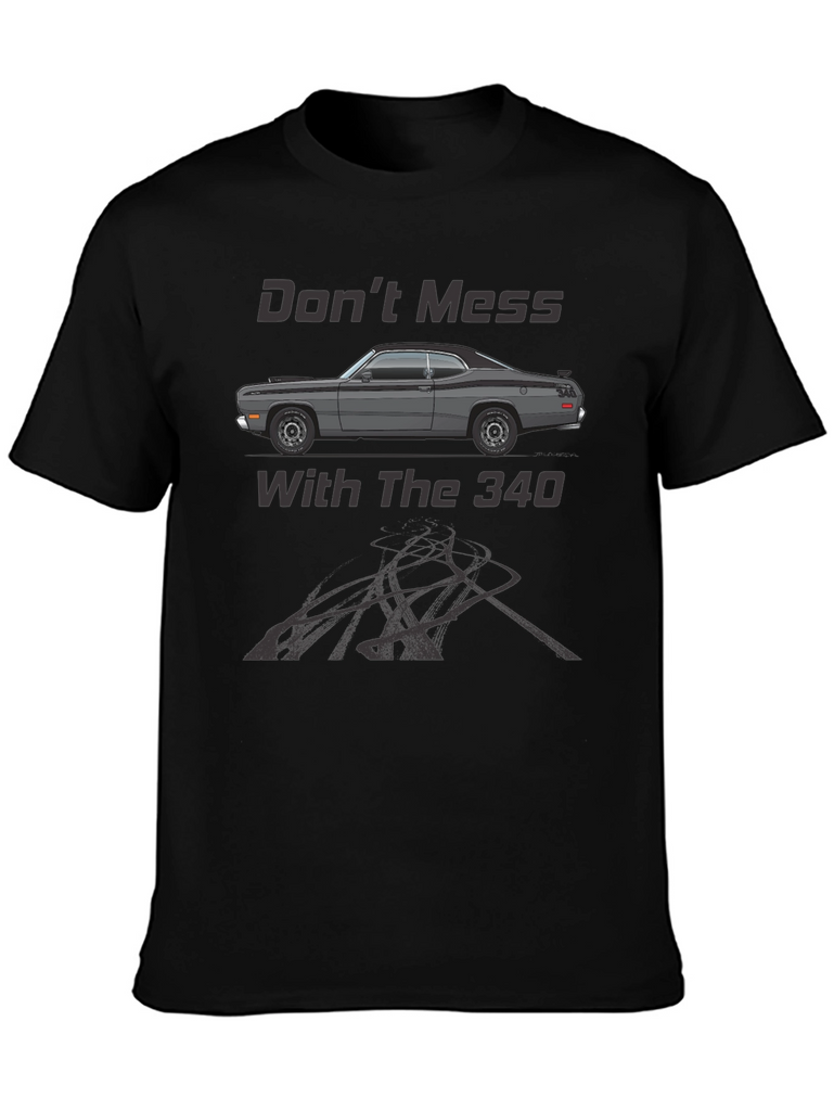 Show off your appreciation for classic cars with this stylish black t-shirt. The design features a sleek grey vintage car above the phrase "Don't Mess With the 340," suggesting a powerful engine. Skid marks underneath the car illustration further emphasize the vehicle's performance capabilities. Made from a comfortable, breathable fabric, this t-shirt is perfect for car enthusiasts, casual wear, or as a conversation starter at car shows and events. It combines a love for vintage automobiles with a bold statement, making it a must-have addition to any car lover's wardrobe.