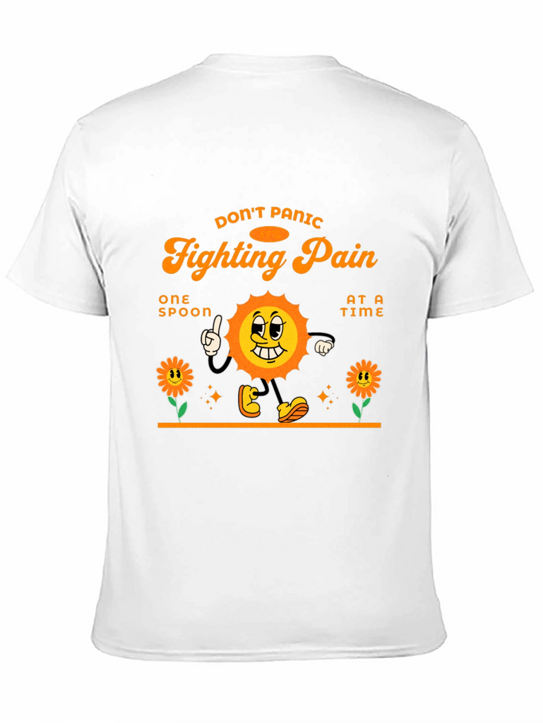 This black t-shirt features a retro-style cartoon design that is both eye-catching and uplifting. The design includes a smiling sun character and sunflowers, accompanied by the phrase 'Don't Panic Fighting Pain, One Spoon at a Time'. The playful and comforting message makes this shirt perfect for those who want to spread positivity and inspire others. Made from a soft and comfortable fabric, this t-shirt is suitable for everyday wear. Whether you're running errands, hanging out with friends, or simply relaxing at home, this t-shirt will keep you feeling stylish and motivated. It is a great conversation starter and a perfect gift for anyone who values resilience and a positive outlook.