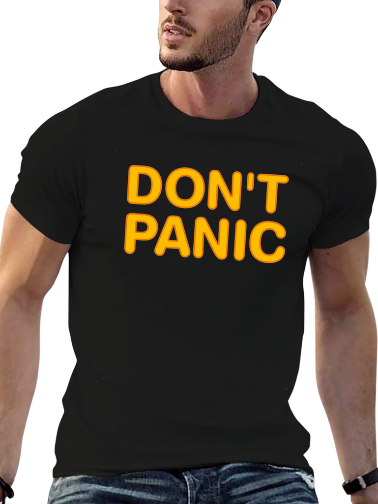 Stay calm and collected with this classic "Don't Panic" t-shirt. Made from soft, breathable fabric, this shirt is perfect for everyday wear. The bold, eye-catching graphic ensures you'll stand out from the crowd, while the comfortable fit keeps you feeling relaxed all day long. Whether you're running errands or simply lounging at home, this t-shirt is a must-have for anyone who appreciates humor and style. Embrace the mantra and add this unique piece to your wardrobe today!
