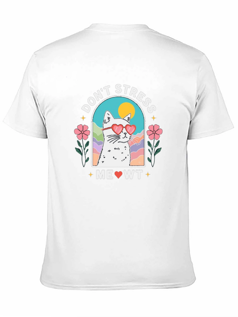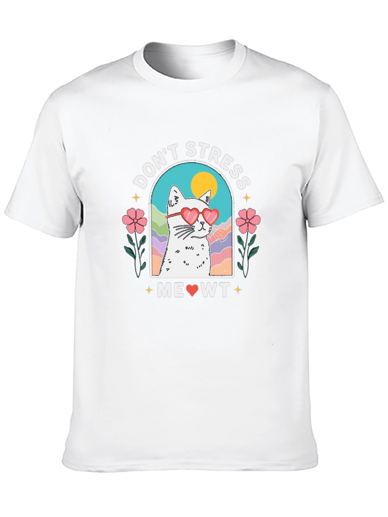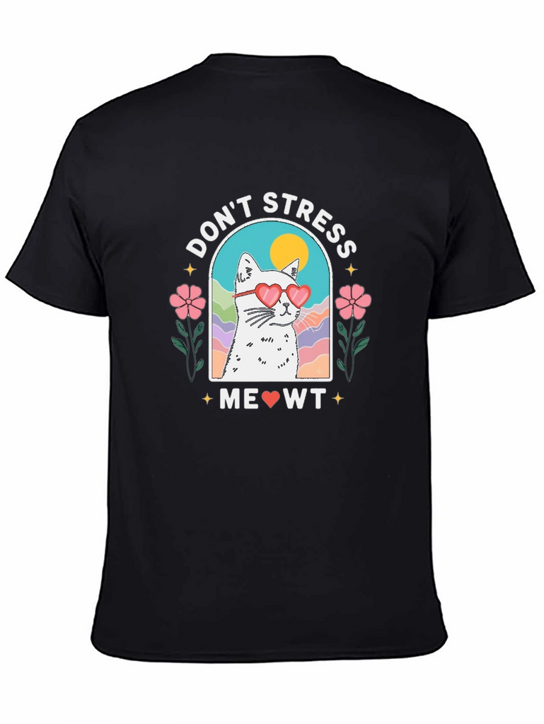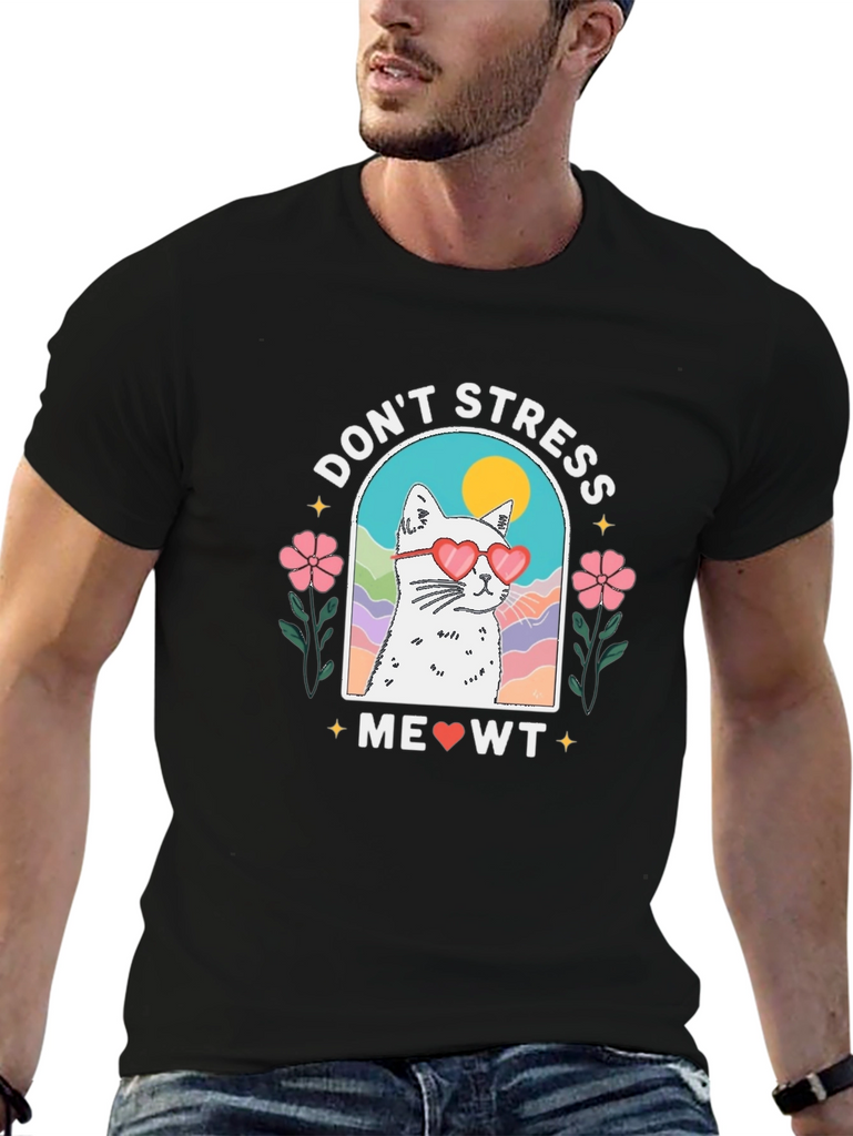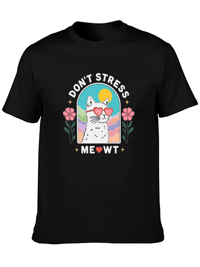 Show off your love for cats with this fun and stylish black t-shirt! Featuring a cute white cat wearing heart-shaped sunglasses, set against a retro-inspired landscape with a rising sun, framed by pink flowers. The phrase "Don't Stress Meowt" adds a playful touch. This tee is perfect for casual wear, cat lovers, or anyone who needs a reminder to relax. Made from a comfortable-looking fabric, this shirt is sure to become a wardrobe favorite. Ideal for everyday wear, lounging at home, or as a gift for the cat enthusiast in your life!