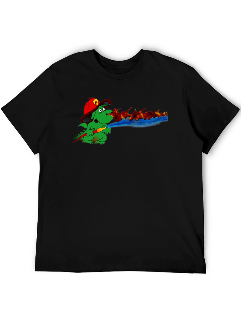 This fun black t-shirt features a cartoon dragon wearing a firefighter's hat and extinguishing a fire with a hose. The playful design is perfect for anyone who loves dragons, firefighters, or whimsical graphics. Made from a comfortable, breathable fabric, this shirt is ideal for everyday wear. Show off your unique sense of humor with this eye-catching tee! This t-shirt is sure to be a conversation starter and a favorite addition to your wardrobe. Great for casual outings, themed events, or just lounging around. A cool, comfortable and fun addition to any wardrobe!