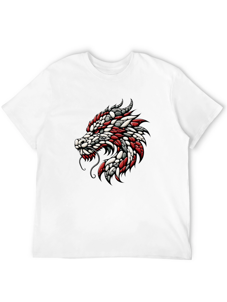 Showcase your unique style with this striking black t-shirt. Featuring a bold, artistic dragon head graphic in shades of red, white, and grey, this tee is sure to turn heads. The detailed design gives the shirt an edgy, modern look. Made from comfortable materials, this crew neck t-shirt is perfect for casual wear, whether you're hanging out with friends or making a statement on your own. Pair it with jeans or shorts for a stylish and effortless look. Add some mythical flair to your wardrobe with this must-have graphic tee!