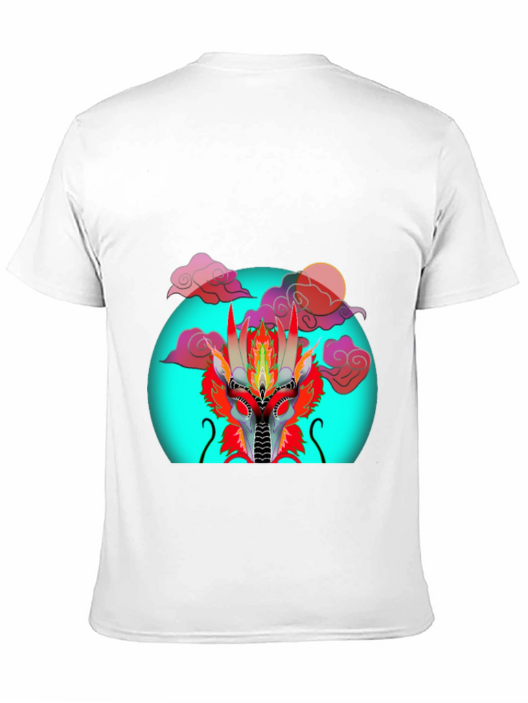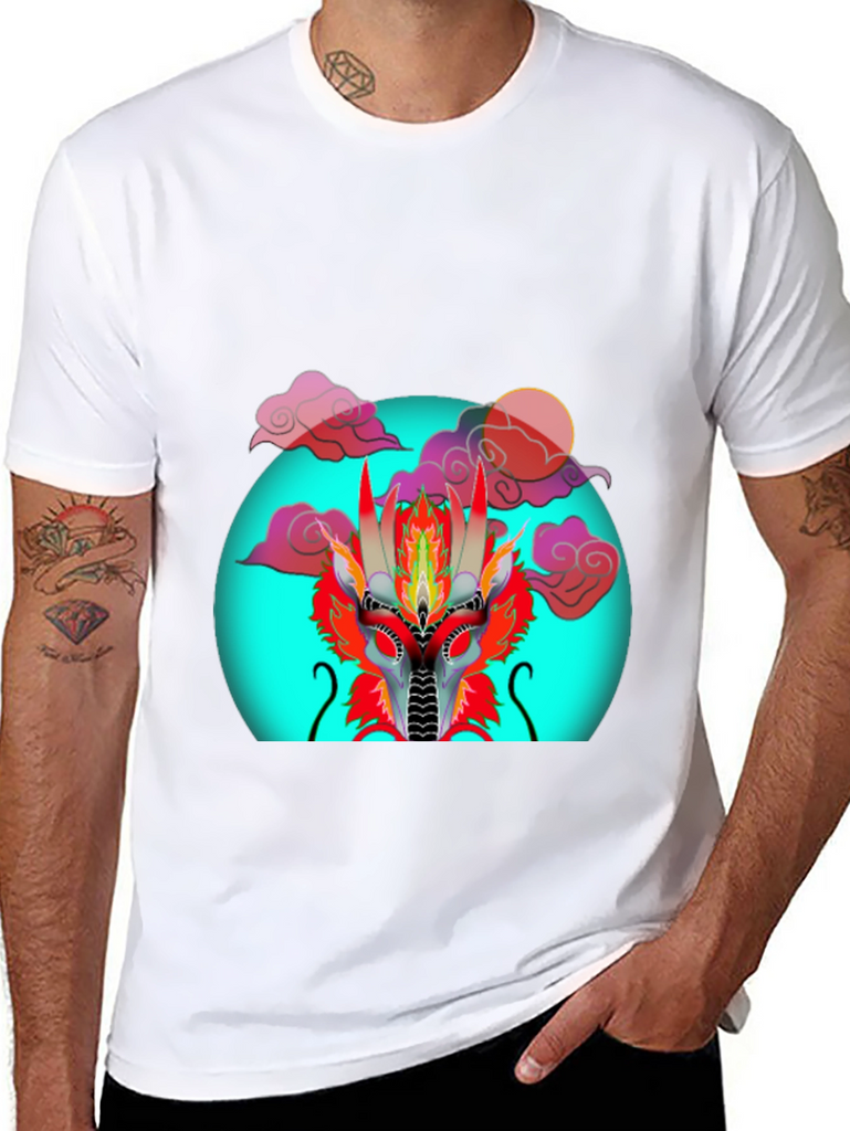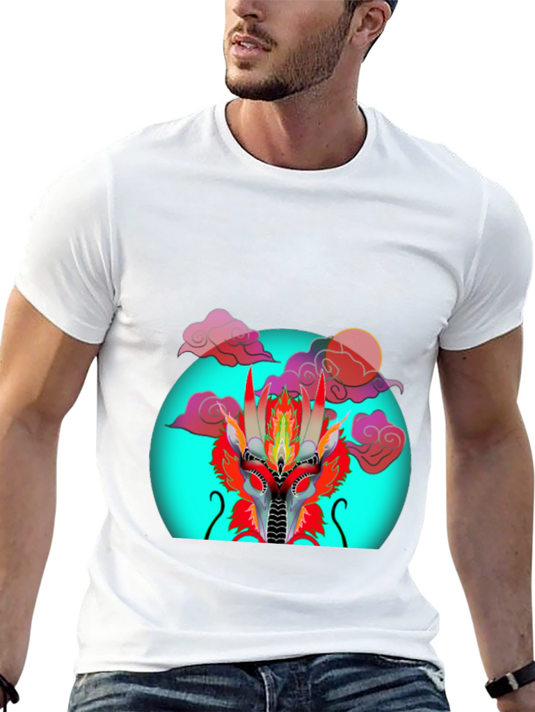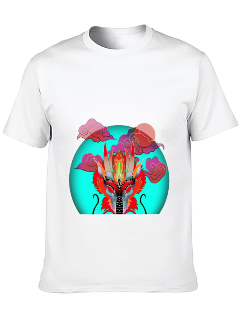 Elevate your style with this striking black t-shirt, featuring a bold dragon head graphic print. The design showcases vibrant colors and intricate details, with a mythical dragon set against a turquoise backdrop and accented by stylized clouds. Made from a comfortable, breathable fabric, this tee offers both style and comfort. Perfect for casual wear, concerts, or making a statement, this t-shirt is sure to turn heads. Add a touch of fantasy and unique flair to your wardrobe with this eye-catching piece.