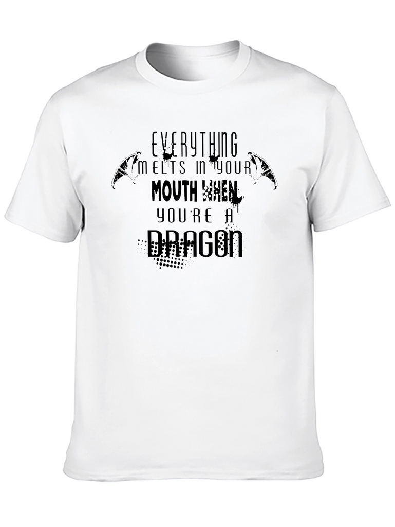 Unleash your inner dragon with this cool, black graphic tee! The shirt features a unique design with the saying "Everything melts in your mouth when you're a dragon". Made from comfortable, breathable fabric, this t-shirt is perfect for casual wear, gaming sessions, or expressing your love for mythical creatures. The dark print stands out boldly. This tee is a great conversation starter and a must-have for dragon enthusiasts. Available in various sizes.