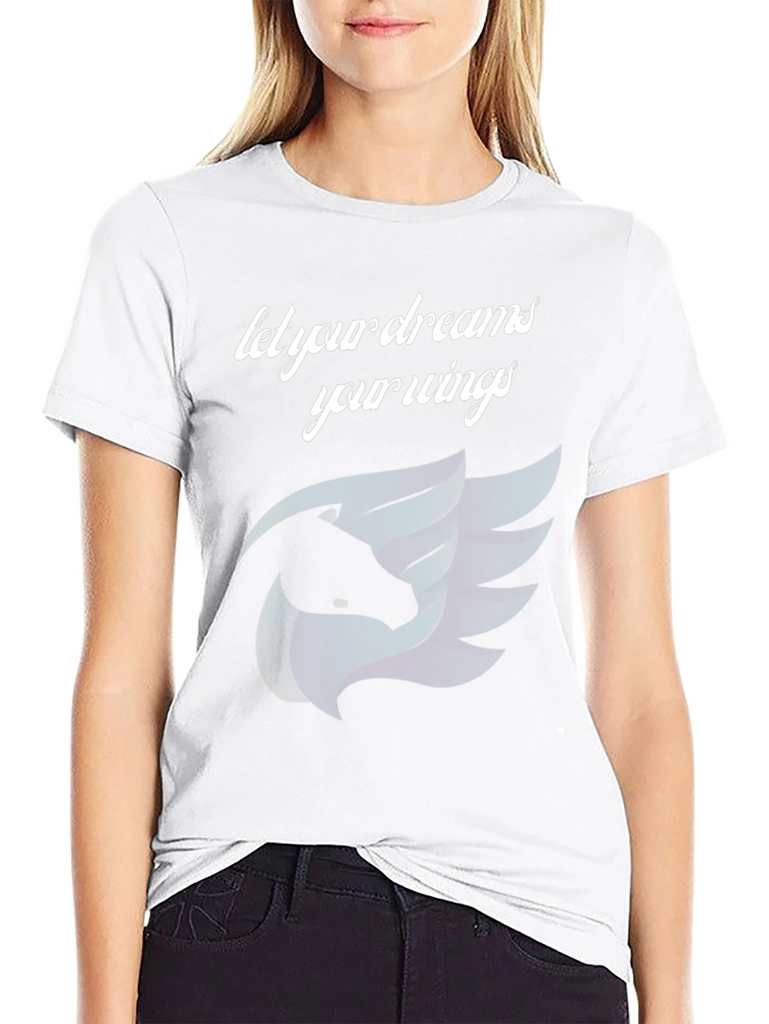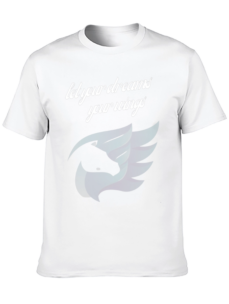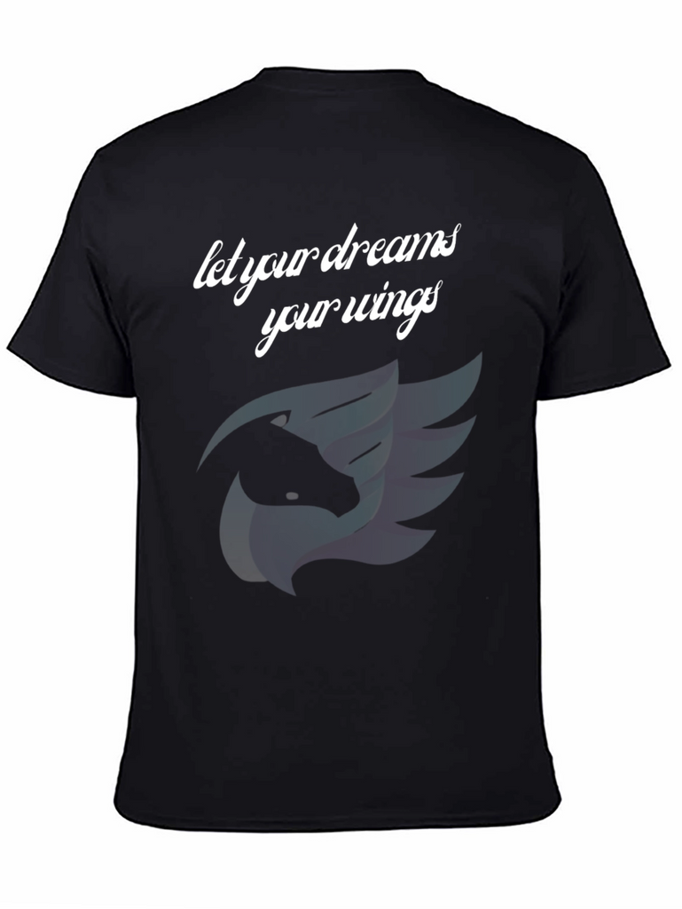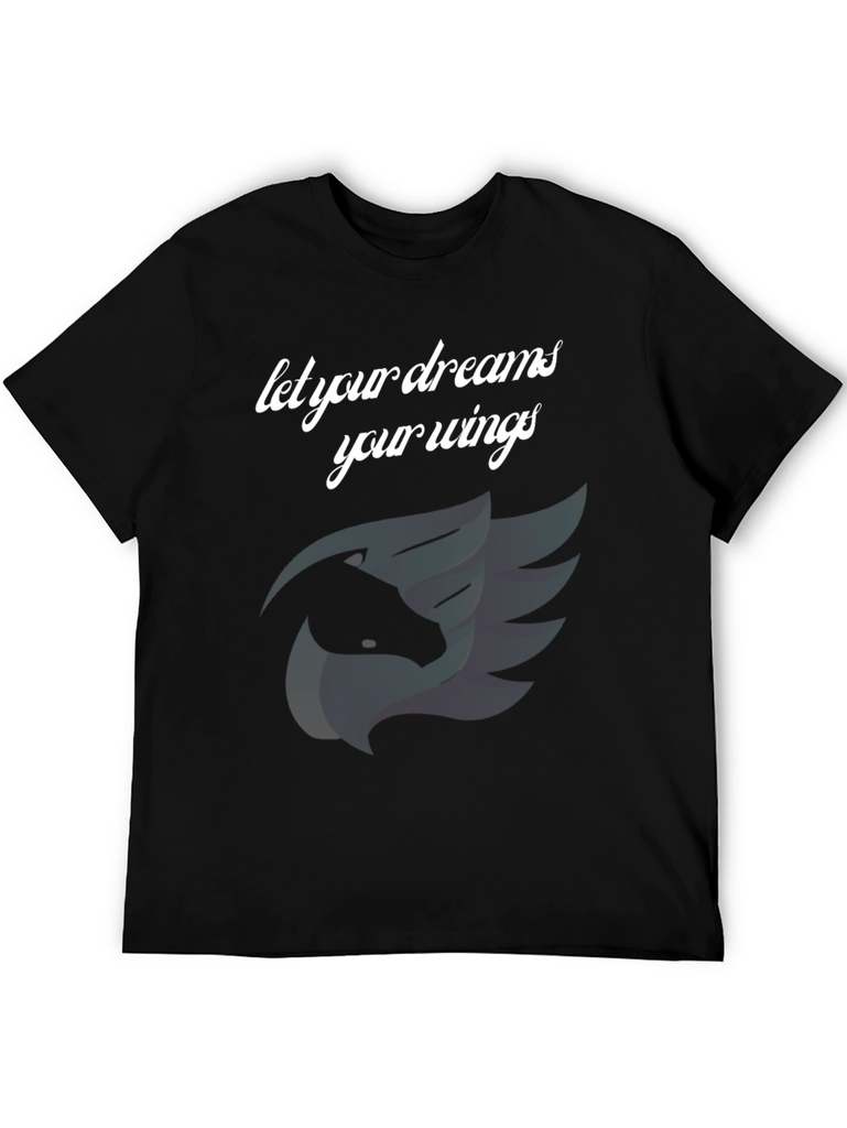 Soar above the ordinary with this unique graphic t-shirt. This black tee features a stylized Pegasus graphic, along with the inspiring phrase 'Let your dreams be your wings.' Crafted from a soft, breathable fabric, this shirt offers both comfort and style. The striking graphic adds a touch of individuality, making it perfect for casual wear or expressing your creative side. Ideal for dreamers, artists, or anyone seeking inspiration. Makes a thoughtful gift for anyone who needs encouragement to chase their dreams. This tee is a reminder to never give up!