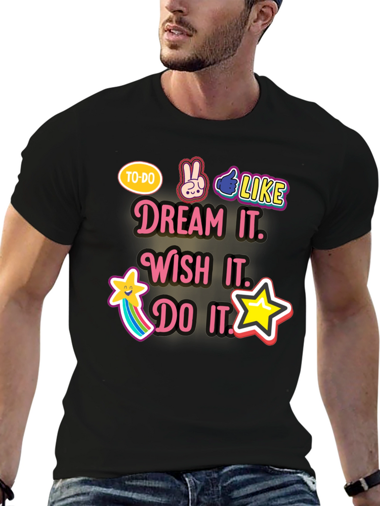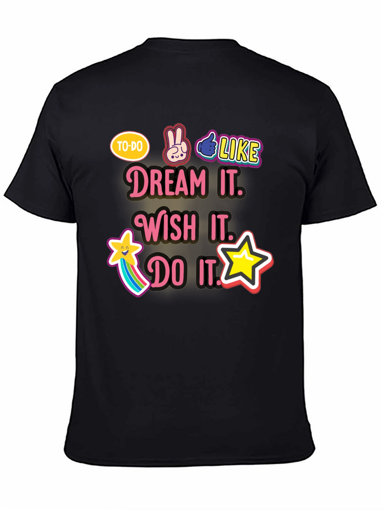This black graphic tee features motivational text, "Dream It. Wish It. Do It." with colorful, whimsical cartoon style graphics. A "TO-DO" circle, peace sign, thumbs up "LIKE", and stars adorn the text. The tee is likely made from a soft, comfortable material like cotton or a cotton blend, making it ideal for everyday wear. This shirt adds a playful touch to a casual outfit. Perfect for anyone who needs a reminder to chase their dreams!