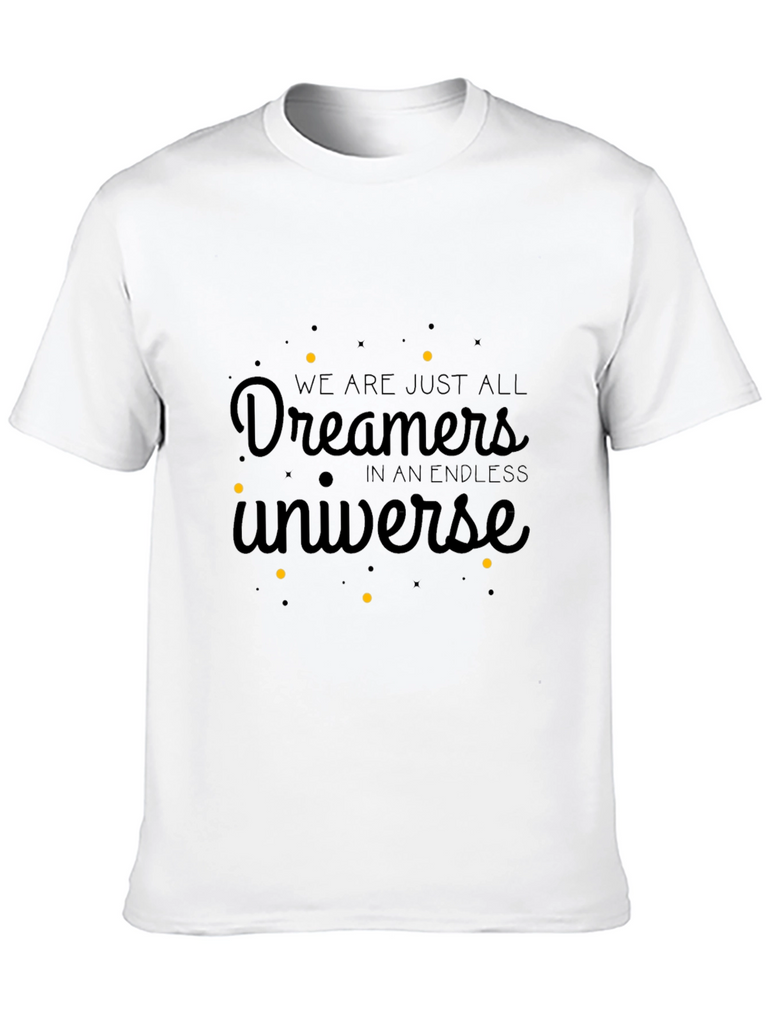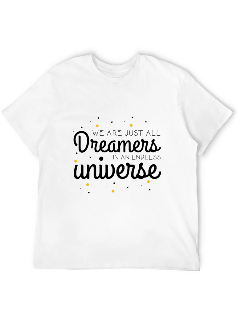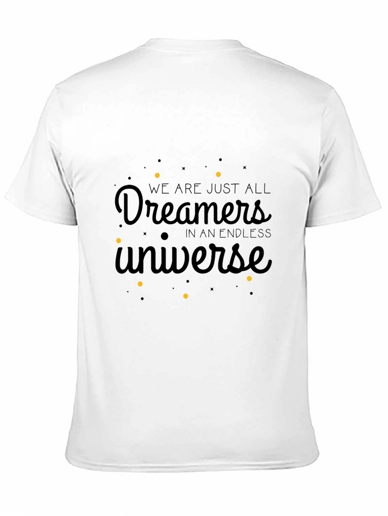 Embrace your inner dreamer with this stylish black t-shirt. Featuring the inspiring words 'We are just all Dreamers in an endless universe', this tee is perfect for expressing your creative spirit. The design is subtly accented with small yellow dots, adding a touch of whimsy. Made from comfortable materials, it's ideal for everyday wear, casual outings, or simply lounging at home. Let your imagination soar with this unique and eye-catching garment.
