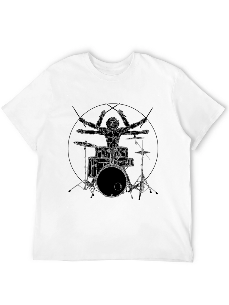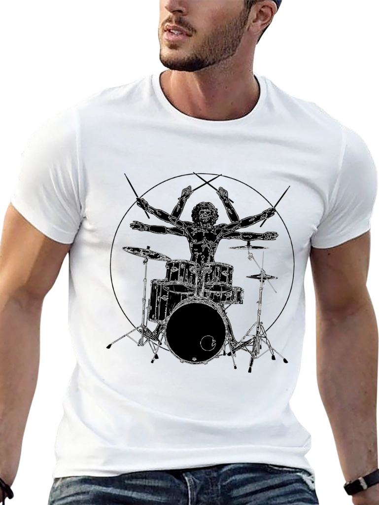Show off your love for drumming with this unique t-shirt! This stylish tee features a Vitruvian Man-inspired design, cleverly incorporating a drummer and drum kit. The graphic is printed in white on a black cotton t-shirt. This tee is perfect for band practice, concerts, or everyday wear. It's sure to be a conversation starter for musicians and art lovers alike. A must-have for any drummer's wardrobe, this shirt is a comfortable and stylish way to express your passion for music.