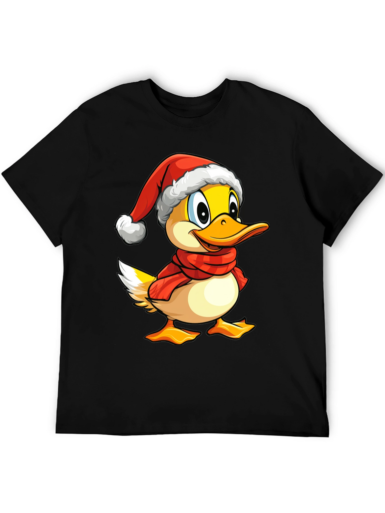 Spread some holiday cheer with this adorable black t-shirt featuring a cartoon duck wearing a Santa hat and a cozy red scarf. The duck graphic is vividly printed, adding a touch of whimsy to your wardrobe. Made from what appears to be a comfortable cotton blend, this tee is perfect for casual wear during the festive season. Show off your fun side at holiday gatherings, or simply wear it to add a bit of holiday spirit to your everyday look. A great gift for duck lovers and those who enjoy unique graphic tees.