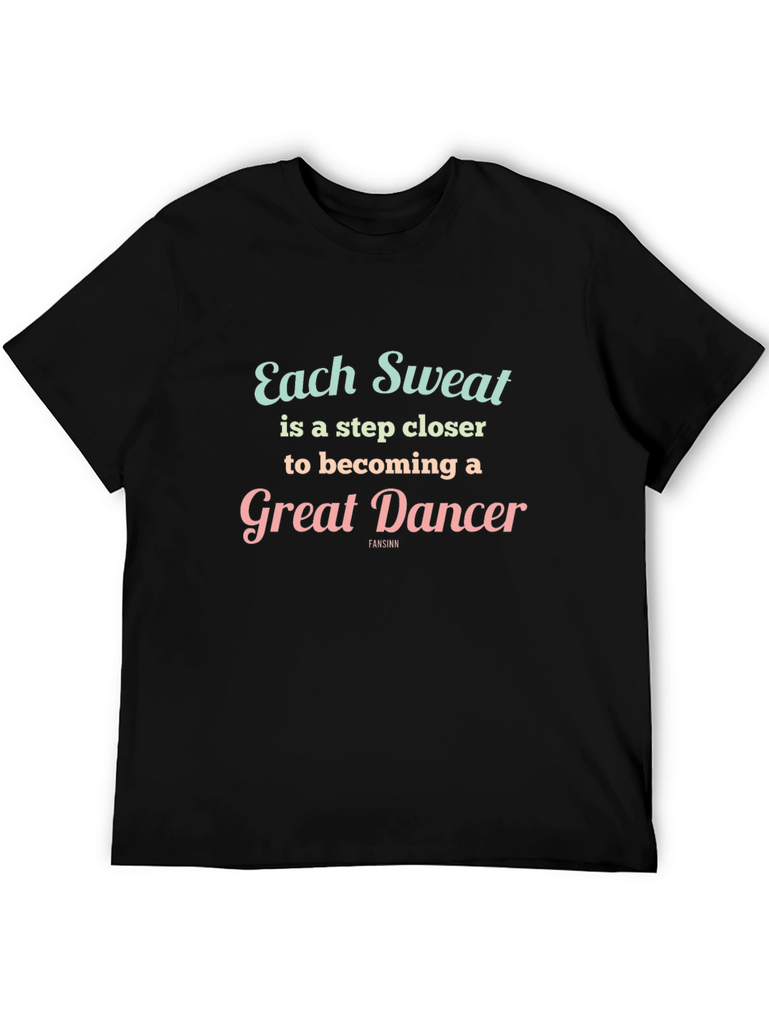 This stylish black t-shirt features an inspirational quote for dancers. The design incorporates the phrase 'Each Sweat is a step closer to becoming a Great Dancer' in an appealing turquoise and pink font combination. Made from a comfortable-looking fabric, this casual tee is perfect for dance enthusiasts and athletes. Wear it to dance practice, the gym, or as a motivational everyday outfit. The design’s uplifting message makes it a great gift for anyone passionate about dance and fitness.