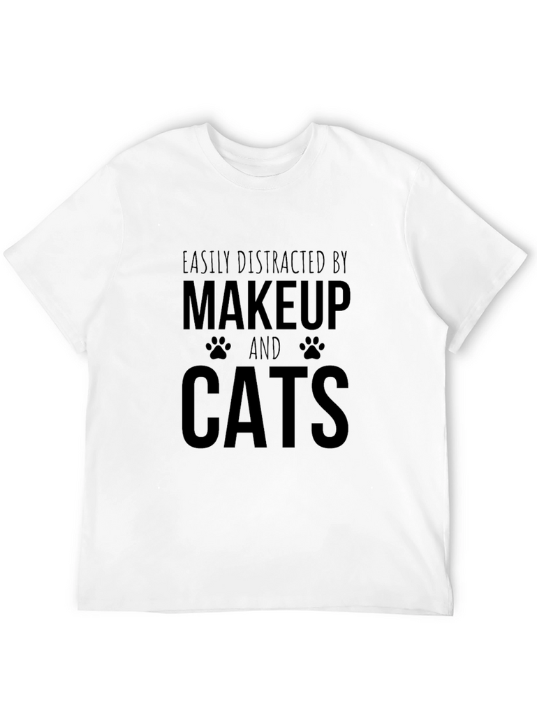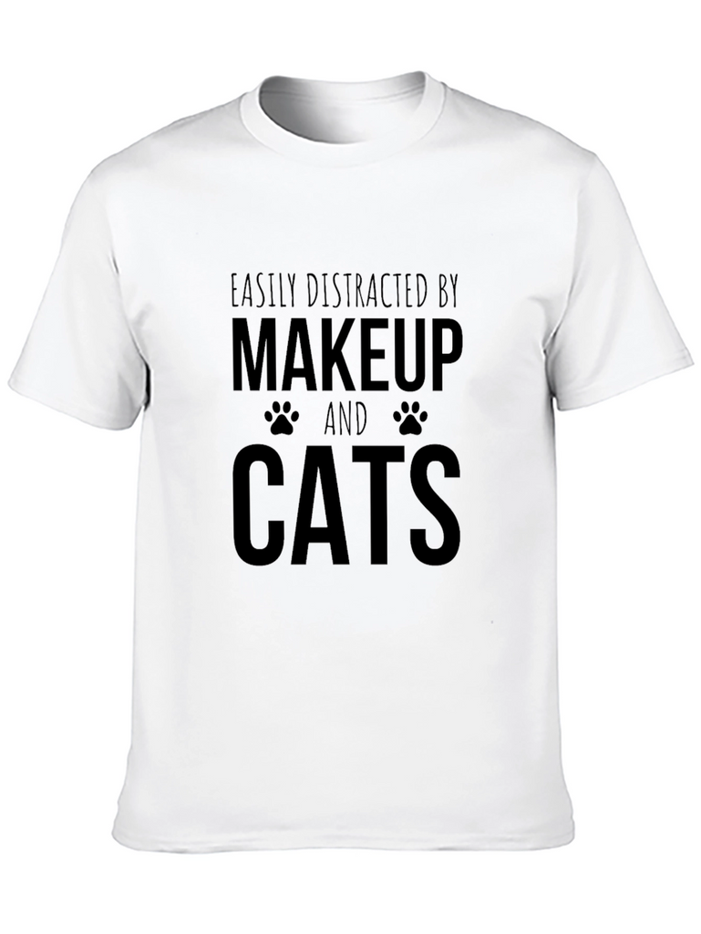This black t-shirt is perfect for the makeup and cat lover in your life. The shirt features the phrase "Easily Distracted By Makeup and Cats" in a bold, easy-to-read font, with two cat paw prints between the words "makeup" and "and". This t-shirt is sure to turn heads and spark conversations, whether you're out running errands or lounging at home with your feline friends. The classic fit and comfortable fabric make it an excellent wardrobe staple. A fun gift for birthdays or any occasion. Wear this shirt and let everyone know your passions!