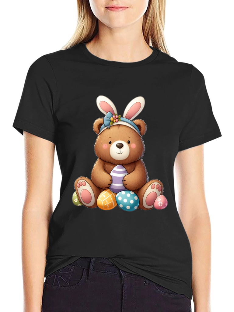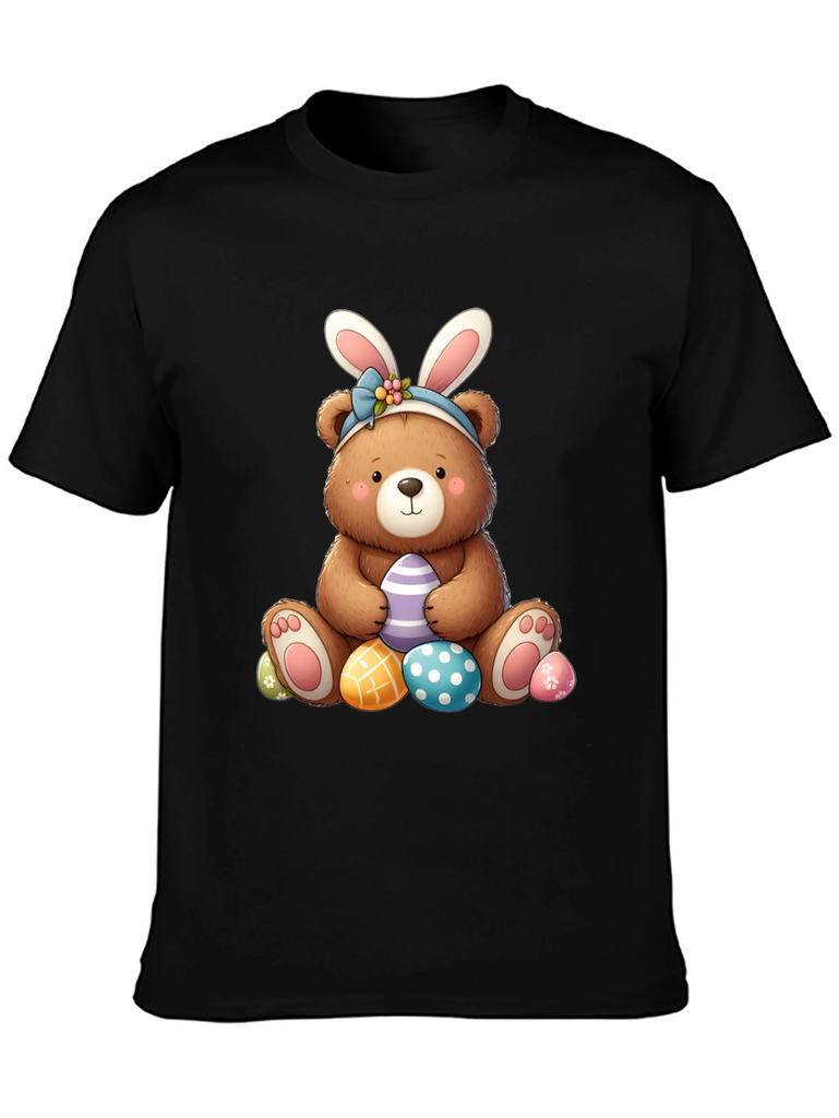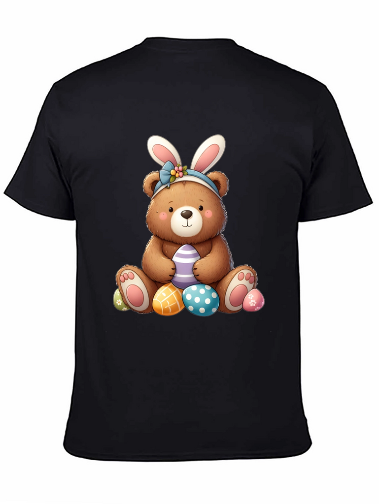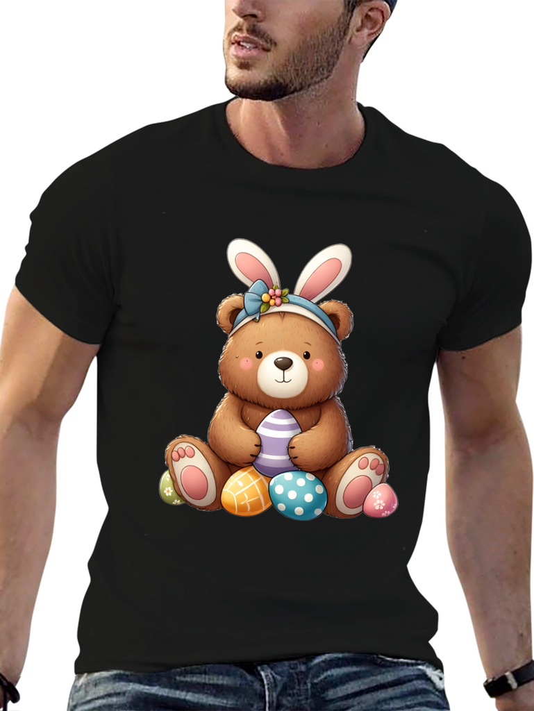 Celebrate Easter in style with this adorable black t-shirt featuring a charming bear wearing bunny ears. The cute bear graphic is surrounded by colorful Easter eggs, perfect for adding a touch of holiday cheer to your wardrobe. Made from soft, comfortable fabric, this t-shirt is ideal for casual wear, Easter egg hunts, or family gatherings. The playful design is sure to bring a smile to everyone's face and makes a great gift for Easter lovers of all ages. Get ready to hop into the Easter spirit with this fun and festive tee!